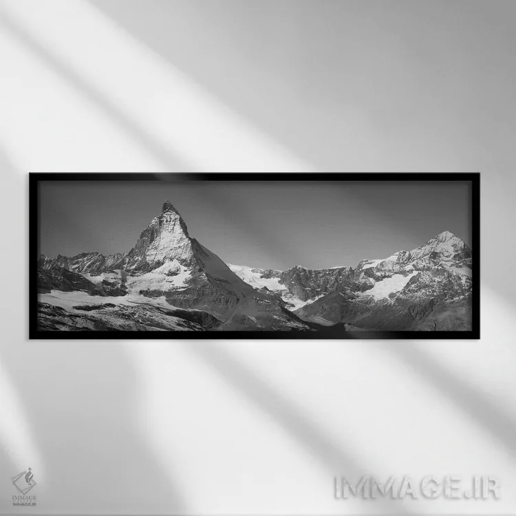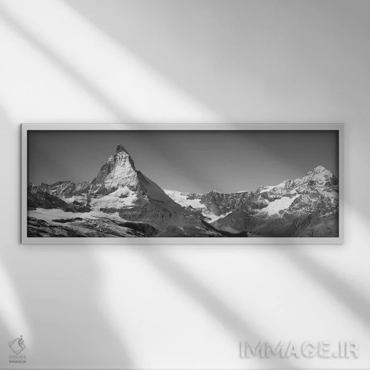 «ماترهورن، سوئیس» اثرِ «پانورامیک ایمجز (استودیو عکاسی عریض)» با بیان سیاهوسفید، کنار دیوارهای روشن و قابهای ساده بسیار خوشفرم دیده میشود؛ موضوعِ این اثر هم خوانا میماند.