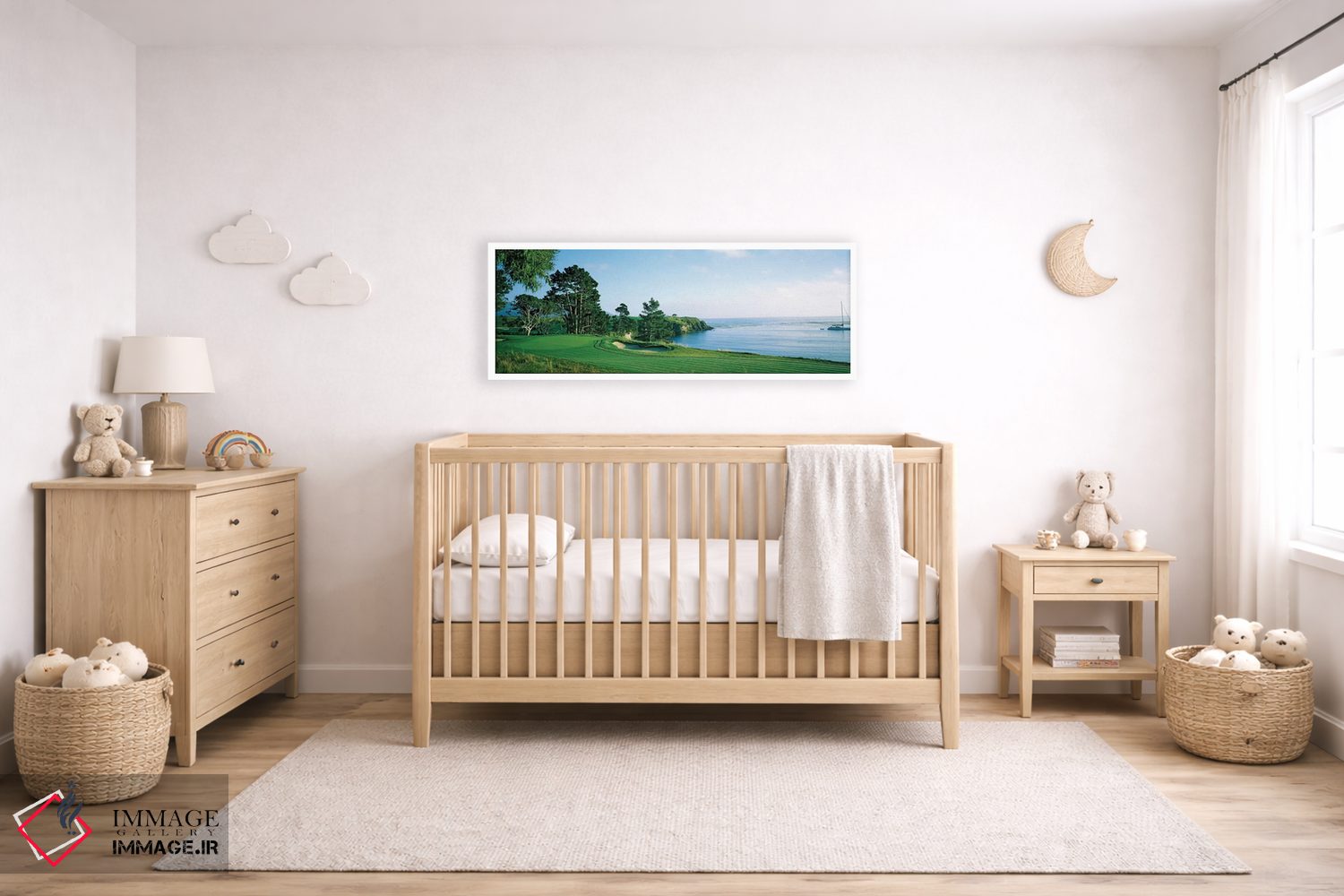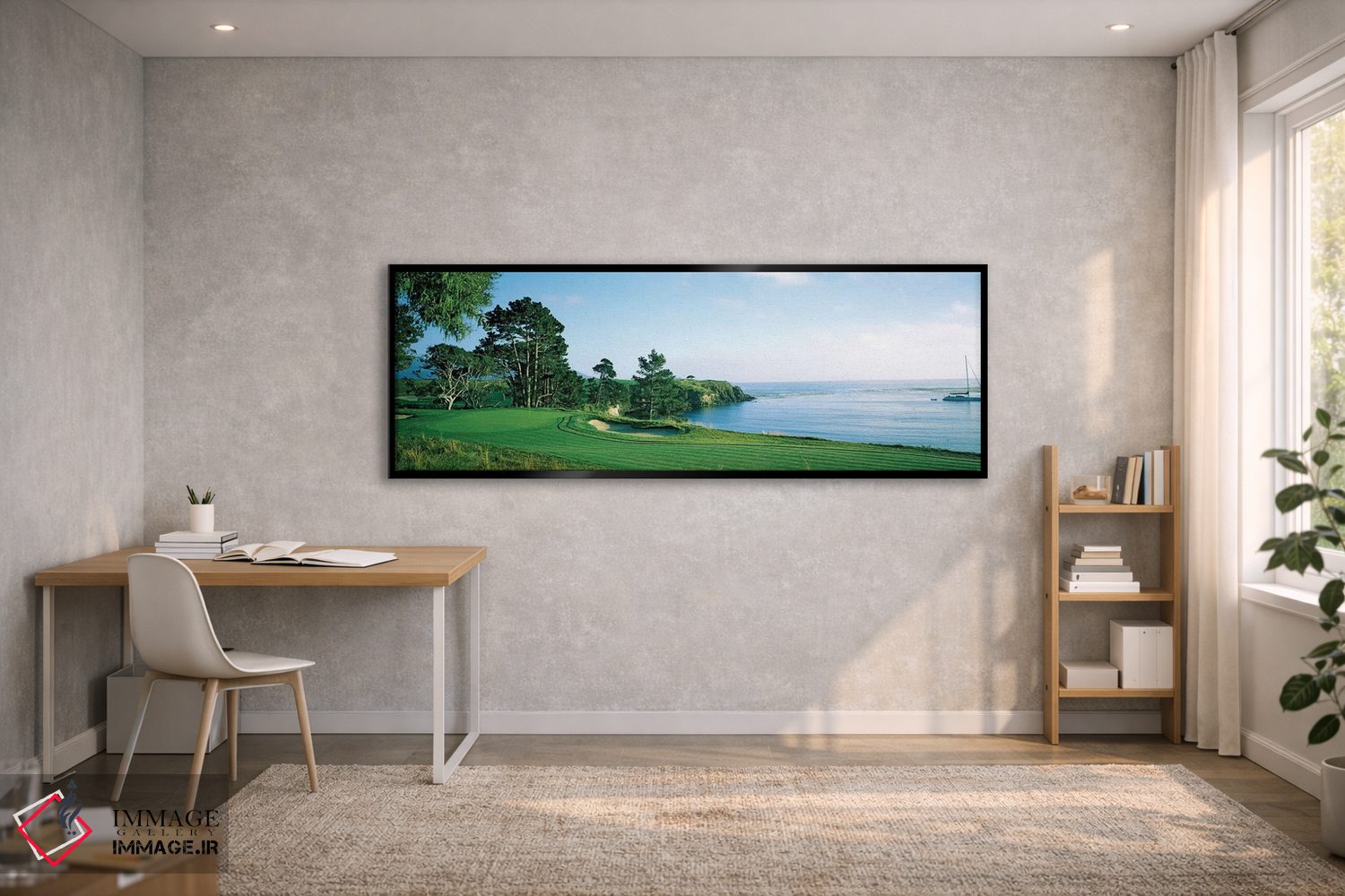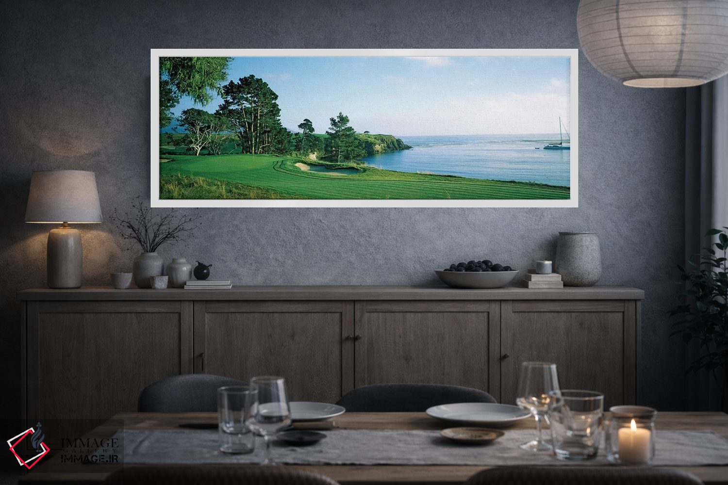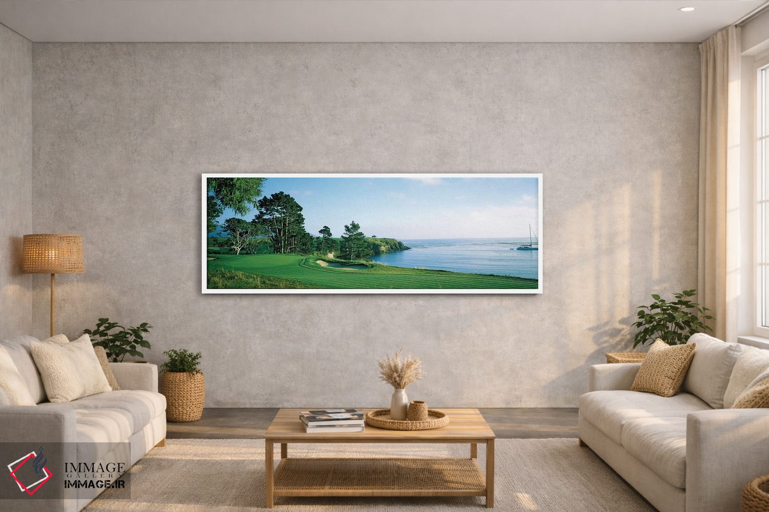 در این اثر، «زمین گلف پبل بیچ، پبل بیچ، شهرستان مونتری، کالیفرنیا، ایالات متحده آمریکا» اثرِ «پانورامیک ایمجز (استودیو عکاسی عریض)» سلیقهٔ صاحبخانه را بیاغراق نشان میدهد؛ برای فضاهای مدرن با خطوط ساده پیشنهاد میشود. با مبلمان خنثی، تضاد دلنشینی میسازد.