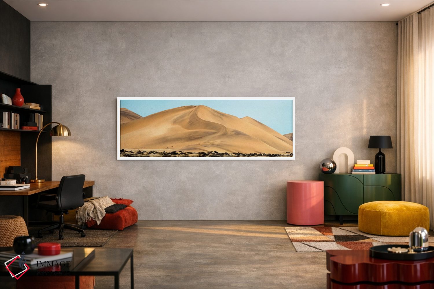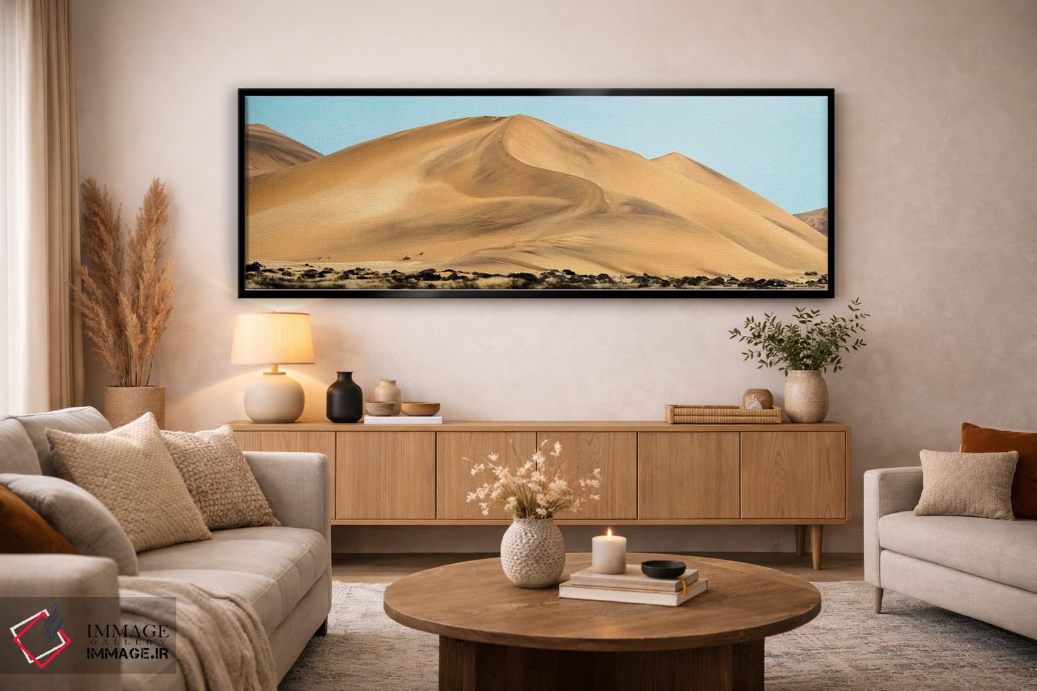برای فضایی که میخواهید مرتبتر و حرفهایتر دیده شود، «Walvis Bay، Namibia"—"منظر بیابانی، خلیج والویس، نامیبیا"» اثرِ «پانورامیک ایمجز (استودیو عکاسی عریض)» تضادهای رنگی را خوشقوارهتر میکند؛ برای فضاهای کمنور که به «نقطهٔ روشن» نیاز دارند پیشنهاد میشود. برای ترکیب با چوب، سنگ یا فلز، انتخابی دقیق است.