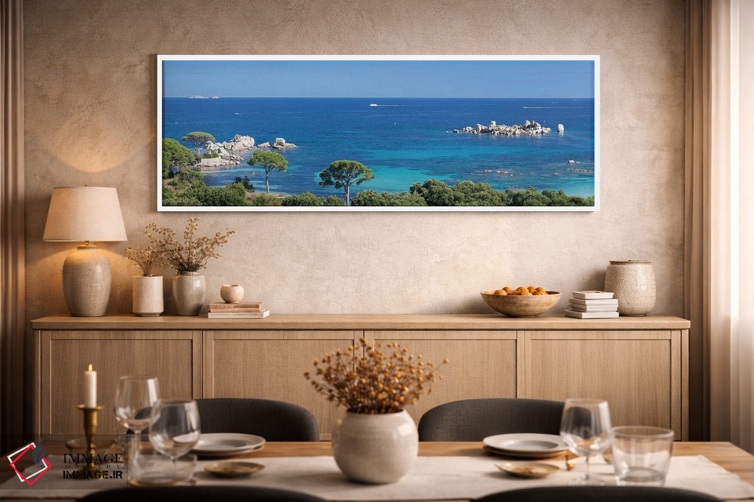 در این اثر، «Porto Vecchio، Corse—du—Sud، Corsica، France"—"ساحل پالموژیا، پورتو وکیو، کورس—دو—سود، کُرسیکا، فرانسه"» اثرِ «پانورامیک ایمجز (استودیو عکاسی عریض)» یک حس «تمامشده و پرداختشده» ایجاد میکند؛ برای فضاهایی که میخواهید مرکز توجه داشته باشند پیشنهاد میشود. جزئیاتش نزدیکِ کار هم ارزش نگاه دارد.
