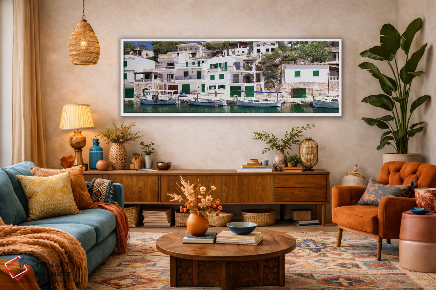 در این اثر، «Cala Figuera، Santanyi، Majorca، Balearic Islands، Spain"—"ملک ساحلی، کاله فیگورا، سانتانی، مایورکا، جزایر بالئاریک، اسپانیا"» اثرِ «پانورامیک ایمجز (استودیو عکاسی عریض)» اتاق را جمعوجورتر و مرتبتر نشان میدهد؛ برای دیوار بالای کنسول یا شومینه پیشنهاد میشود. به دیوار حس «تمامشده» میدهد.