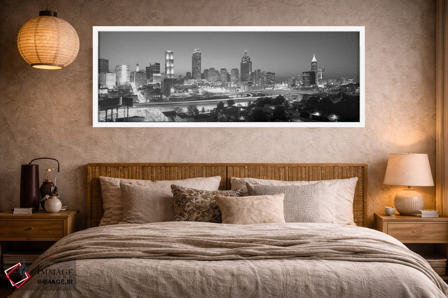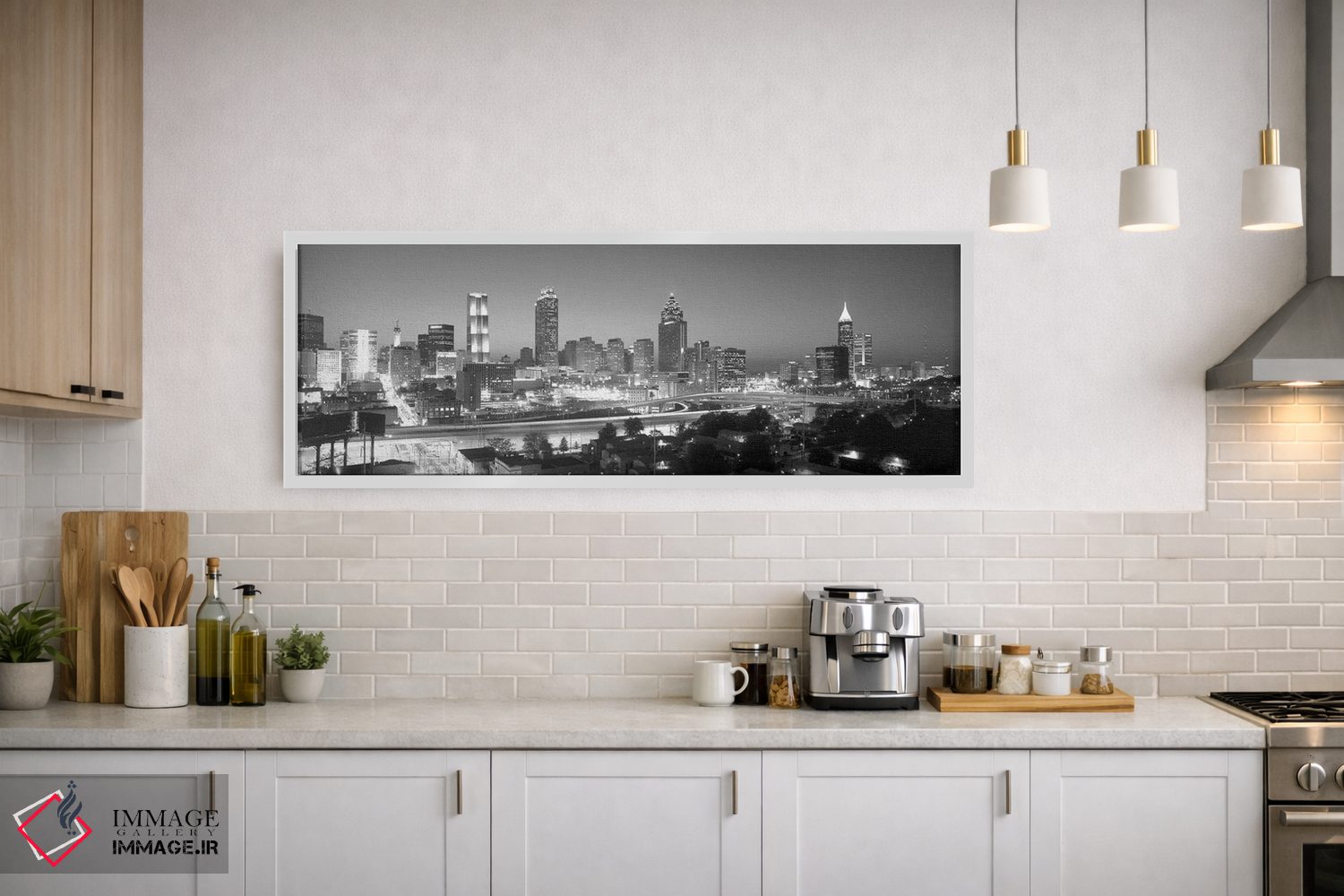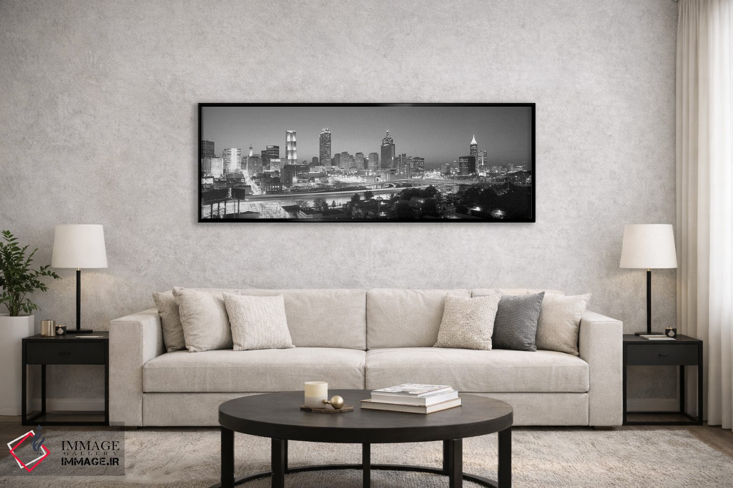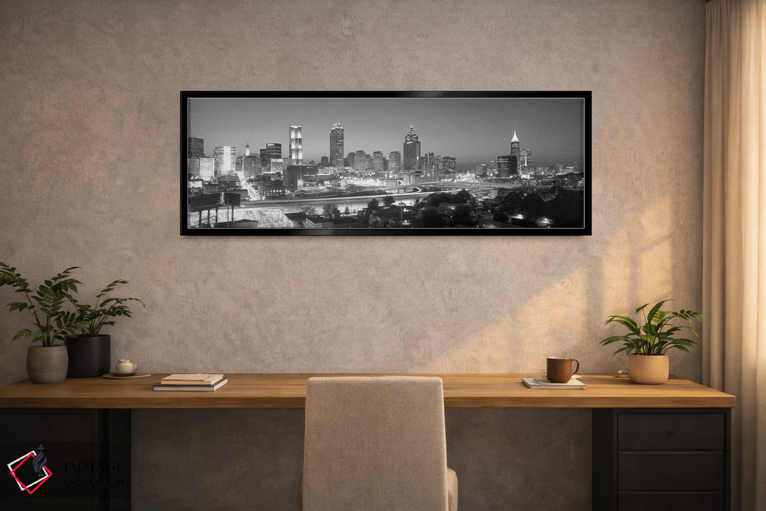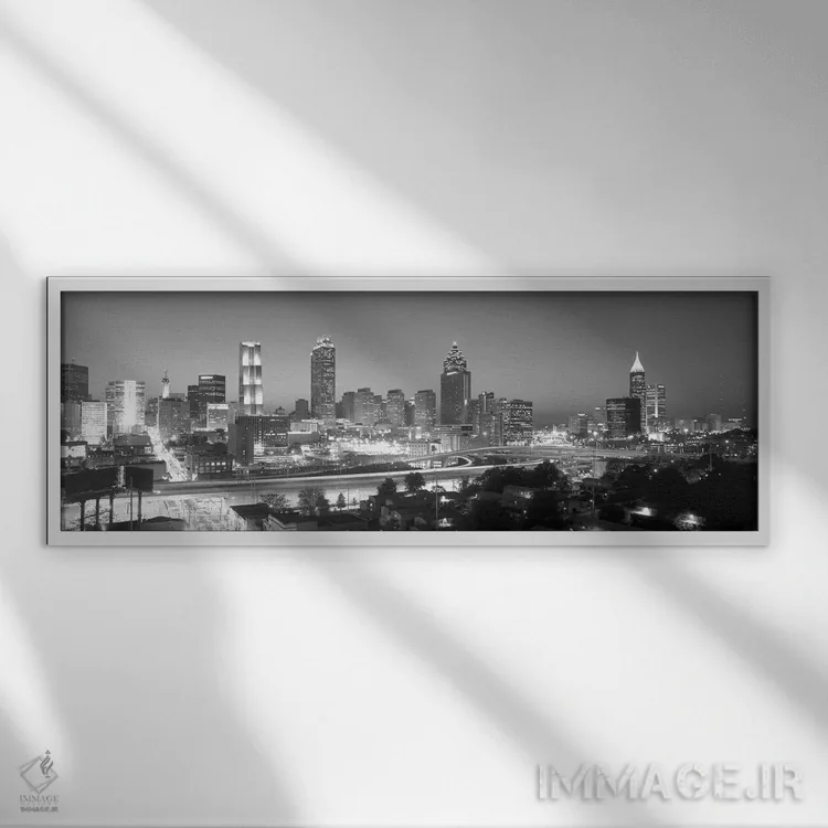 «Atlanta، Fulton County، Georgia، USA"—"آسماننمای مرکز شهر به رنگ خاکستری، آتلانتا، شهرستان فولتن، جورجیا، ایالات متحده"» اثرِ «پانورامیک ایمجز (استودیو عکاسی عریض)» با بیان سیاهوسفید، کنار دیوارهای روشن و قابهای ساده بسیار خوشفرم دیده میشود؛ موضوعِ این اثر هم خوانا میماند.
