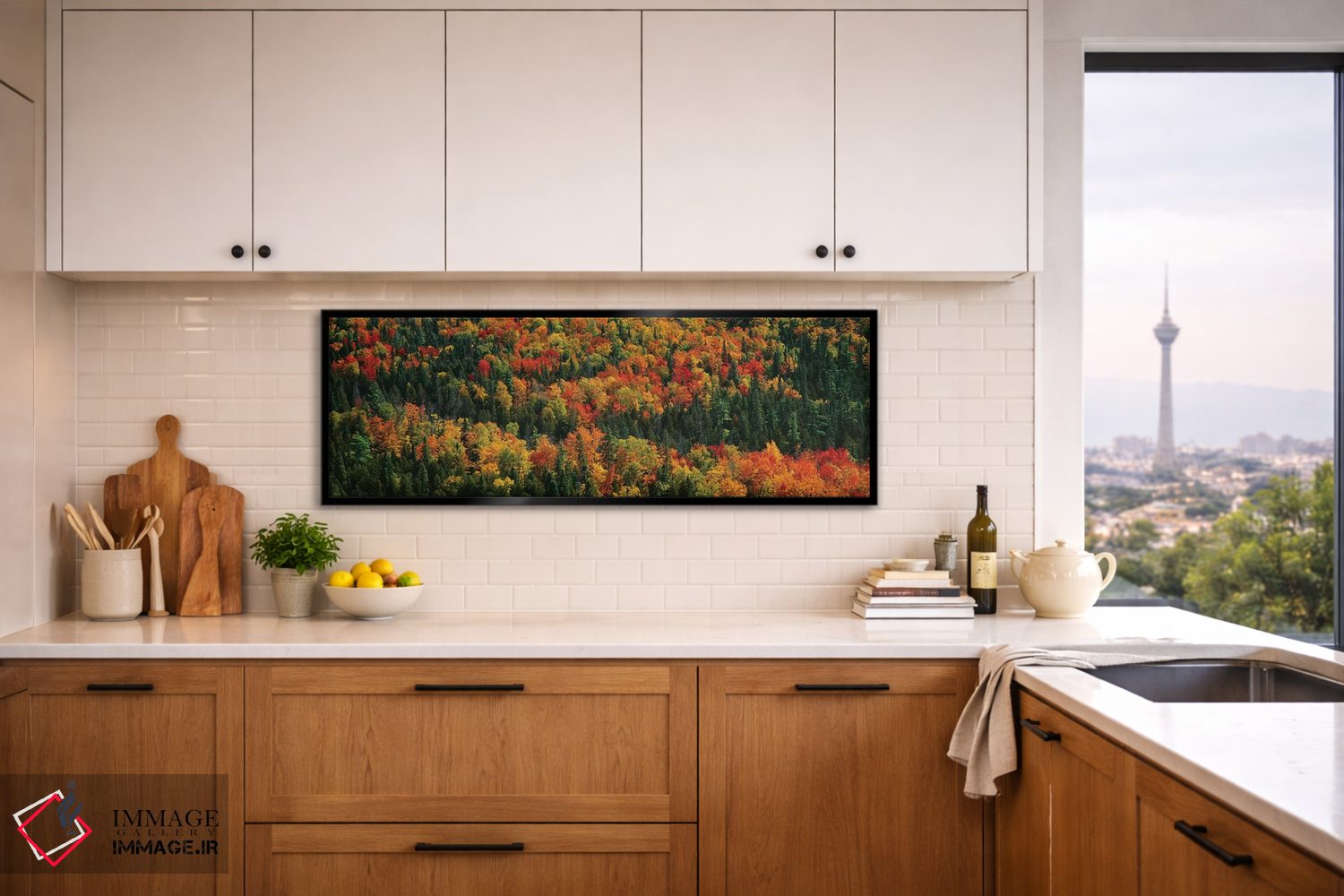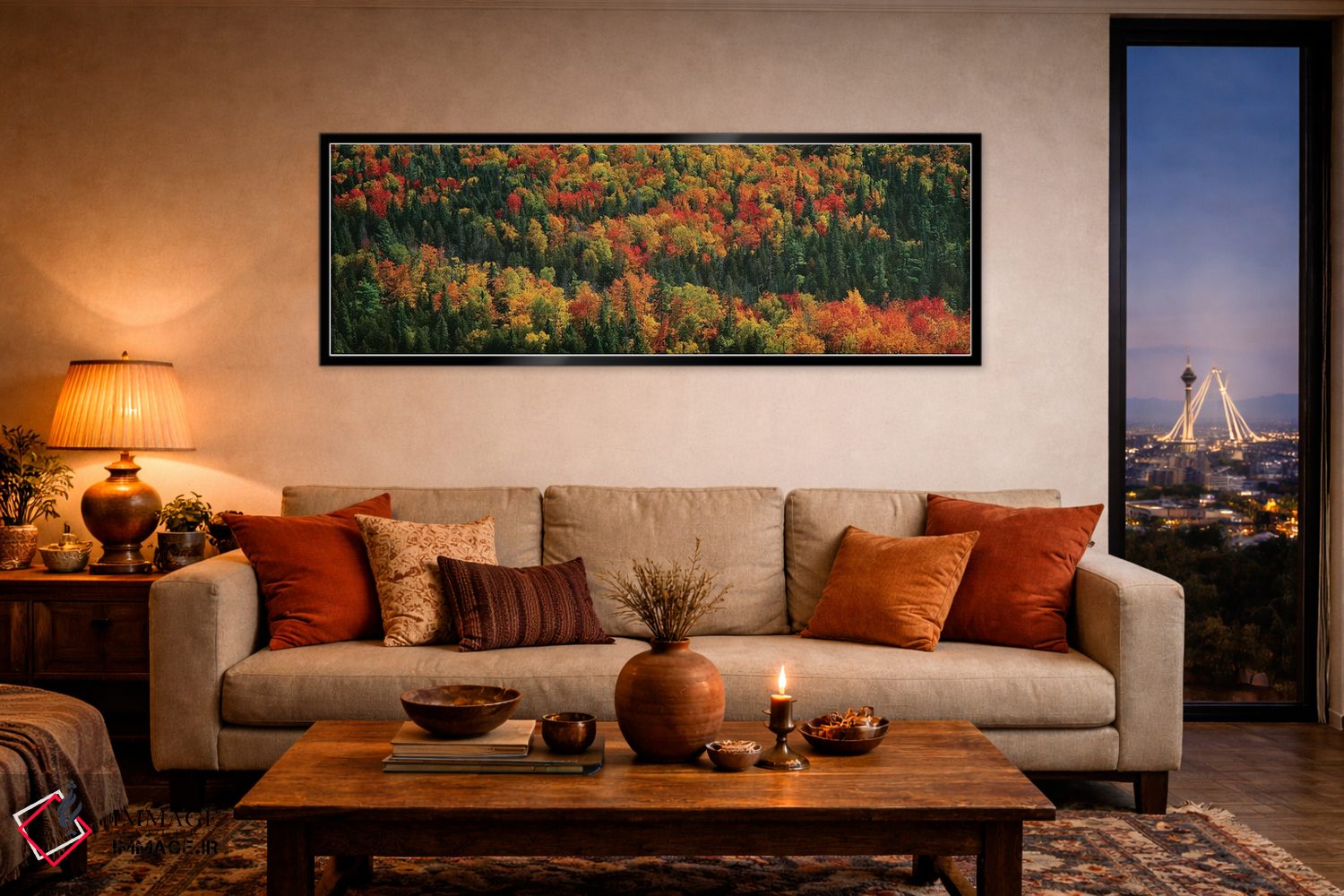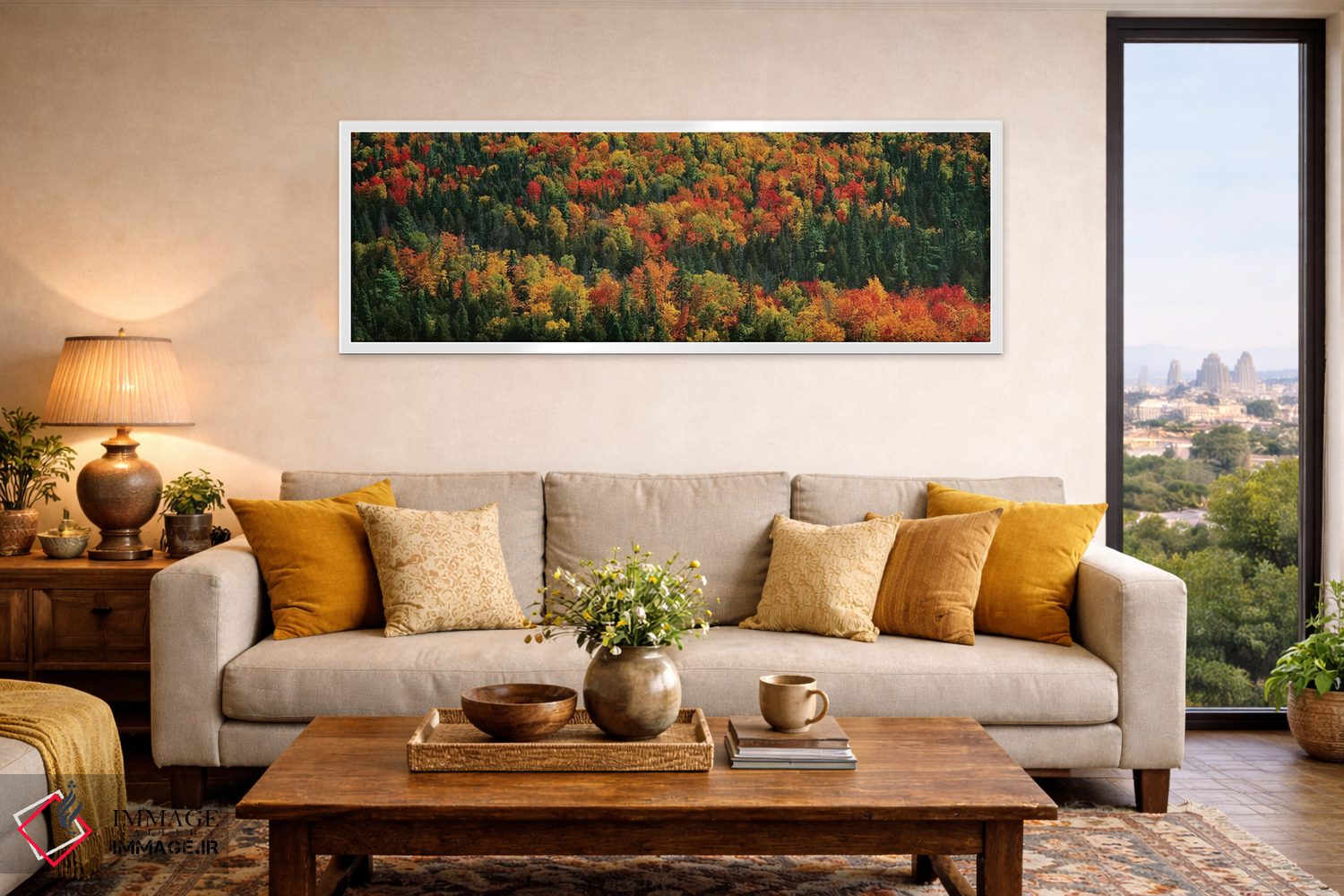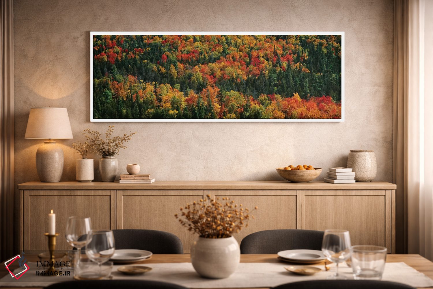 برای خانههایی که به زیباییِ آرام علاقه دارند، «"منظره پاییزی دوم، پارک ایالتی مناطق وحشی کوههای خوک، شبهجزیره بالایی، میشیگان، ایالات متحده آمریکا"» اثرِ «پانورامیک ایمجز (استودیو عکاسی عریض)» تضادهای رنگی را خوشقوارهتر میکند؛ برای خانههایی که به هماهنگی رنگها اهمیت میدهند پیشنهاد میشود. اگر میخواهید یک اثر همیشه «بهروز» بماند، انتخاب خوبیست.