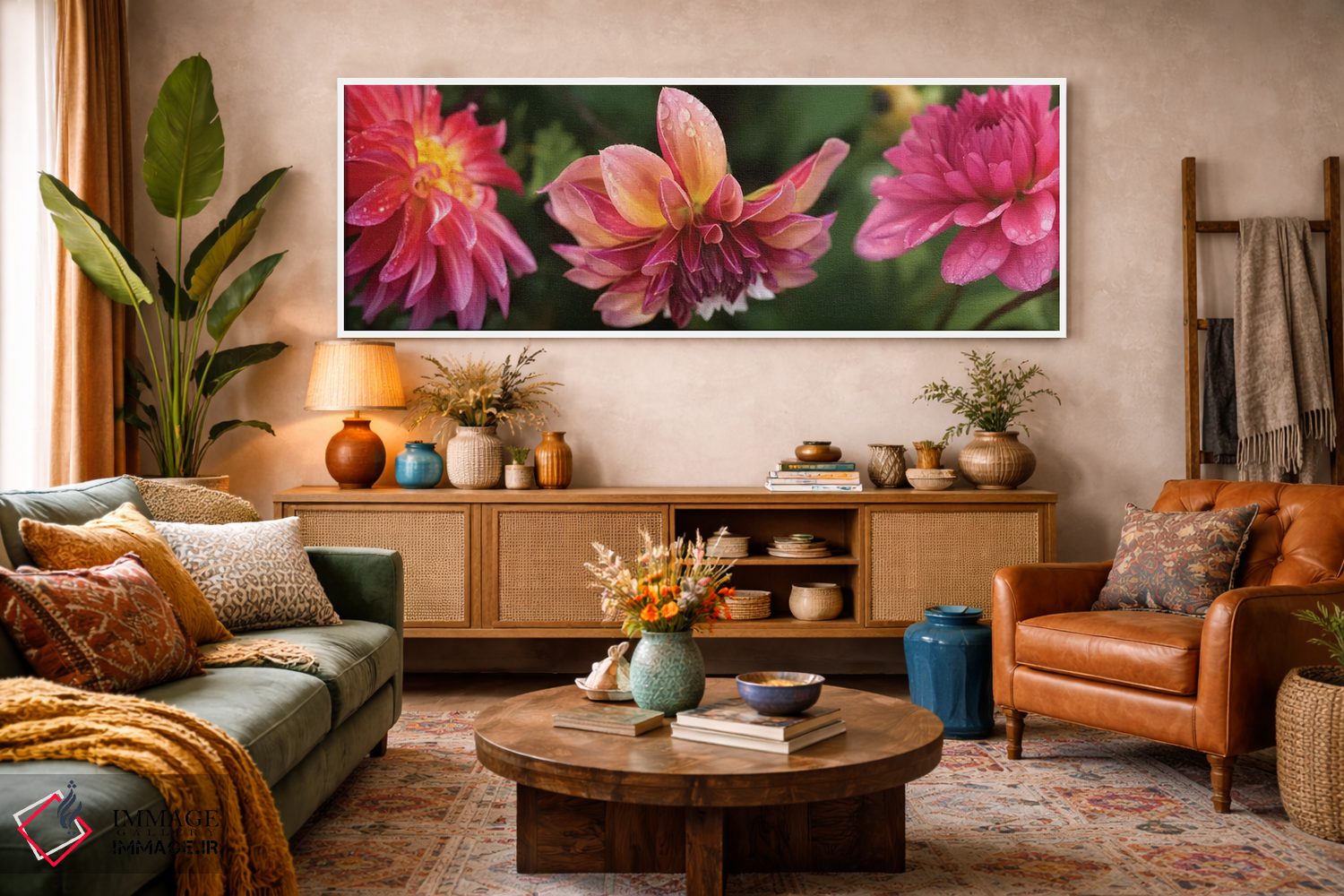 برای فضاهایی که به لطافت نیاز دارند، «"نمای نزدیک گلهای داهلیا در حال شکوفایی روی گیاه I"» اثرِ «پانورامیک ایمجز (استودیو عکاسی عریض)» تعادل رنگیِ لطیفی به چیدمان میدهد؛ برای راهروهای مینیمال انتخابی خوشسلیقه است. اگر دنبال «زیباییِ بیصدا» هستید، این اثر همان حس را دارد.