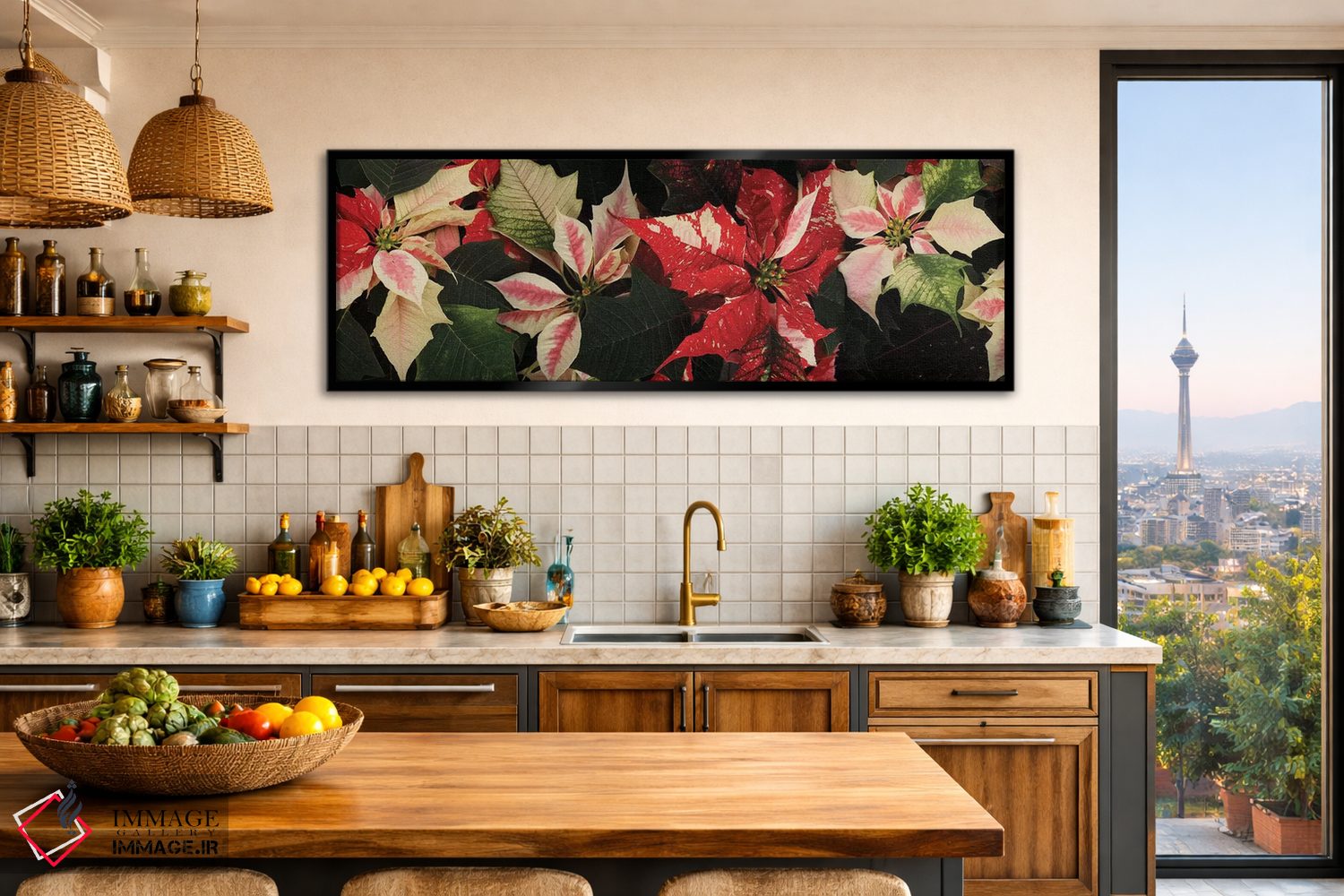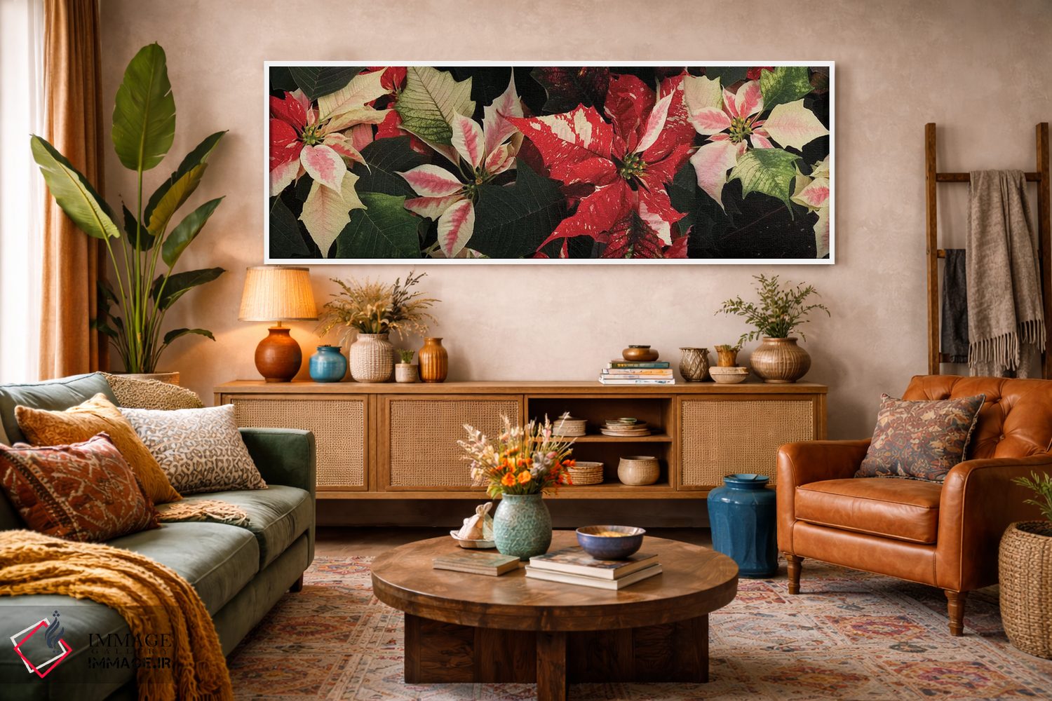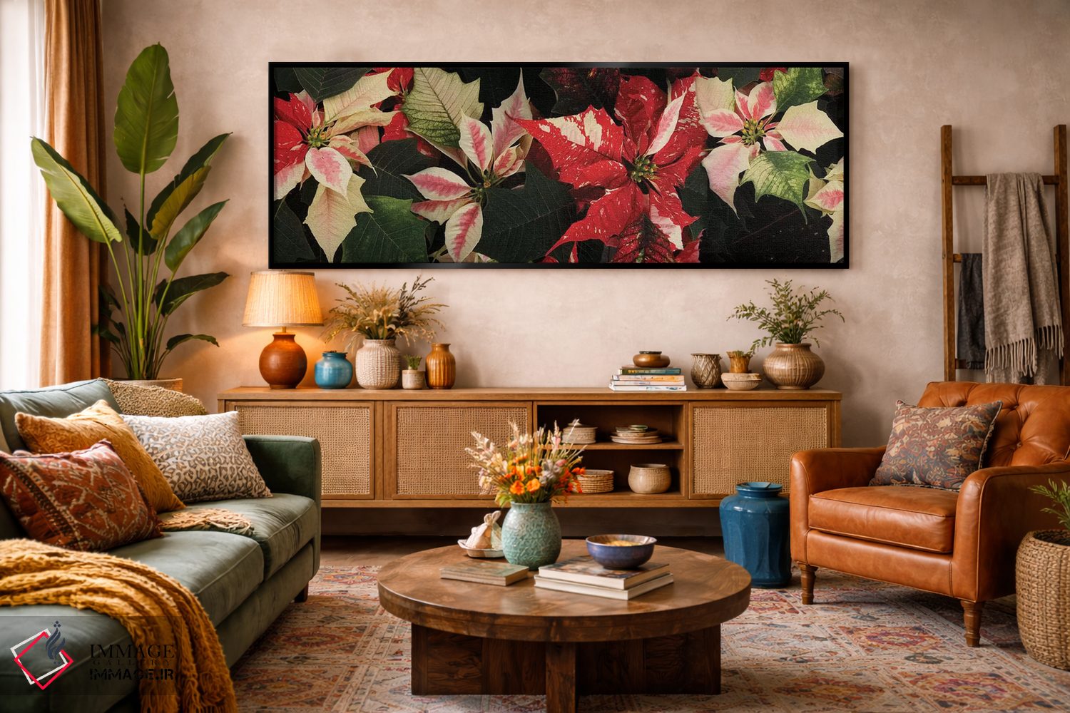 برای دیواری که میخواهید نرمتر دیده شود، «گلهای پوانستیا نزدیک V» اثرِ «پانورامیک ایمجز (استودیو عکاسی عریض)» حس طراوت را بدون شلوغی وارد اتاق میکند؛ برای فضاهای بوهمی انتخابی خوشسلیقه است. فضا را شلوغ نمیکند؛ فقط لطیفترش میکند.