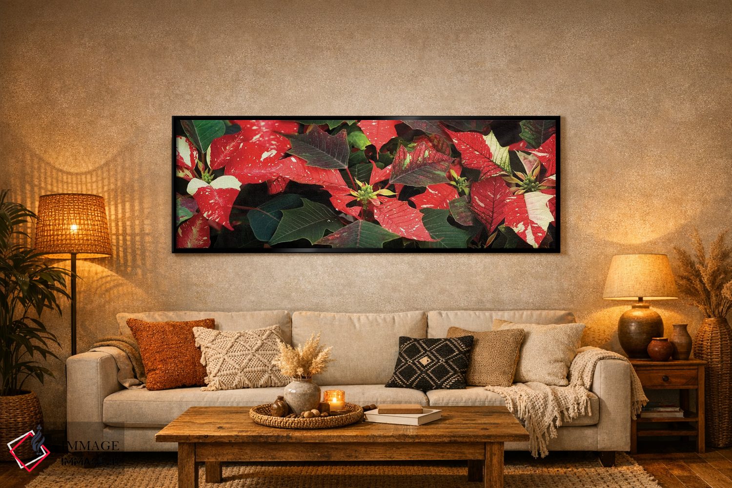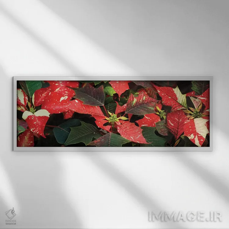 «گلهای پوانستیا نزدیک VI» اثرِ «پانورامیک ایمجز (استودیو عکاسی عریض)» میتواند حس طراوت را بدون شلوغی وارد اتاق کند؛ برای فضاهای بوهمی پیشنهاد میشود. حضورش آرام است، اما بیاثر نیست.