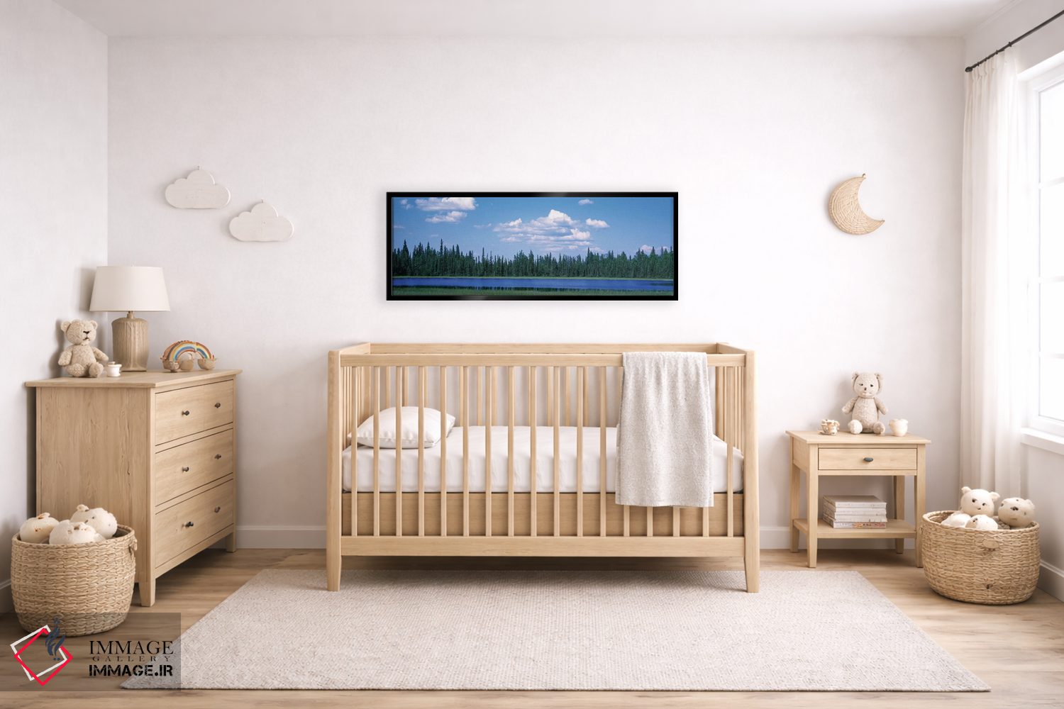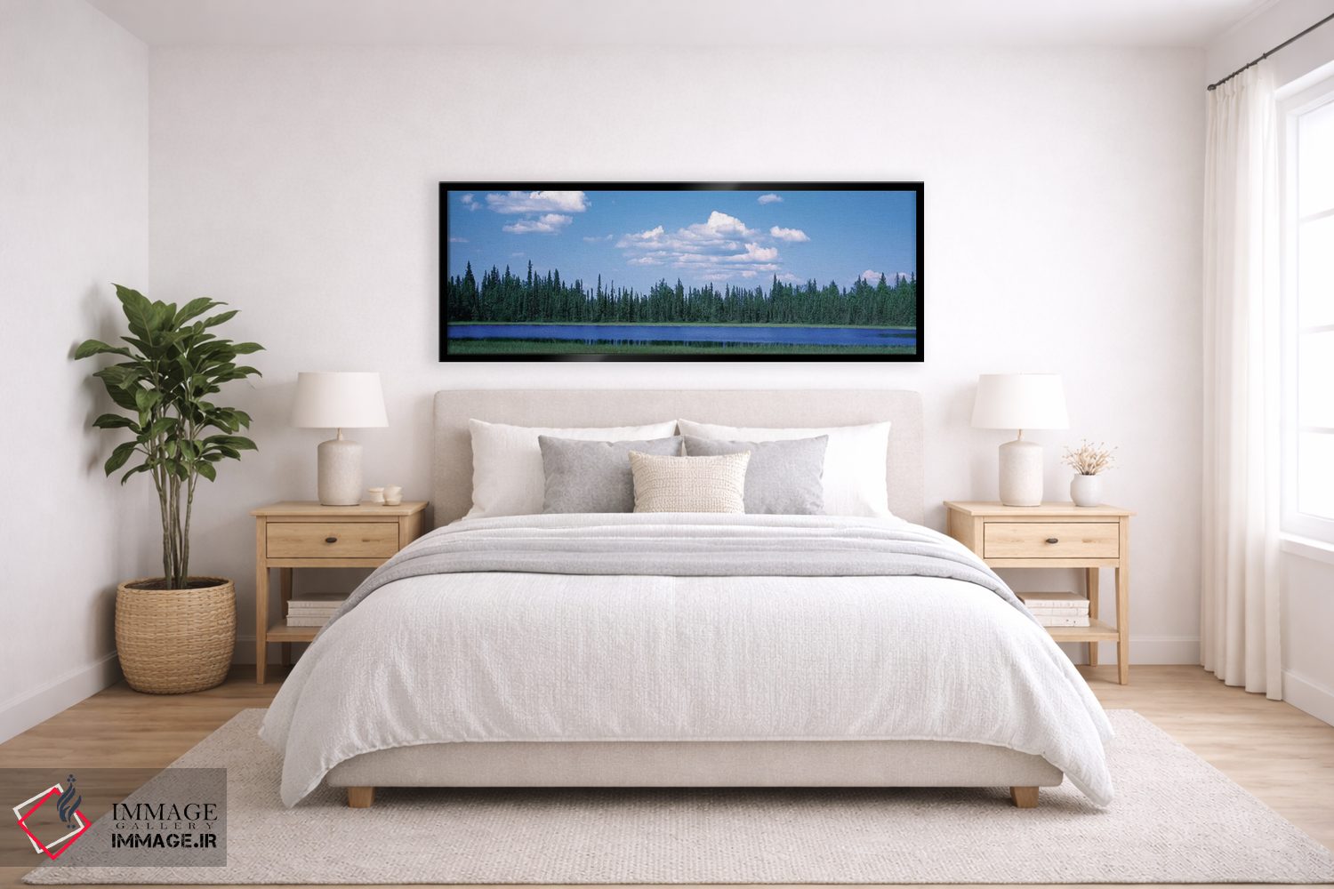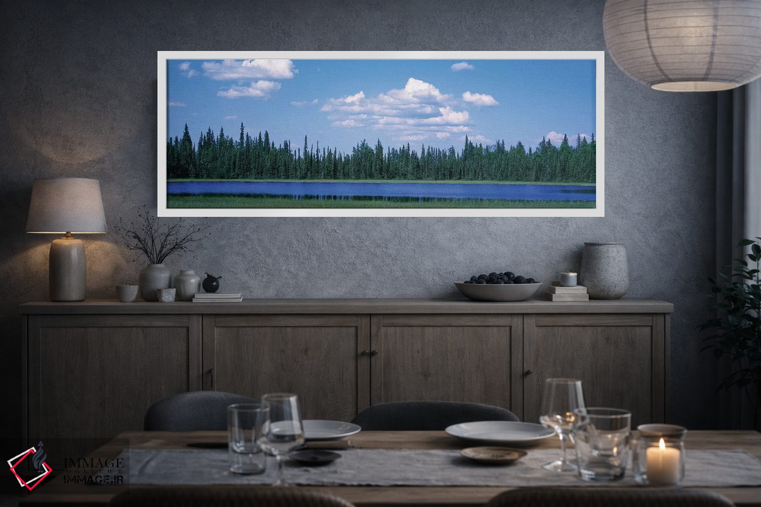 در این اثر، «Alaska، USA"—"درختان در کنار دریاچه، آلاسکا، ایالات متحده"» اثرِ «پانورامیک ایمجز (استودیو عکاسی عریض)» ریتم فضا را منظم میکند؛ برای خانههایی که به هماهنگی رنگها اهمیت میدهند پیشنهاد میشود. برای فضاهایی که دنبال «وقار» هستند، انتخابی مطمئن است.