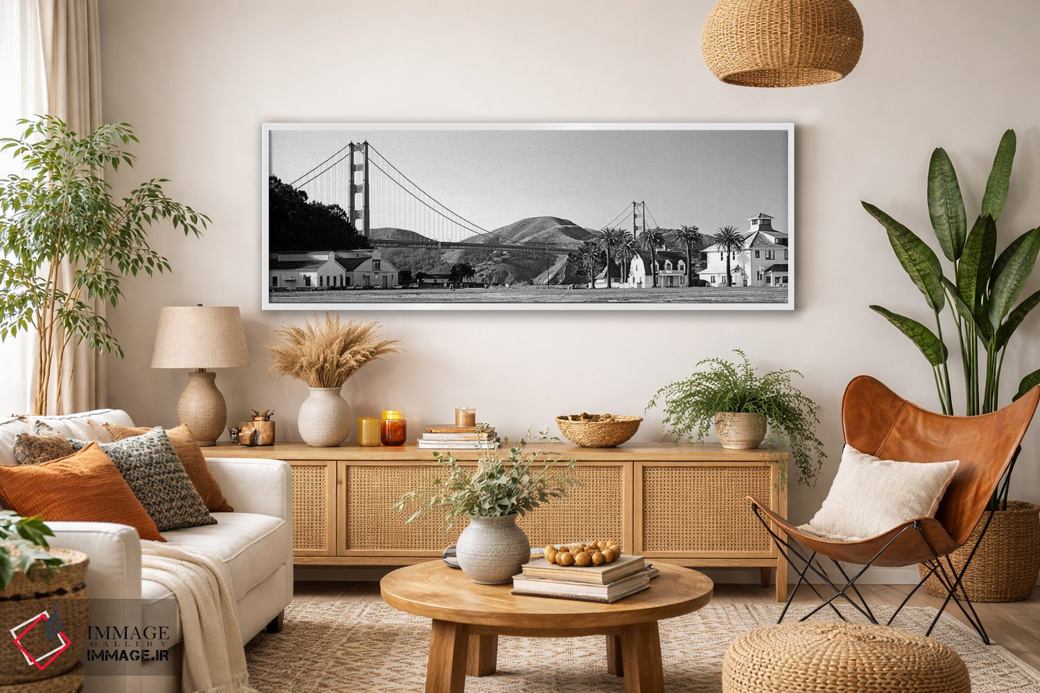 اگر دنبال یک قاب رسمی و تمیز هستی، «"پل دیدهشده از یک پارک، پل گلدن گیت، کریسی فیلد، سان فرانسیسکو، کالیفرنیا، ایالات متحده"» اثرِ «پانورامیک ایمجز (استودیو عکاسی عریض)» با موضوعِ این اثر در عکاسی سیاهوسفید انتخابی مطمئن است.