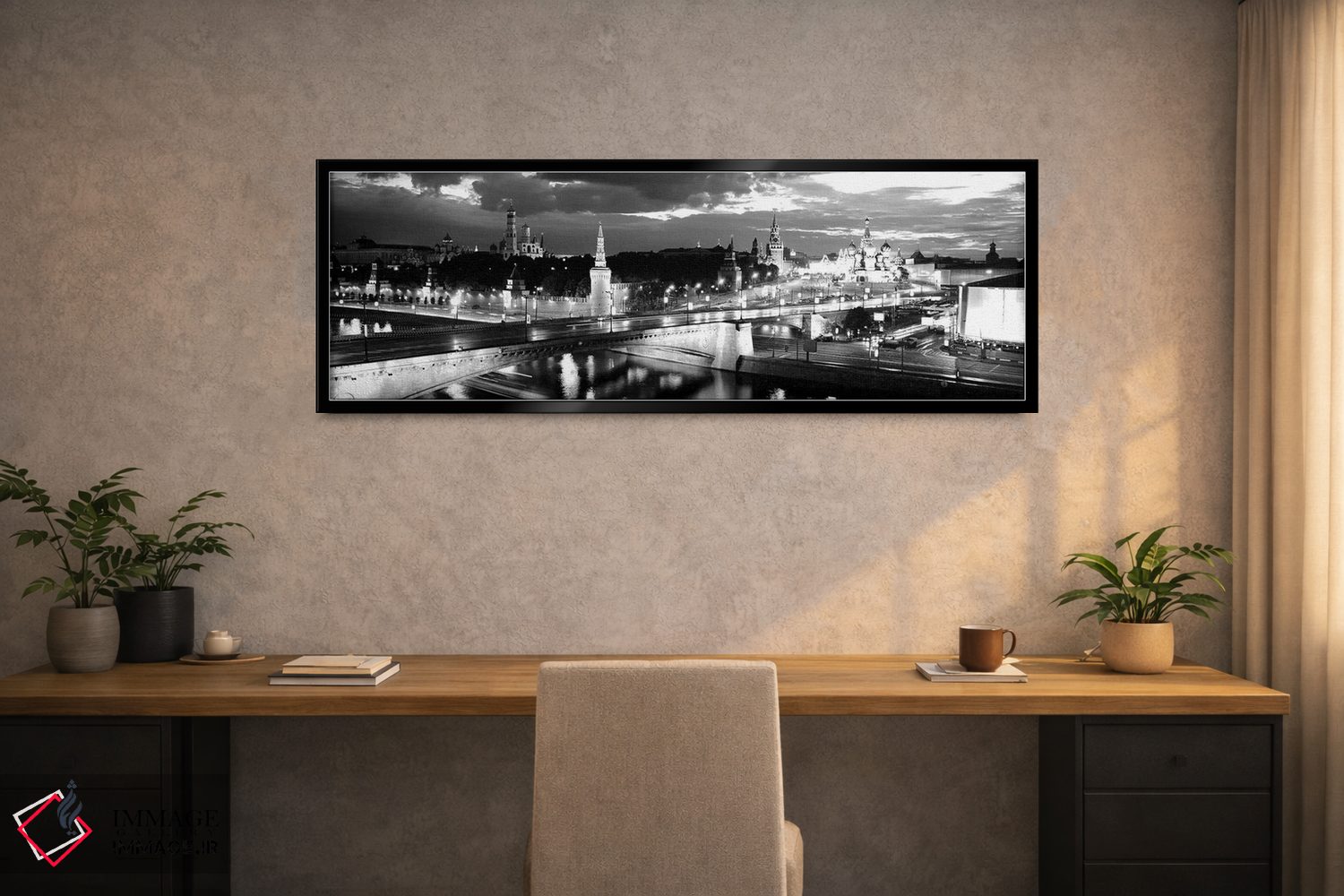 این اثرِ «پانورامیک ایمجز (استودیو عکاسی عریض)» با لحن سیاهوسفید، فضا را شیک و مرتب نشان میدهد؛ مناسبِ پذیراییهای مدرن و دفتر کار.