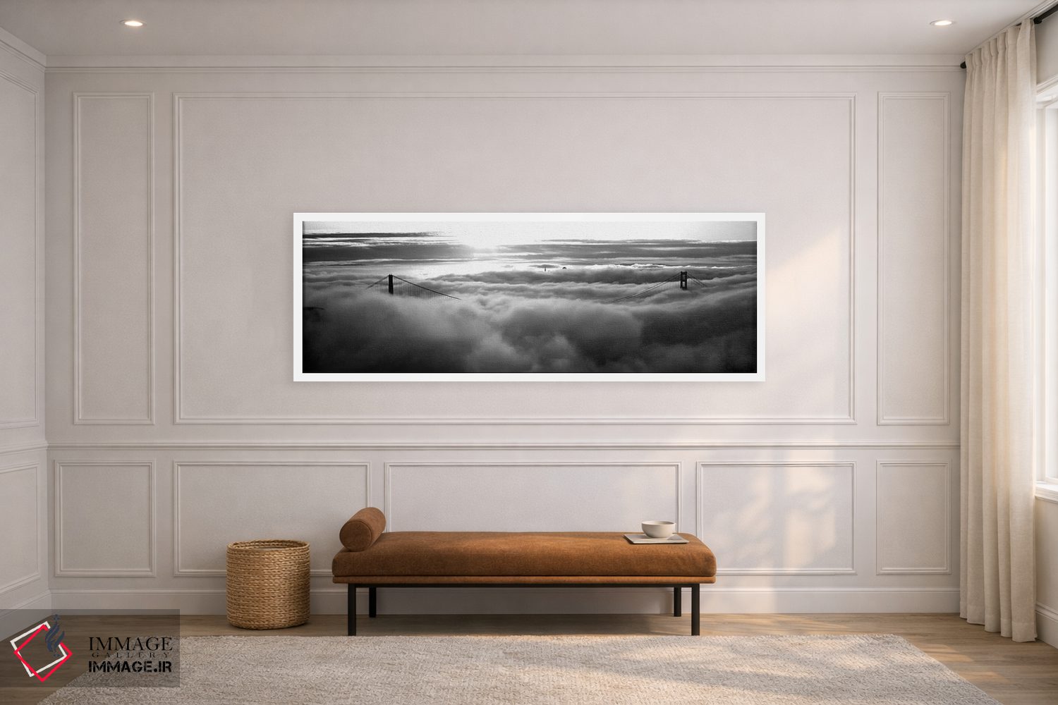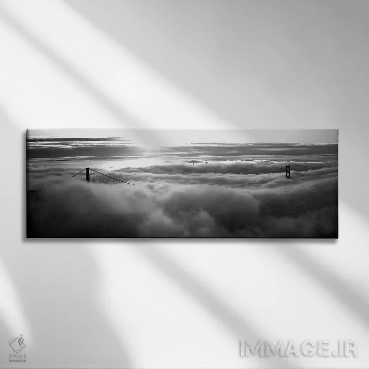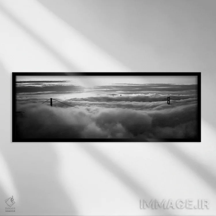 در «"پل گلدن گیت پوشیده از مه دیدهشده از تپه هاوک، خلیج سان فرانسیسکو، سان فرانسیسکو، کالیفرنیا، ایالات متحده"»، اثرِ «پانورامیک ایمجز (استودیو عکاسی عریض)» این اثر را با زبان سیاهوسفید ارائه میکند؛ برای دکورهای کلاسیک—مدرن یک انتخاب مطمئن و هماهنگپذیر است.