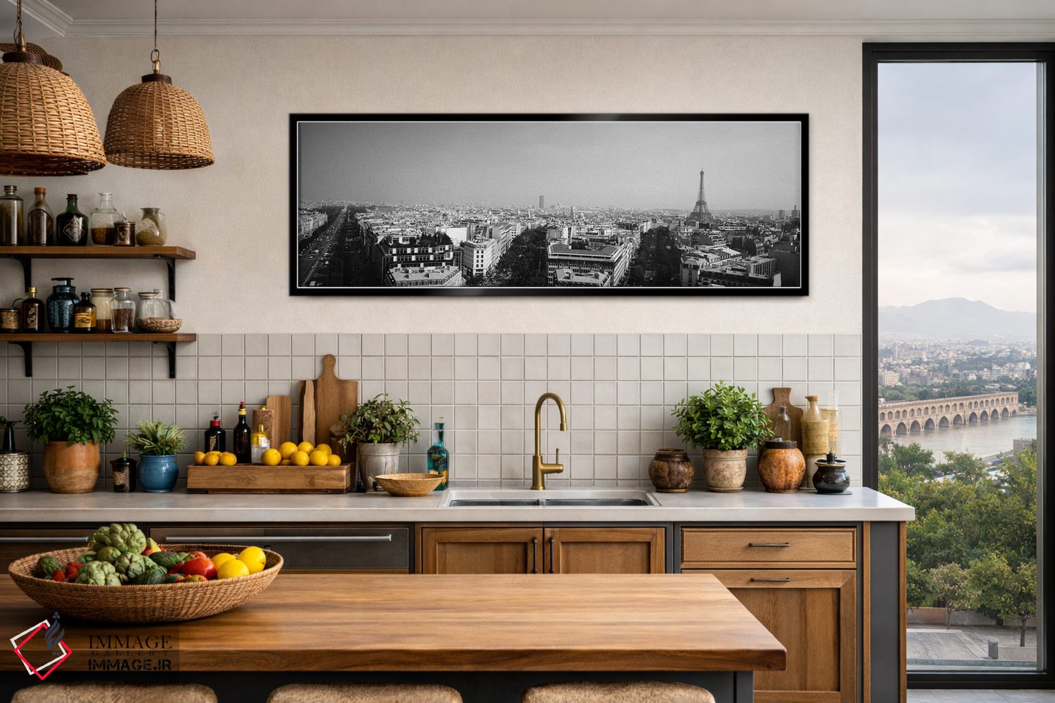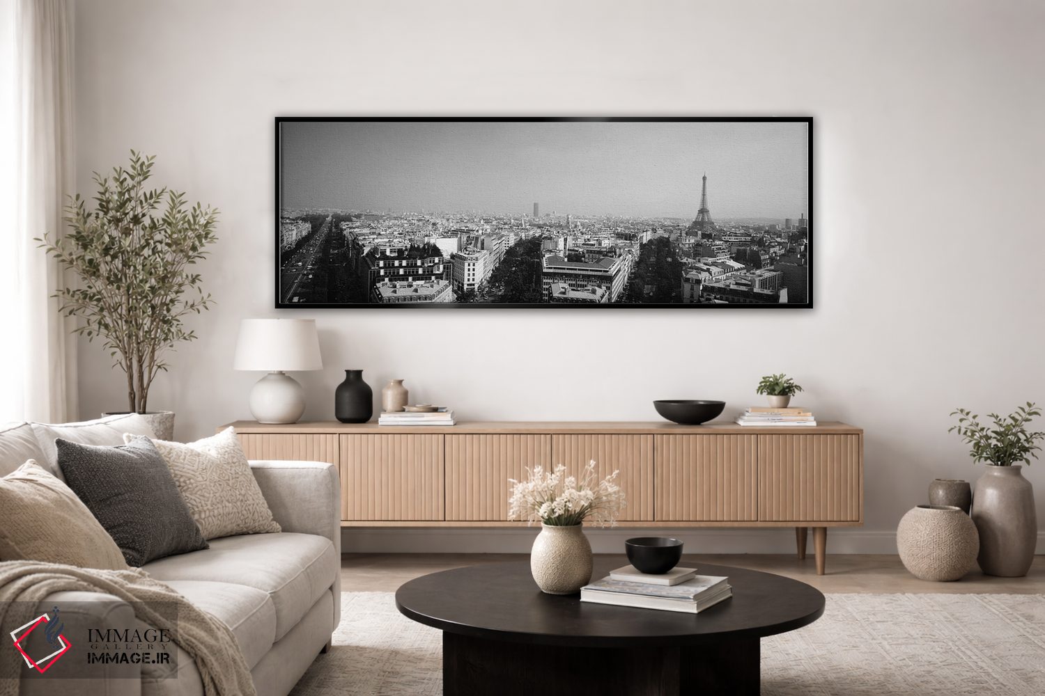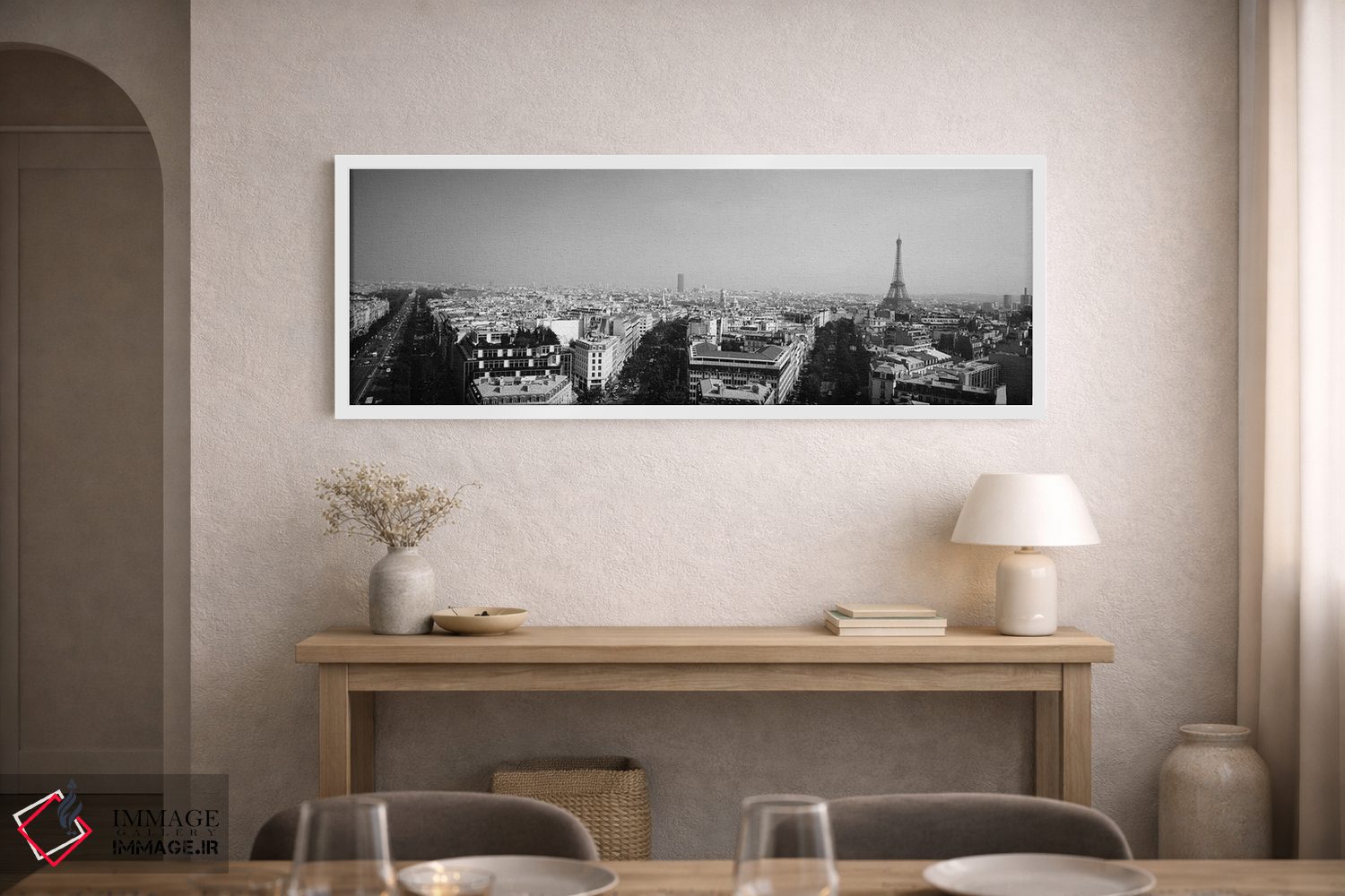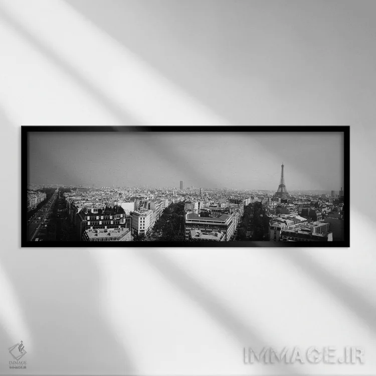 در «"نمای بلند از منظره شهری، پاریس، فرانسه"»، اثرِ «پانورامیک ایمجز (استودیو عکاسی عریض)» این اثر را با زبان سیاهوسفید ارائه میکند؛ برای دکورهای کلاسیک—مدرن یک انتخاب مطمئن و هماهنگپذیر است.