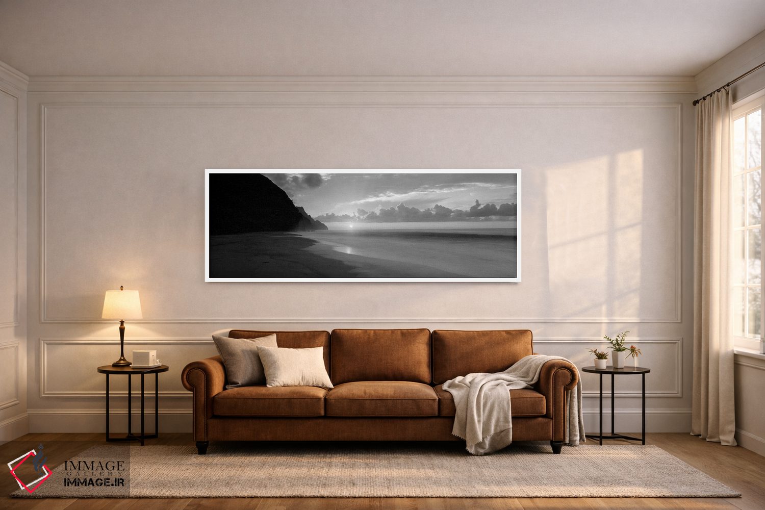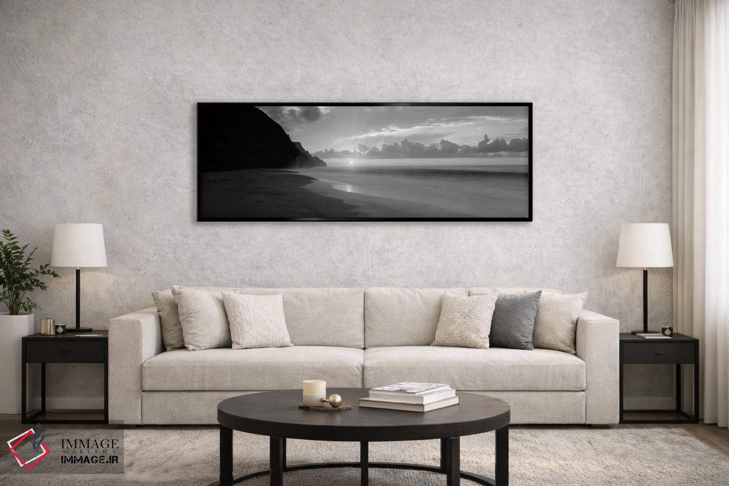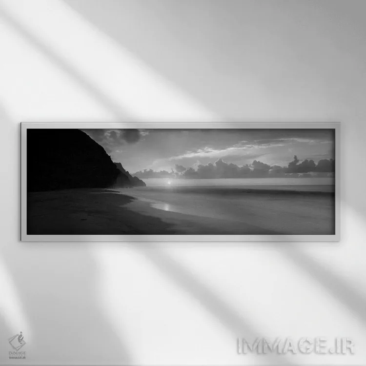 در «"غروب ساحل کلالاو، سواحل ناپالی، هاوایی، ایالات متحده"»، اثرِ «پانورامیک ایمجز (استودیو عکاسی عریض)» این اثر را با زبان سیاهوسفید ارائه میکند؛ برای دکورهای کلاسیک—مدرن یک انتخاب مطمئن و هماهنگپذیر است.