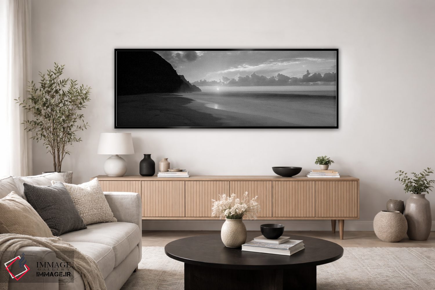 براساس پالت خنثی اثر، قاب مشکی مات (فریم باریک) پیشنهاد اول است و سفید مات (فریم باریک) مکمل. برای سفارشهای پروژهای با ابعاد و قابهای اختصاصی با ایماژ در تماس باشید.