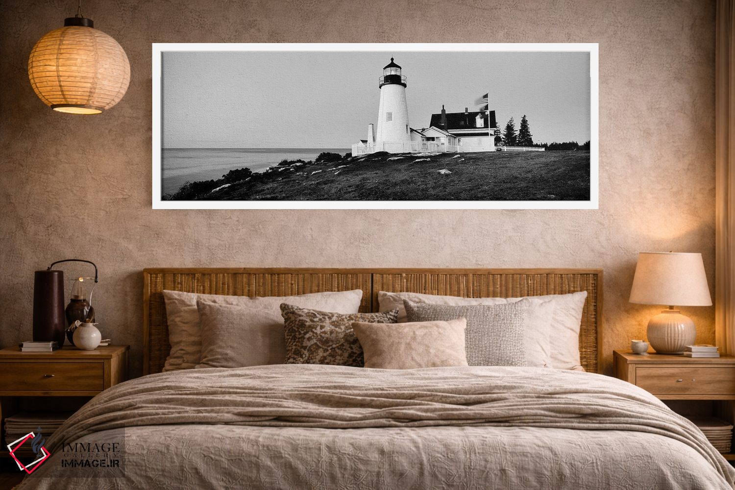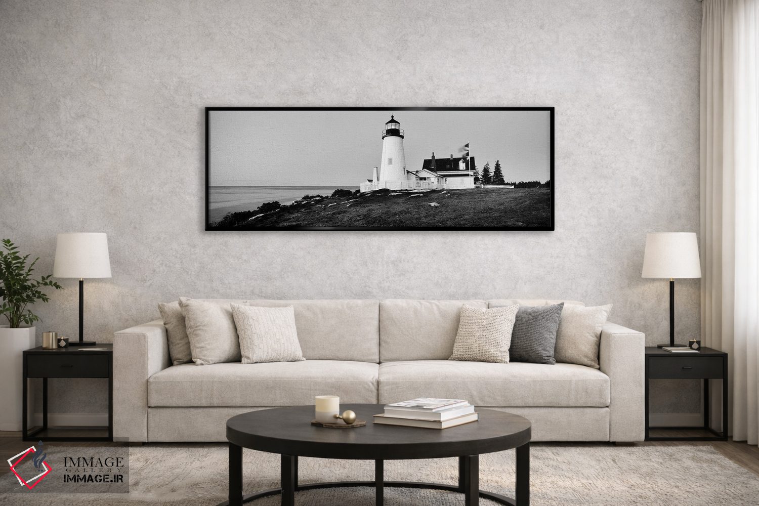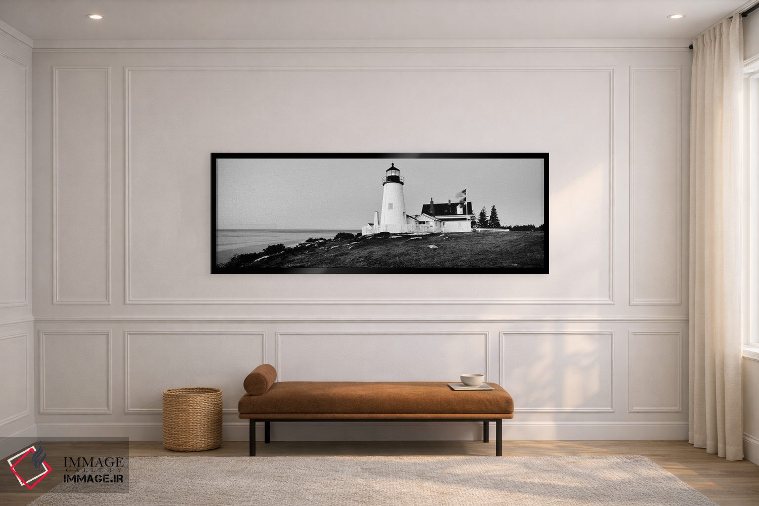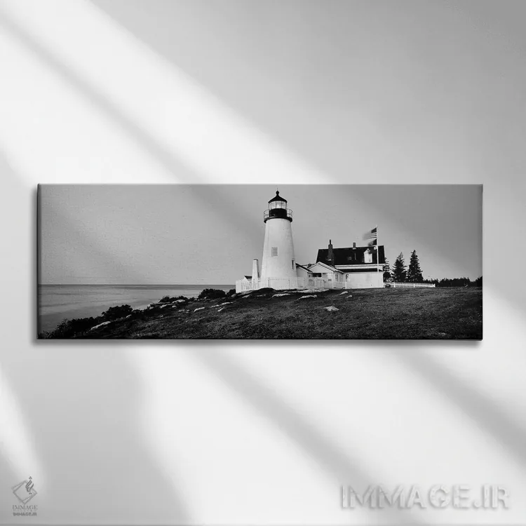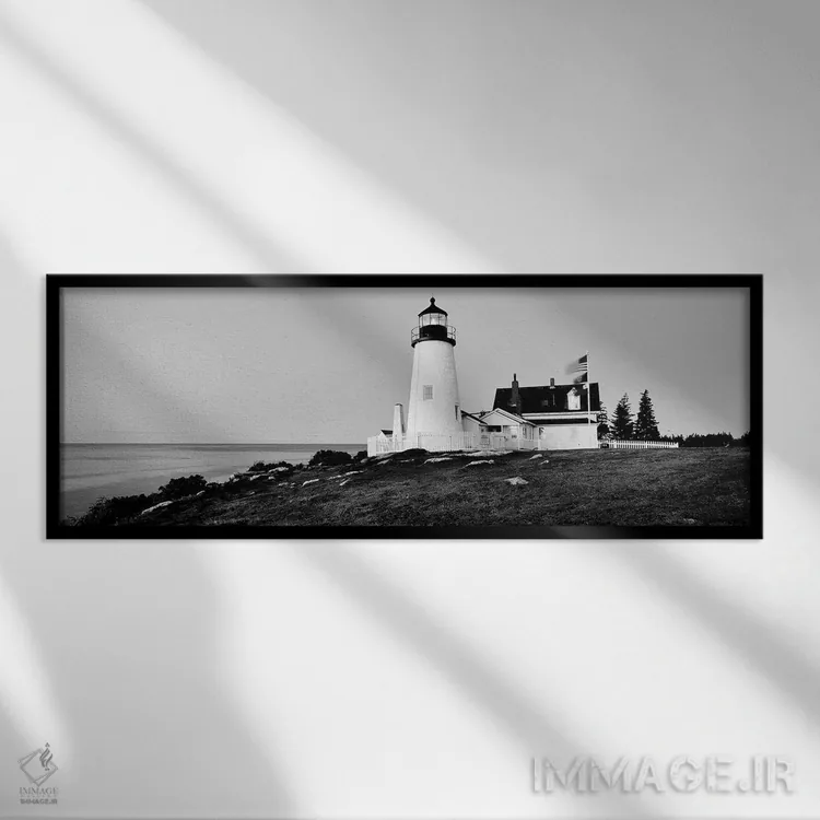 «"فانوس دریایی در یک ساحل، فانوس دریایی پمکید پوینت، بریستول، شهرستان لینکولن، ایالت مین، ایالات متحده"» اثرِ «پانورامیک ایمجز (استودیو عکاسی عریض)» با بیان سیاهوسفید، کنار دیوارهای روشن و قابهای ساده بسیار خوشفرم دیده میشود؛ موضوعِ این اثر هم خوانا میماند.