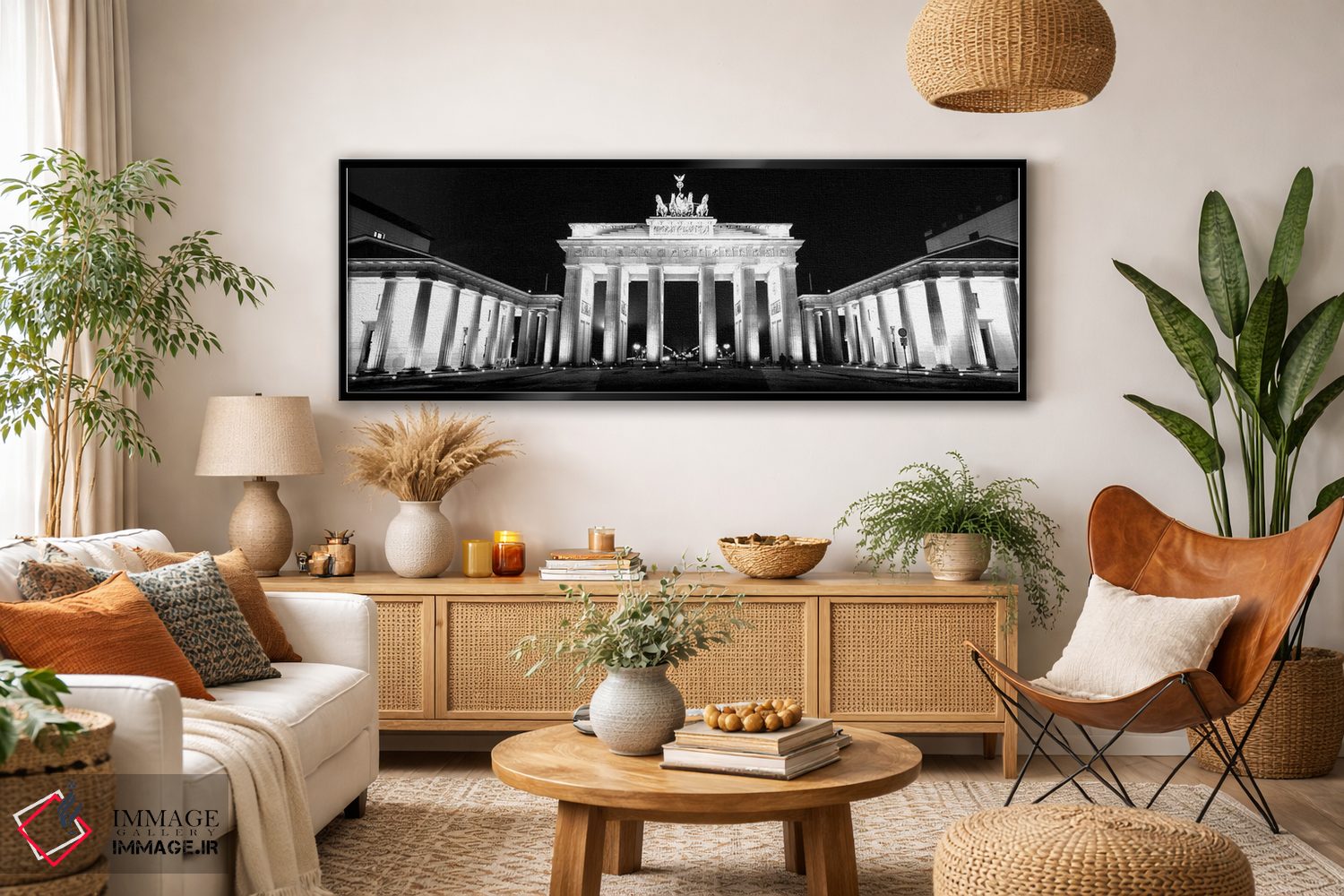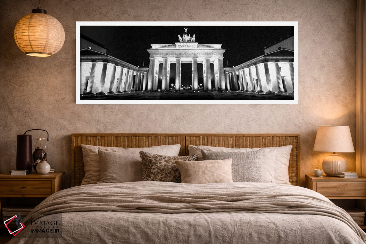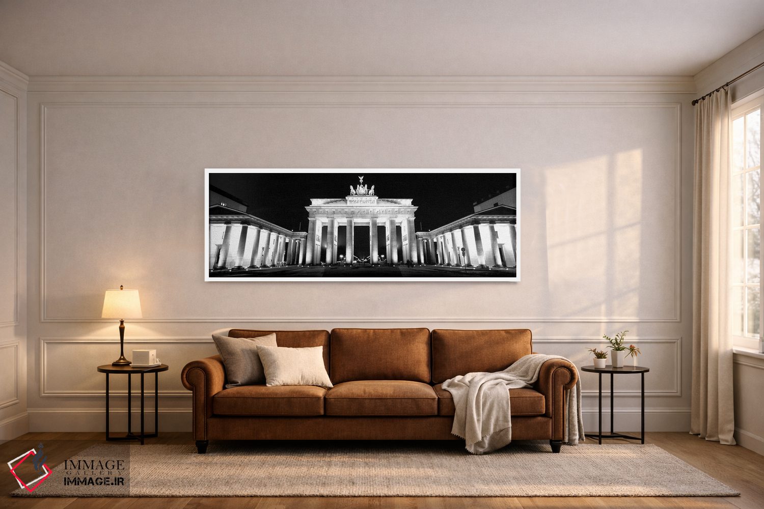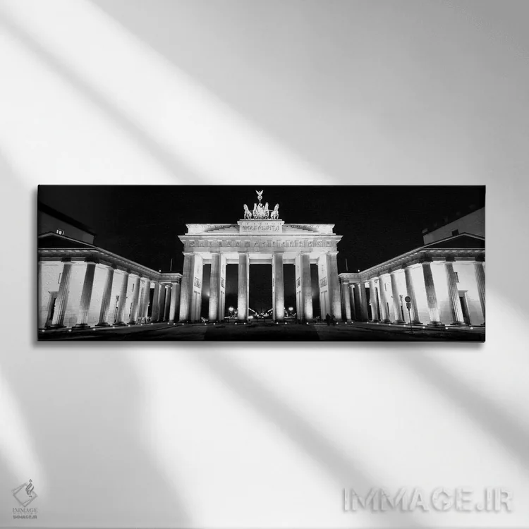 در «"نمای زاویه پایین از دروازهای که شبها روشن است، دروازه براندنبورگ، برلین، آلمان"»، اثرِ «پانورامیک ایمجز (استودیو عکاسی عریض)» این اثر را با زبان سیاهوسفید ارائه میکند؛ برای دکورهای کلاسیک—مدرن یک انتخاب مطمئن و هماهنگپذیر است.