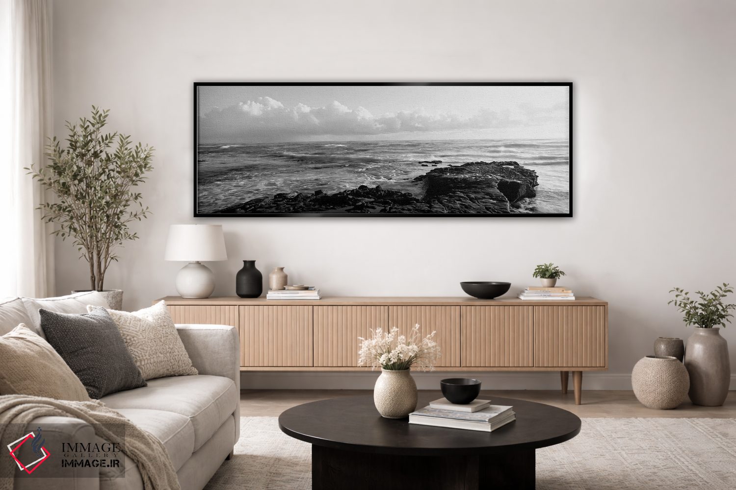 براساس پالت خنثی اثر، قاب مشکی مات (فریم باریک) پیشنهاد اول است و سفید مات (فریم باریک) مکمل. برای سفارشهای پروژهای با ابعاد و قابهای اختصاصی با ایماژ در تماس باشید.