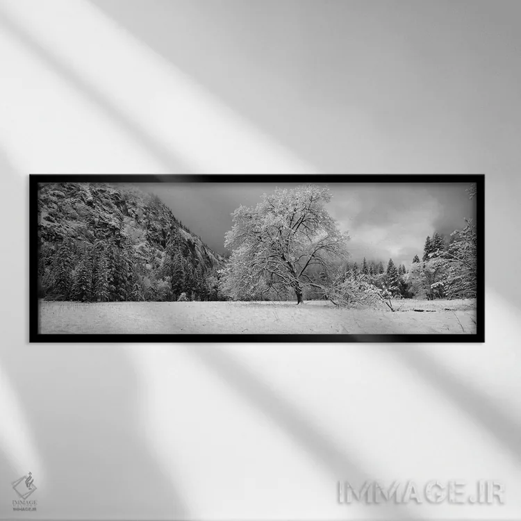 در «"درخت بلوط پوشیده از برف در یک دره، پارک ملی یوسمیتی، کالیفرنیا، ایالات متحده"»، اثرِ «پانورامیک ایمجز (استودیو عکاسی عریض)» این اثر را با زبان سیاهوسفید ارائه میکند؛ برای دکورهای کلاسیک—مدرن یک انتخاب مطمئن و هماهنگپذیر است.