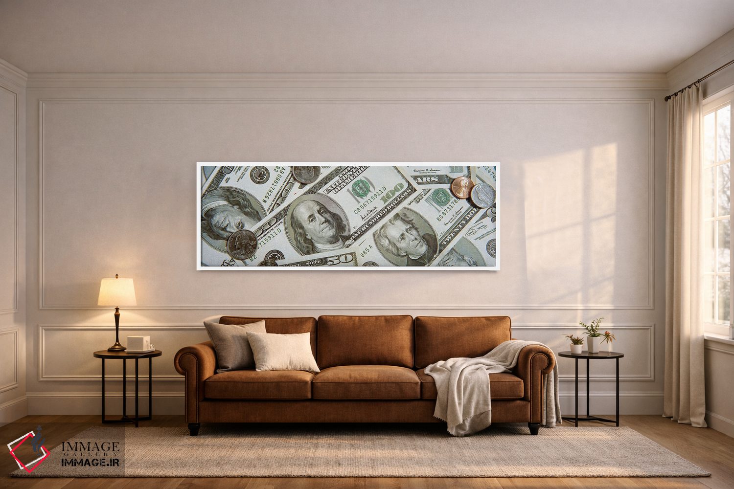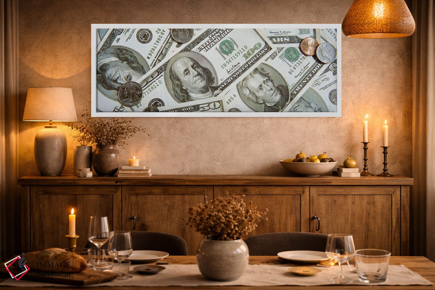 گاهی یک اثر کافیست تا فضا جمعوجور شود؛ «ارز دلار و سنت ایالات متحده» اثرِ «پانورامیک ایمجز (استودیو عکاسی عریض)» فضا را روشنتر و زندهتر نشان میدهد؛ برای راهروها و ورودیهای مینیمال پیشنهاد میشود. به دیوار حس «تمامشده» میدهد.