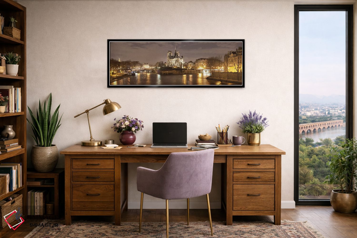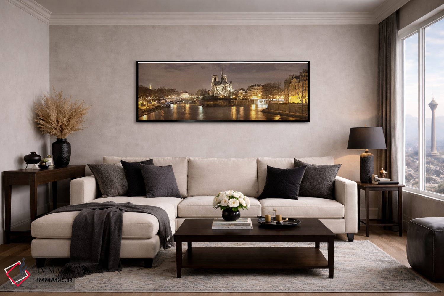 براساس پالت گرم اثر، قاب بلوط روشن (چوبی) پیشنهاد اول است و استخوانی ملایم مکمل. برای سفارشهای پروژهای با ابعاد و قابهای اختصاصی با ایماژ در تماس باشید.