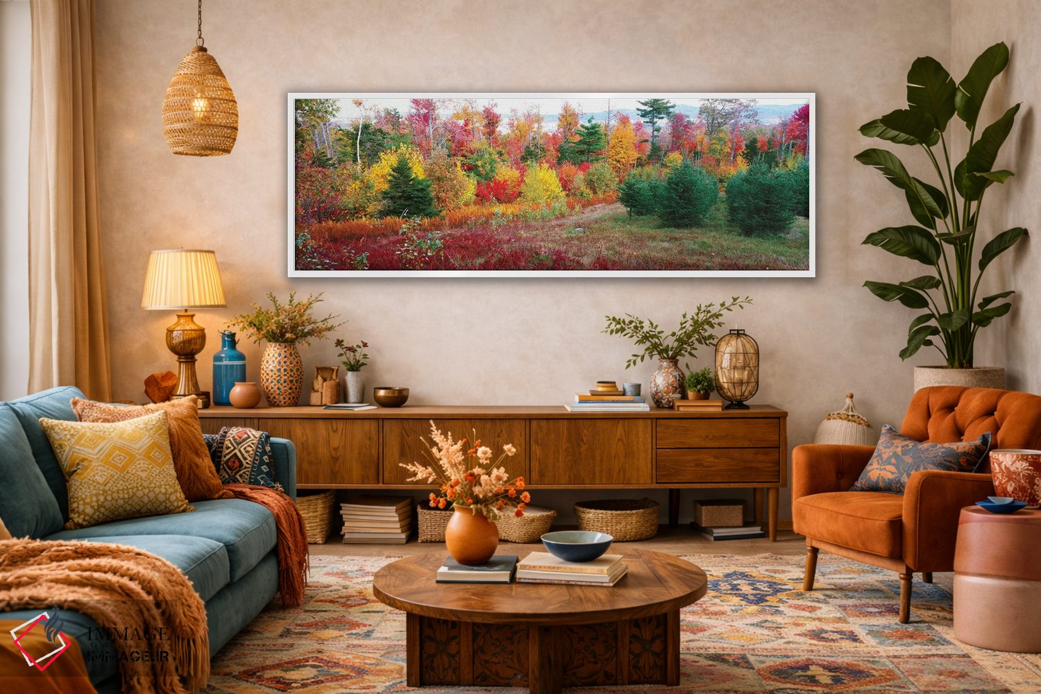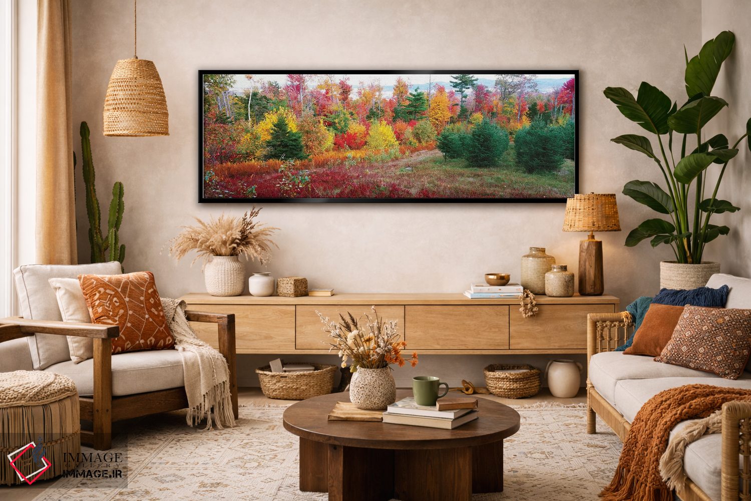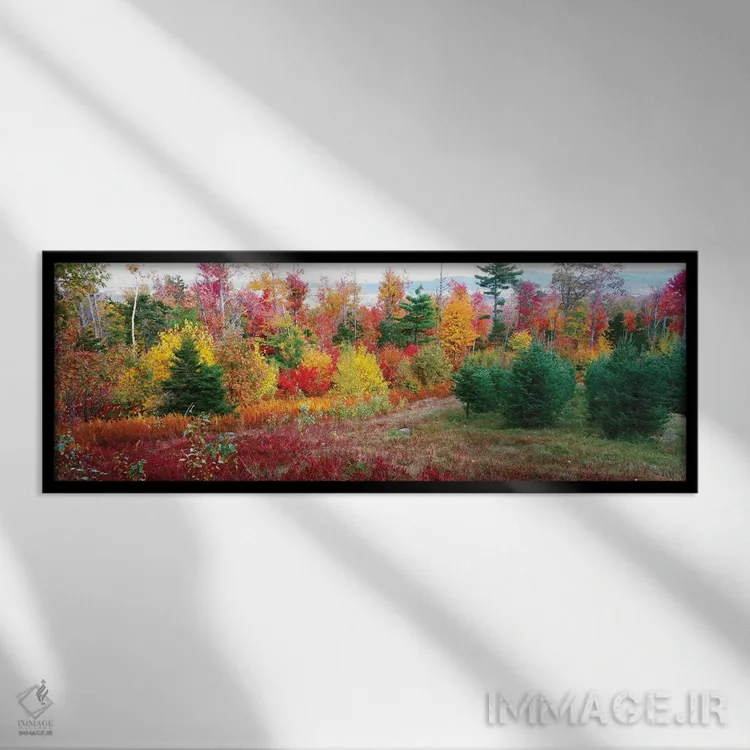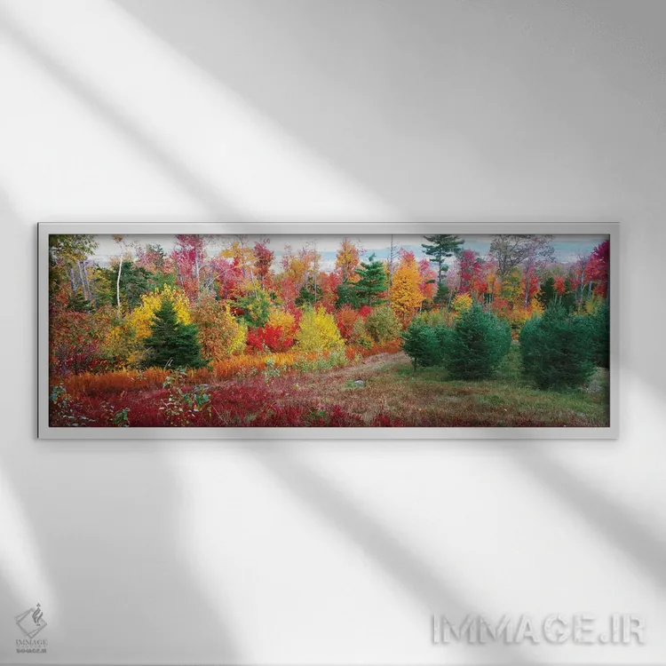 «Lincolnville، Waldo County، Maine، USA"—"درختان کریسمس و رنگهای پاییزی، لینکلنویل، شهرستان والد، ایالت مین، ایالات متحده"» اثرِ «پانورامیک ایمجز (استودیو عکاسی عریض)» یک قاب دکوراتیوِ گرم و دلنشین است؛ این اثر در اجرای پرداختِ هنری، فضا را نرمتر و صمیمیتر نشان میدهد.