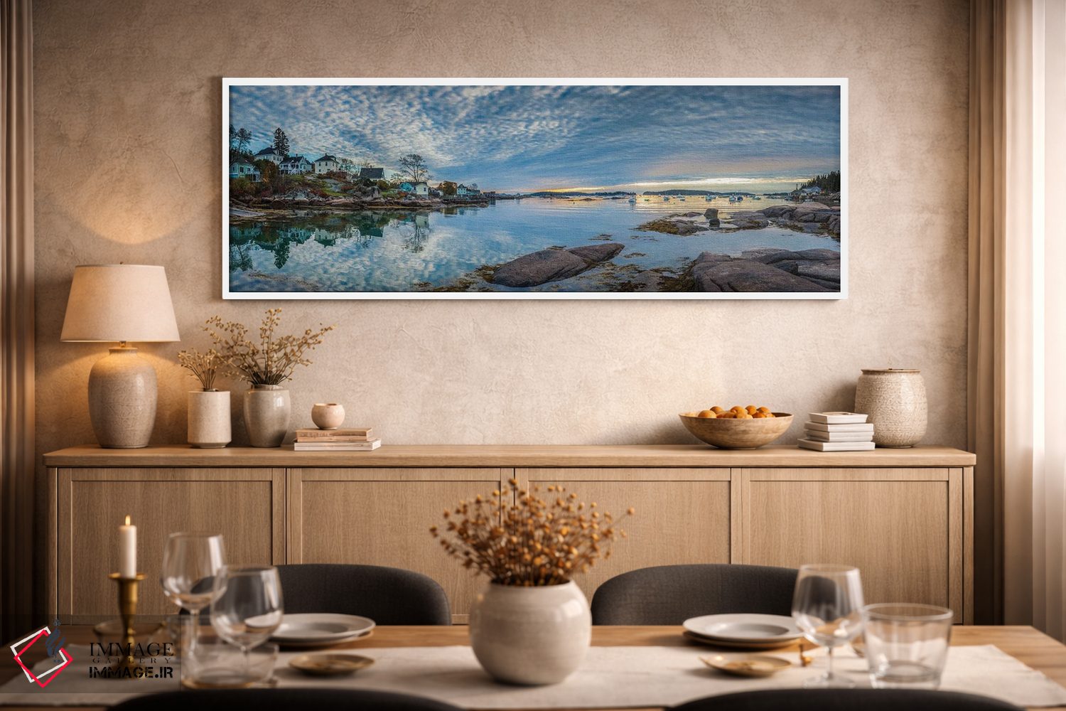 «Maine، Stonington، Stonington Harbor، Dawn"—"ایالات متحده، مین، استونینگتون، بندر استونینگتون، سپیدهدم"» اثرِ «پانورامیک ایمجز (استودیو عکاسی عریض)» انتخابیست برای زمانی که اتاق را جمعوجورتر و مرتبتر نشان میدهد؛ برای اتاق کار و گوشهٔ مطالعه انتخابی عالی است. برای پروژههای طراحی داخلی هم گزینهای قابل اتکاست.