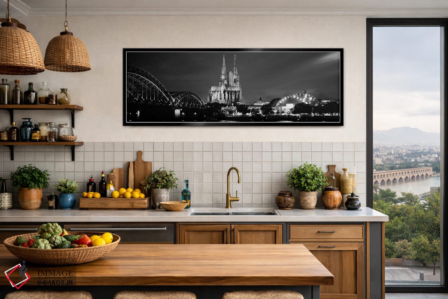 «Musical Dome، Cologne Cathedral، Hohenzollern Bridge، Rhine River، Cologne، North Rhine Westphalia، Germany"—"شهر در هنگام غروب، گنبد موسیقی، کلیسای جامع کلن، پل هوهنزولرن، رودخانه راین، کلن، نورث راین وستفالی، آلمان"» اثرِ «پانورامیک ایمجز (استودیو عکاسی عریض)» با بیان سیاهوسفید، کنار دیوارهای روشن و قابهای ساده بسیار خوشفرم دیده میشود؛ موضوعِ این اثر هم خوانا میماند.
