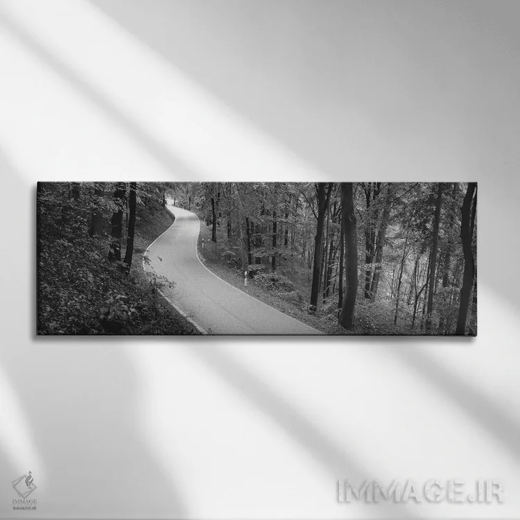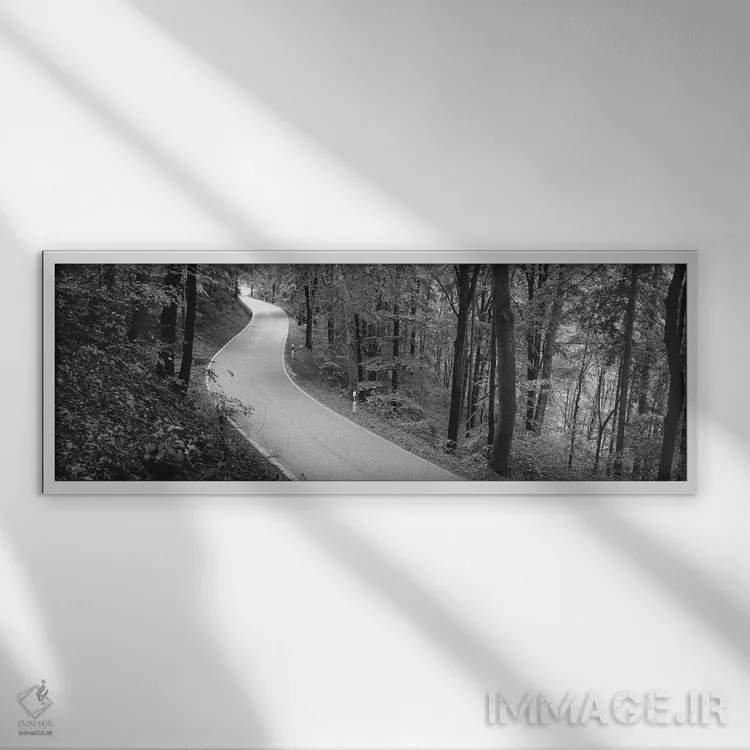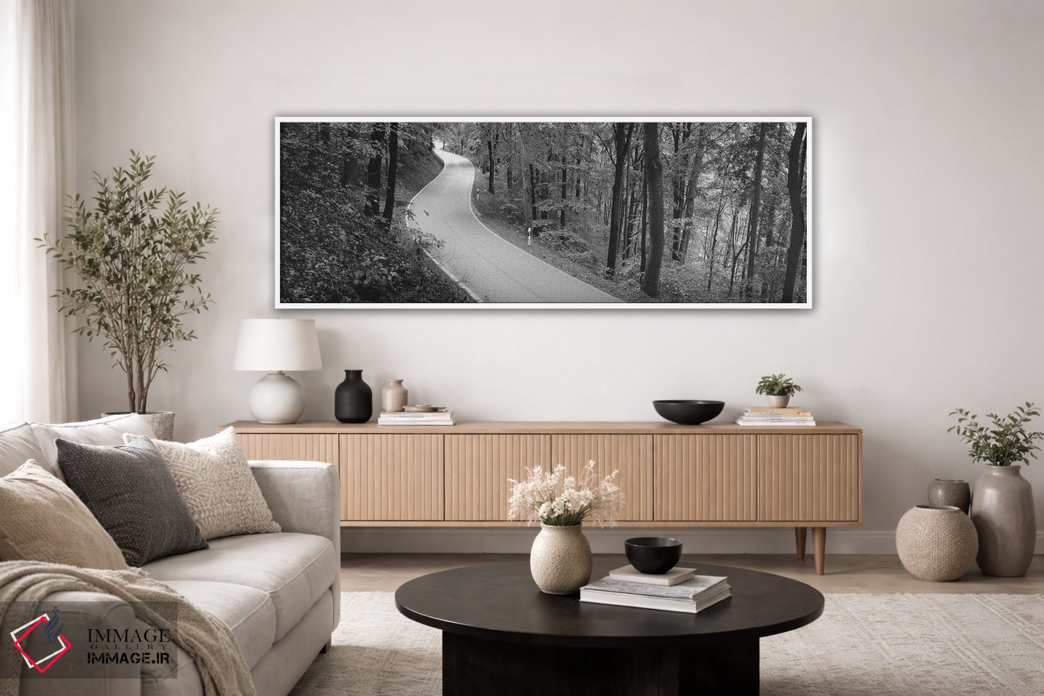 «Stuttgart، Baden—Wurttemberg، Germany"—"جاده خالی که از جنگلی عبور میکند، اشتوتگارت، بادن—وورتمبرگ، آلمان"» اثرِ «پانورامیک ایمجز (استودیو عکاسی عریض)» با بیان سیاهوسفید، کنار دیوارهای روشن و قابهای ساده بسیار خوشفرم دیده میشود؛ موضوعِ این اثر هم خوانا میماند.