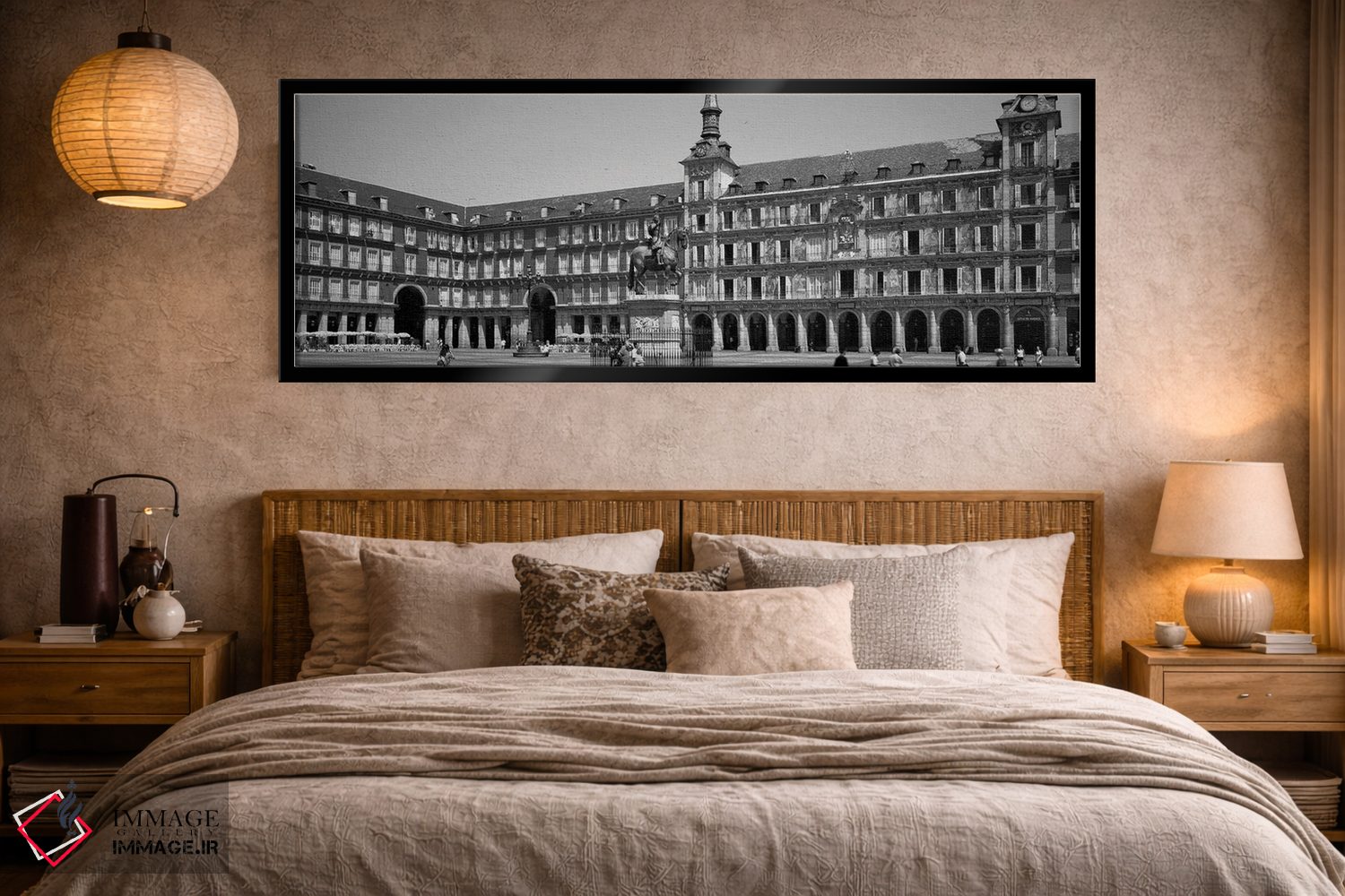 در «گردشگران در میدان، پلازا مایور، مادرید، اسپانیا»، اثرِ «پانورامیک ایمجز (استودیو عکاسی عریض)» این اثر را با زبان سیاهوسفید ارائه میکند؛ برای دکورهای کلاسیک—مدرن یک انتخاب مطمئن و هماهنگپذیر است.