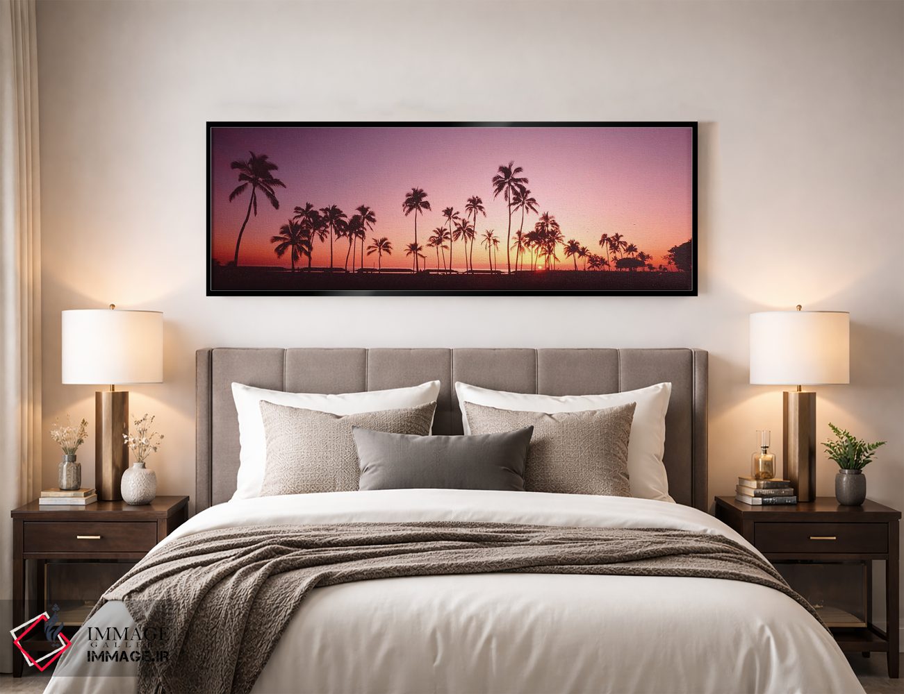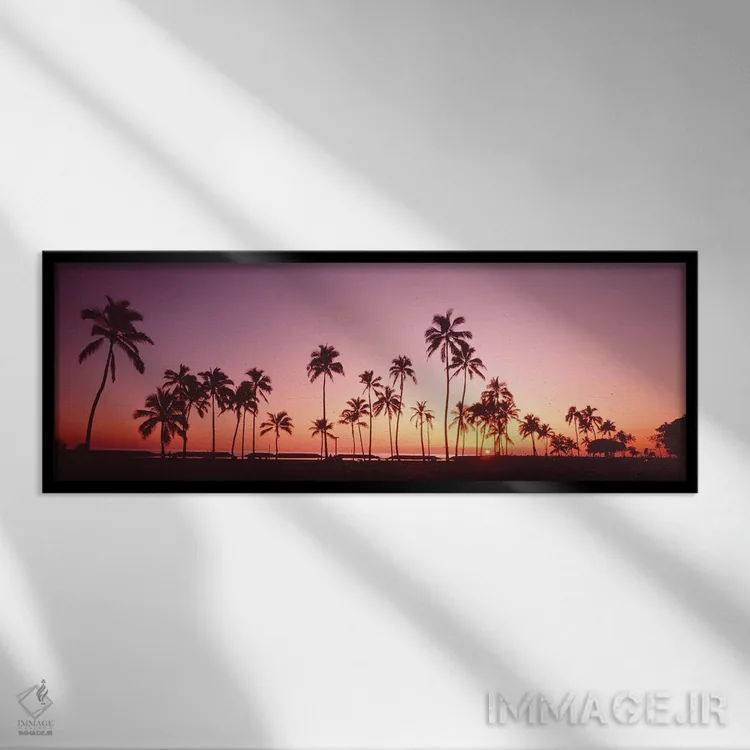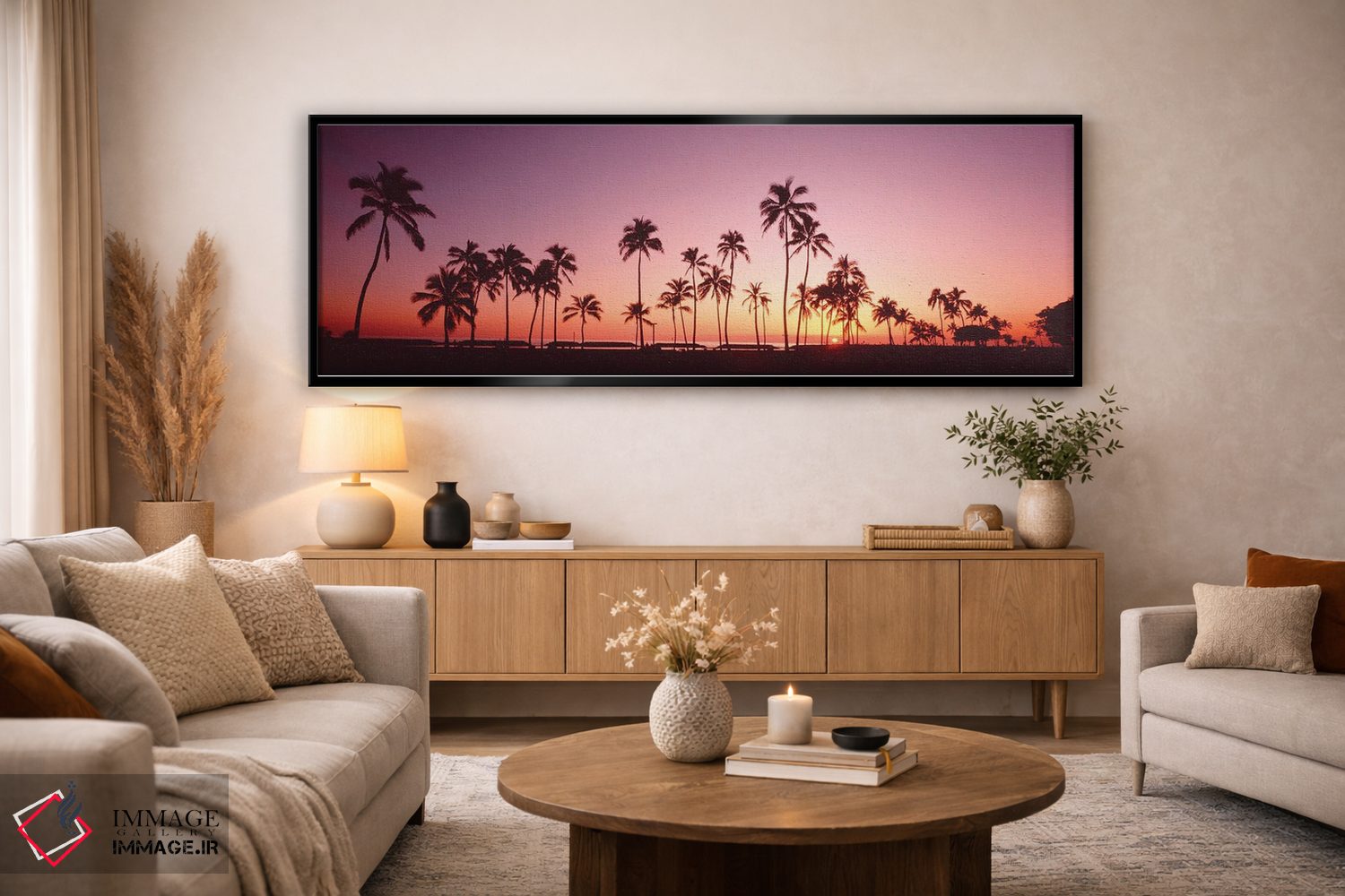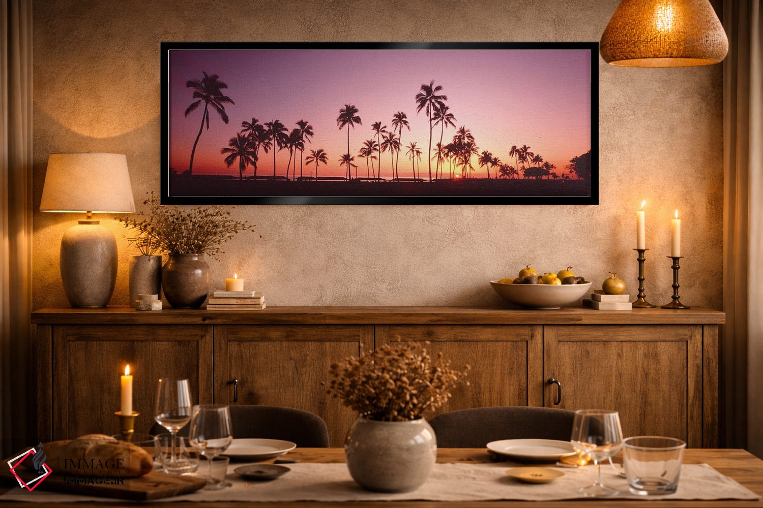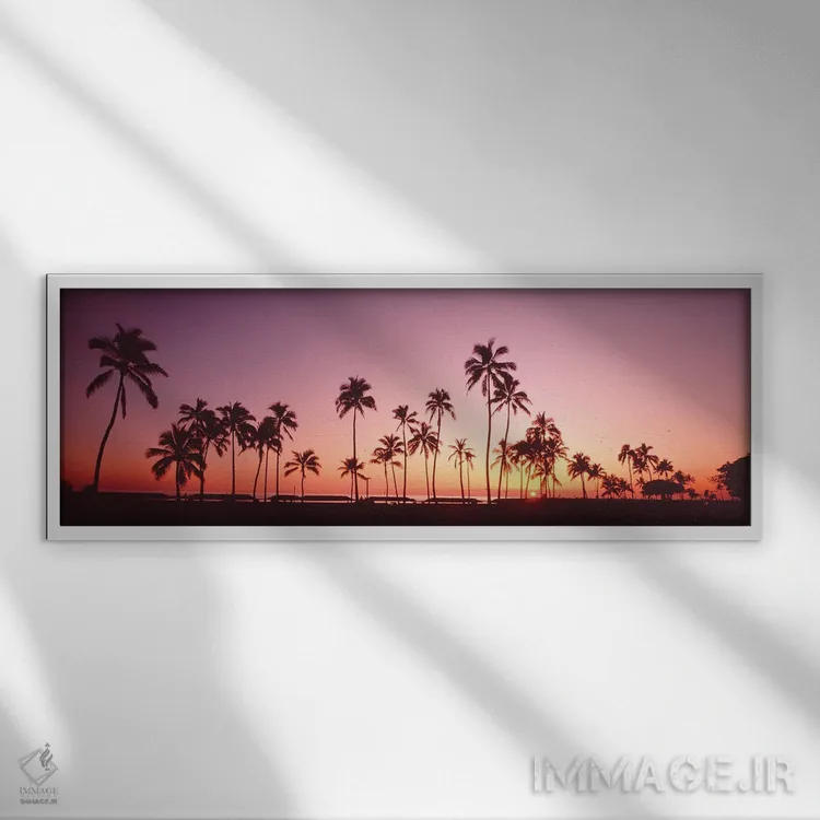«درختان نخل در غروب خورشید، جزیره اوآهو، هاوایی، ایالات متحده آمریکا» اثرِ «پانورامیک ایمجز (استودیو عکاسی عریض)» میتواند یک حس «تمامشده و پرداختشده» ایجاد کند؛ برای دیوارهای گالریوار و ترکیب چند اثر پیشنهاد میشود. اگر میخواهید مهمانها مکث کنند، این اثر دلیل خوبیست.