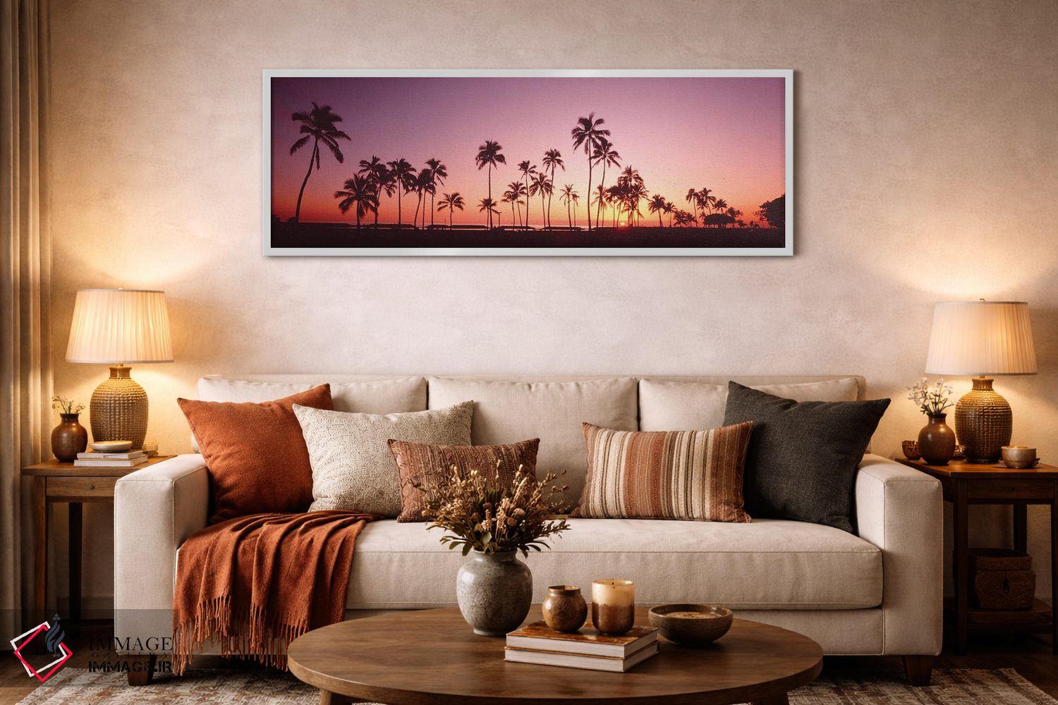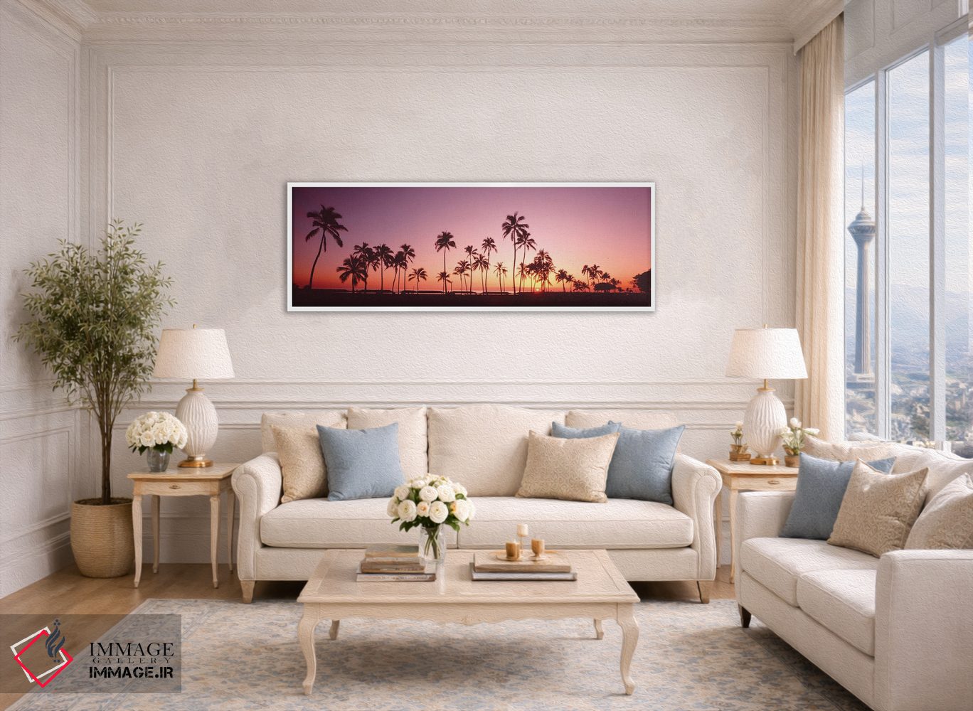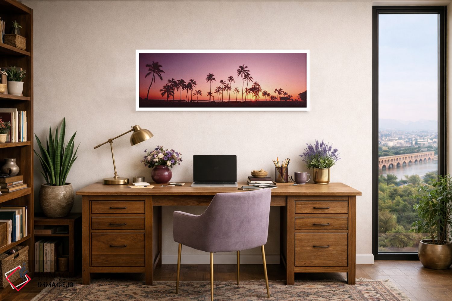 «درختان نخل در غروب خورشید، جزیره اوآهو، هاوایی، ایالات متحده آمریکا» اثرِ «پانورامیک ایمجز (استودیو عکاسی عریض)» میتواند یک حس «تمامشده و پرداختشده» ایجاد کند؛ برای دیوارهای گالریوار و ترکیب چند اثر پیشنهاد میشود. اگر میخواهید مهمانها مکث کنند، این اثر دلیل خوبیست.