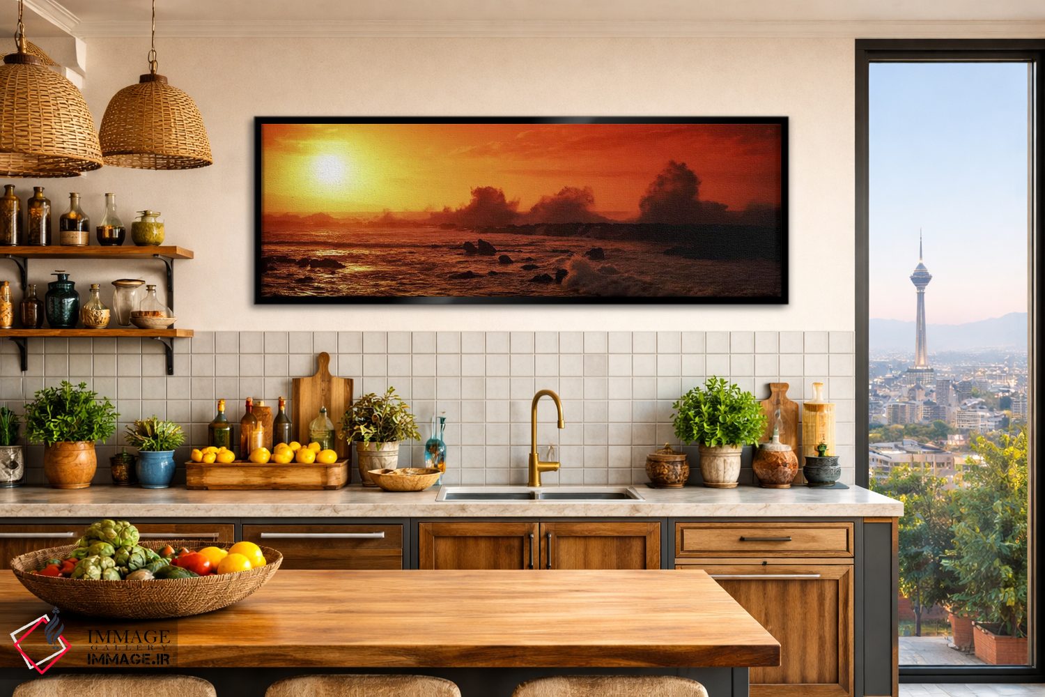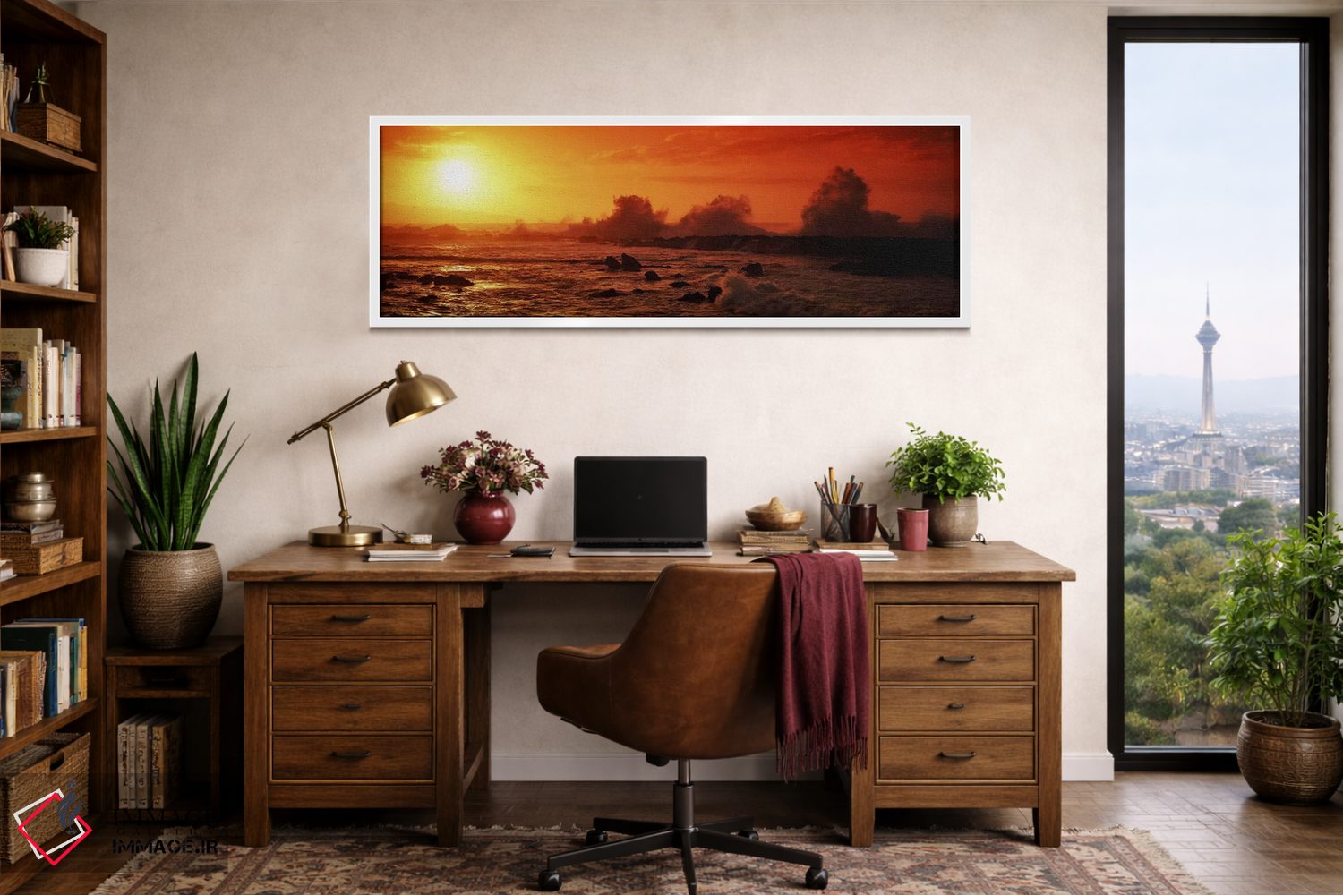 براساس پالت ترکیبی اثر، قاب تیک گرم (چوبی) پیشنهاد اول است و مشکی مات (فریم متوسط) مکمل. برای سفارشهای پروژهای با ابعاد و قابهای اختصاصی با ایماژ در تماس باشید.