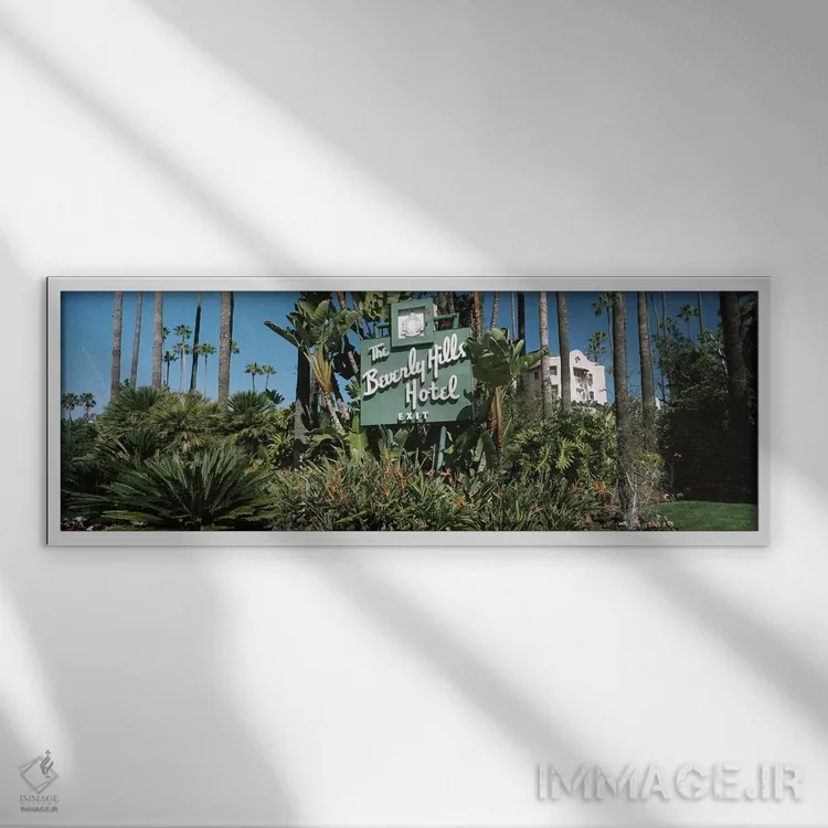 در «Beverly Hills Hotel، Beverly Hills، Los Angeles County، California، USA، تابلوی هتل بورلی هیلز، بورلی هیلز، شهرستان لسآنجلس، کالیفرنیا، آمریکا» اثرِ «پانورامیک ایمجز (استودیو عکاسی عریض)»، زیبایی در جزئیات است؛ اثری مناسب برای دیوارهای نزدیک و قابلدیدن از فاصلهی کوتاه.
