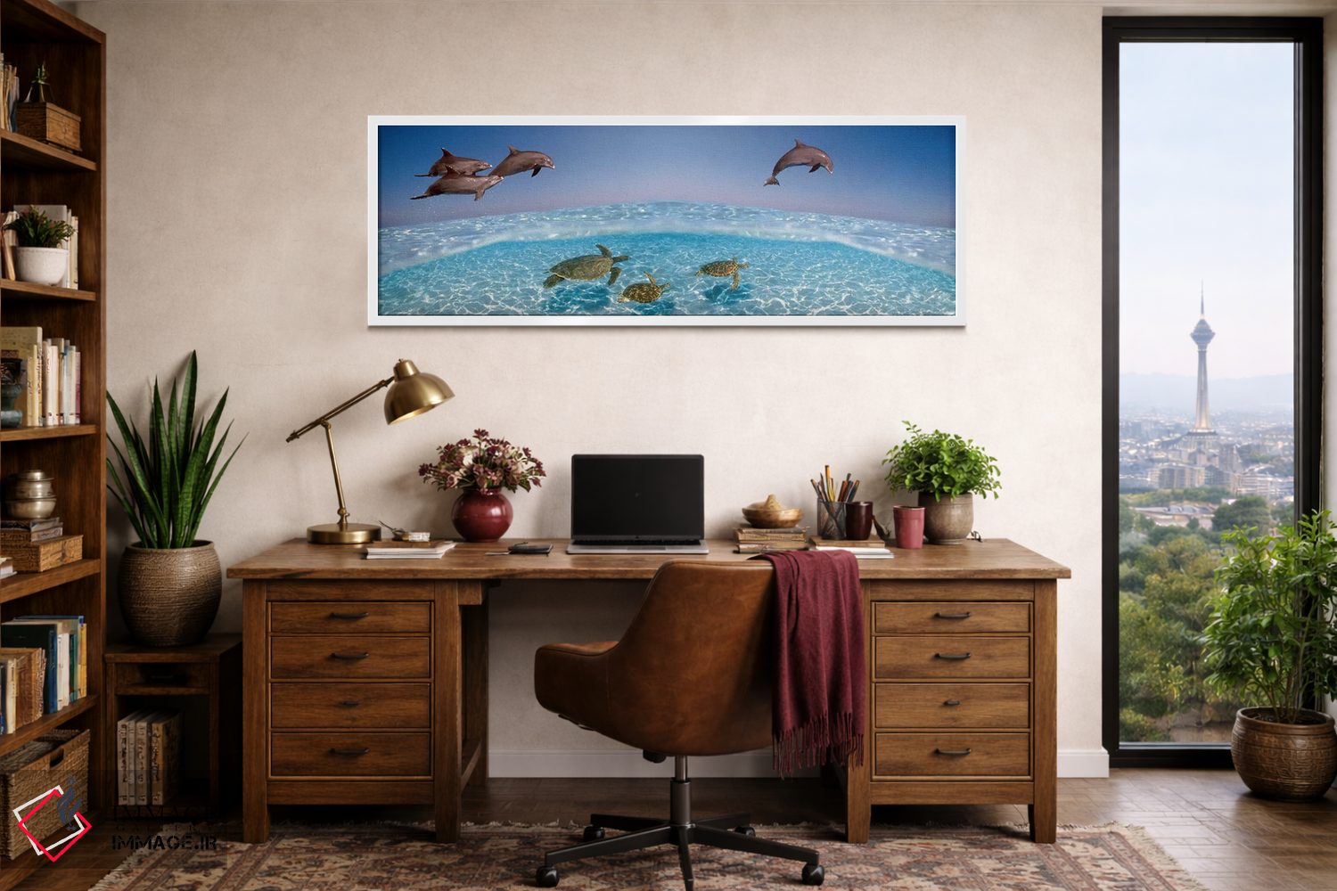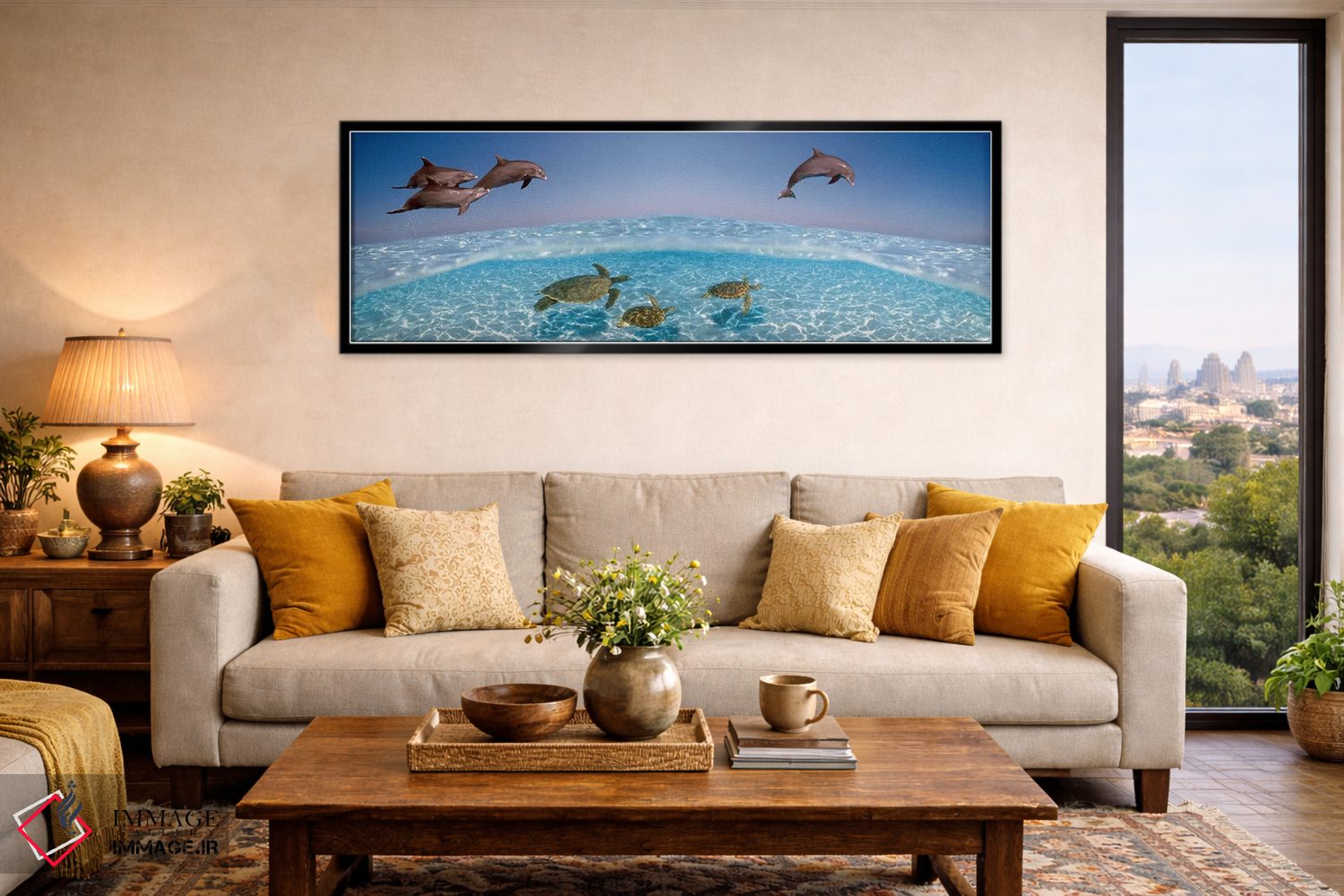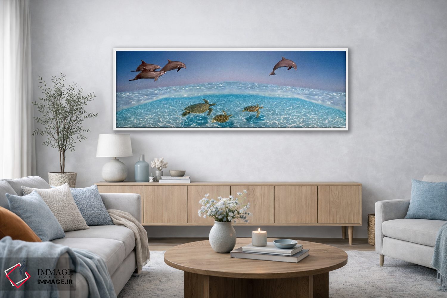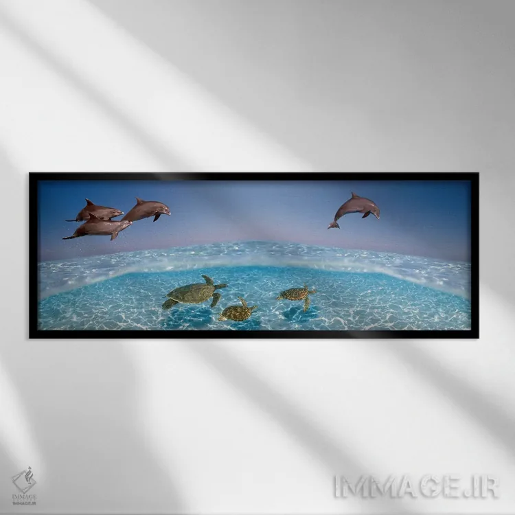 این اثر با عنوان «دلفین بینیبطری در حال پرش و لاکپشتها در حال شنا زیر آب» اثرِ «پانورامیک ایمجز (استودیو عکاسی عریض)» فضا را صمیمیتر و دعوتکنندهتر نشان میدهد؛ برای راهروها و ورودیهای گرم انتخابی خوشسلیقه است. برای دیوار گالریوار هم گزینهٔ خوبیست.