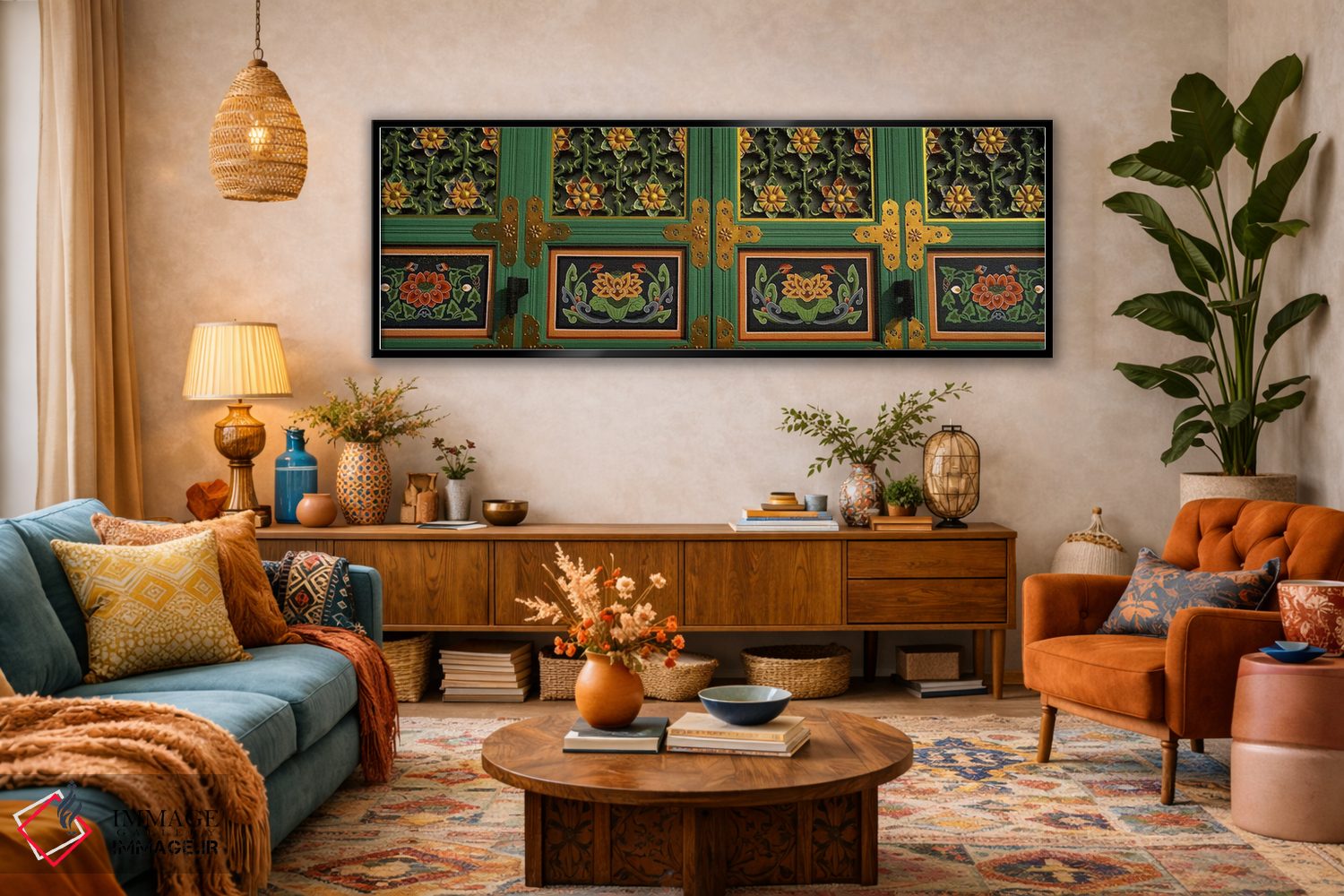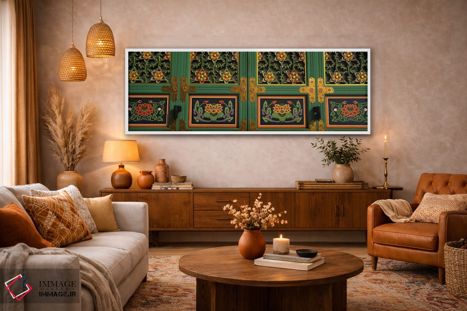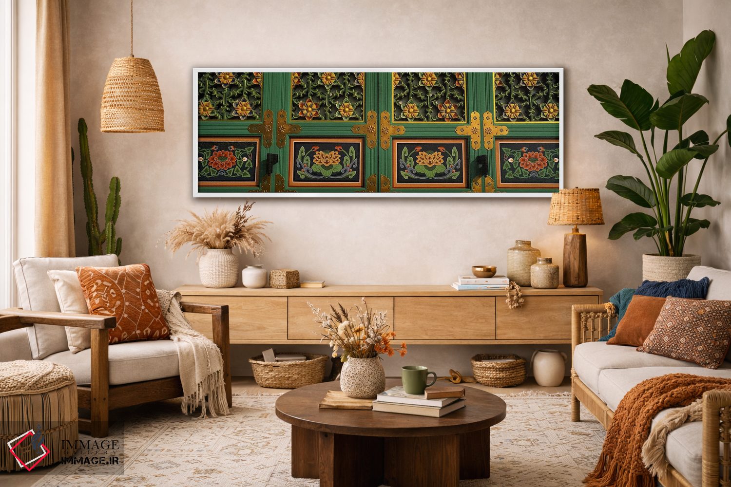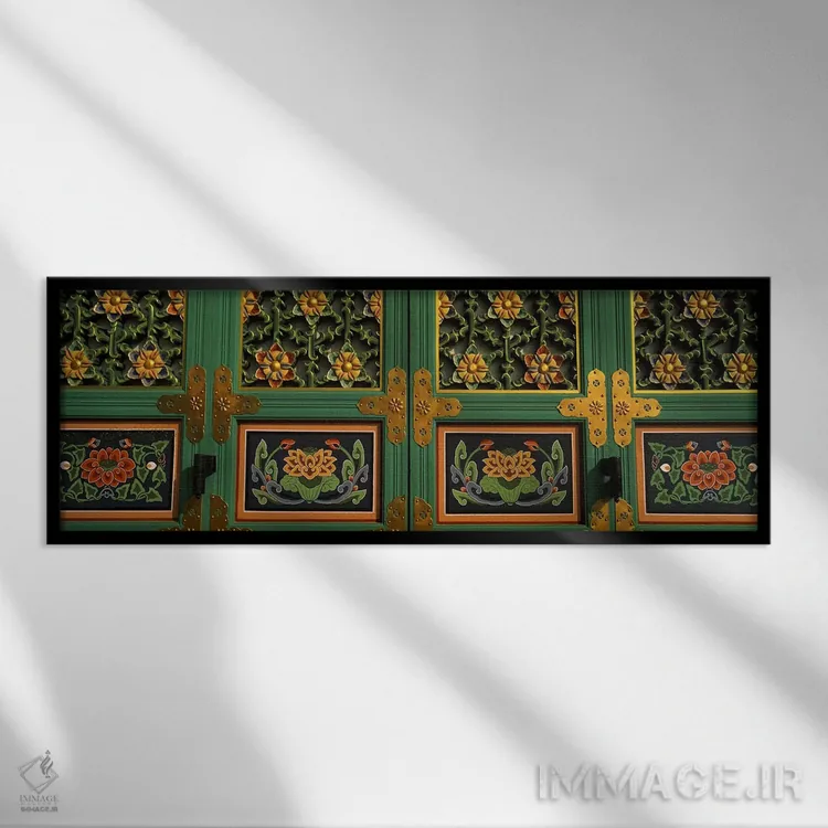 این تابلو با عنوان «Kayasan Mountains، Haeinsa Temple، Gyeongsang Province، South Korea #2، نقاشیها بر روی در معبد بودایی، کوههای کایاسان، معبد هئینسا، استان گیونگسانگ، کره جنوبی شماره ۲» اثرِ «پانورامیک ایمجز (استودیو عکاسی عریض)» ریتم فضا را منظم میکند؛ برای دکورهای کلاسیک با چوب و پارچه پیشنهاد میشود. در کنار قاب مناسب، جلوهٔ کار چند برابر میشود.