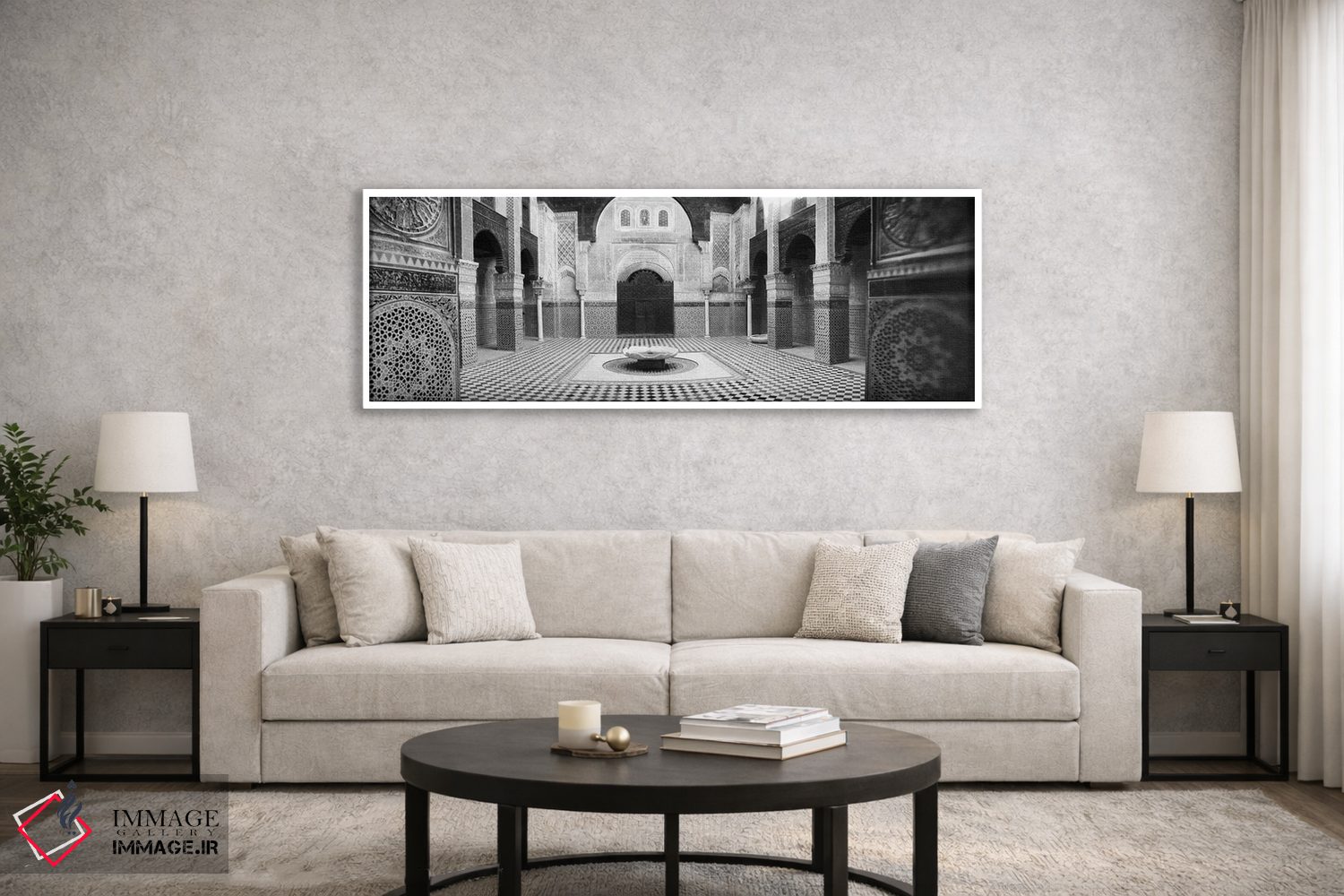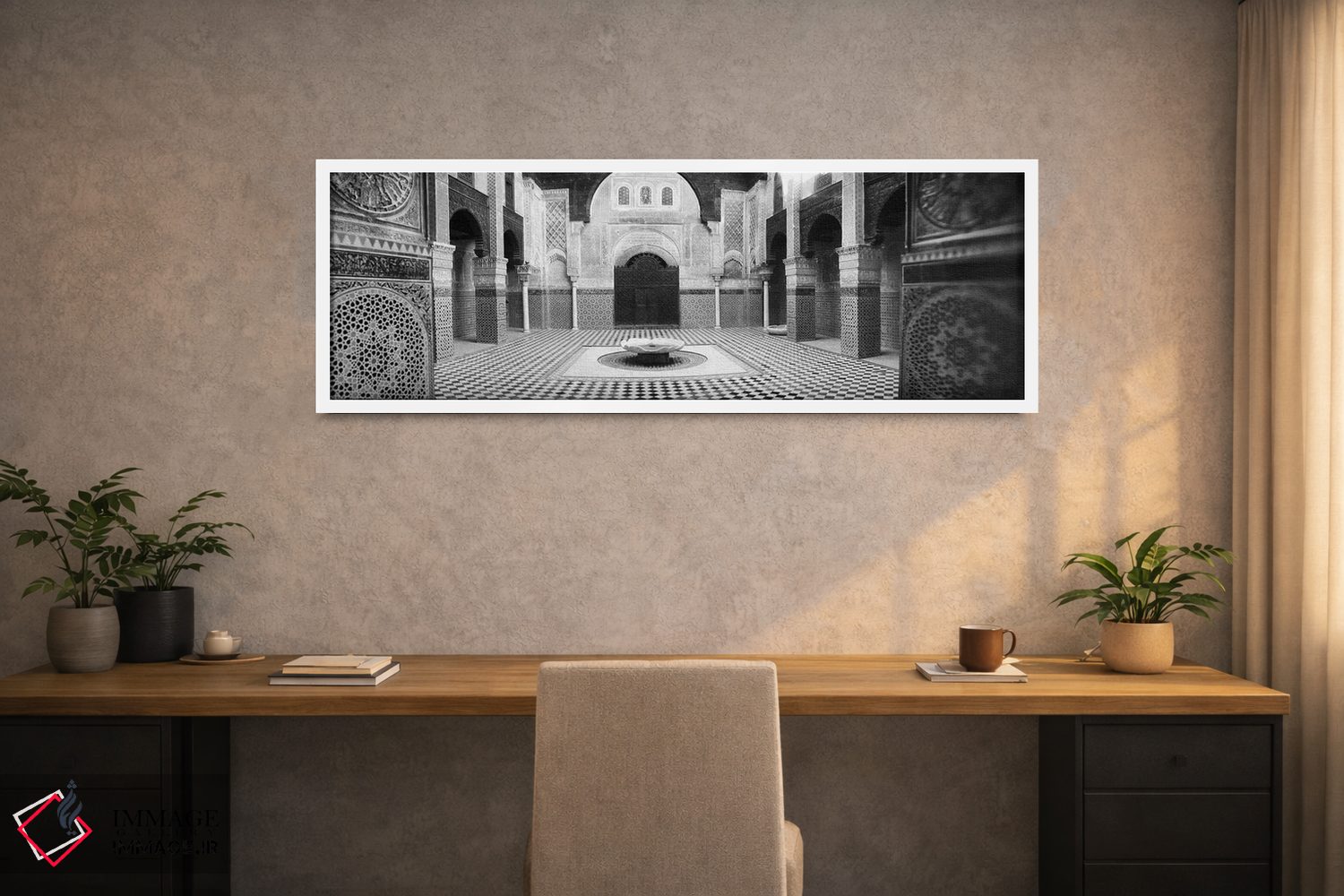 در هنری، سادگیِ سیاهوسفید همهچیز را روی فرم میبرد؛ «Medersa Bou Inania، Fez، Morocco #2، فضای داخلی مدرسه، مدرسه بوعنانیه، فاس، مراکش #۲» اثرِ «پانورامیک ایمجز (استودیو عکاسی عریض)» برای دکورهای مینیمال فوقالعاده مینشیند.