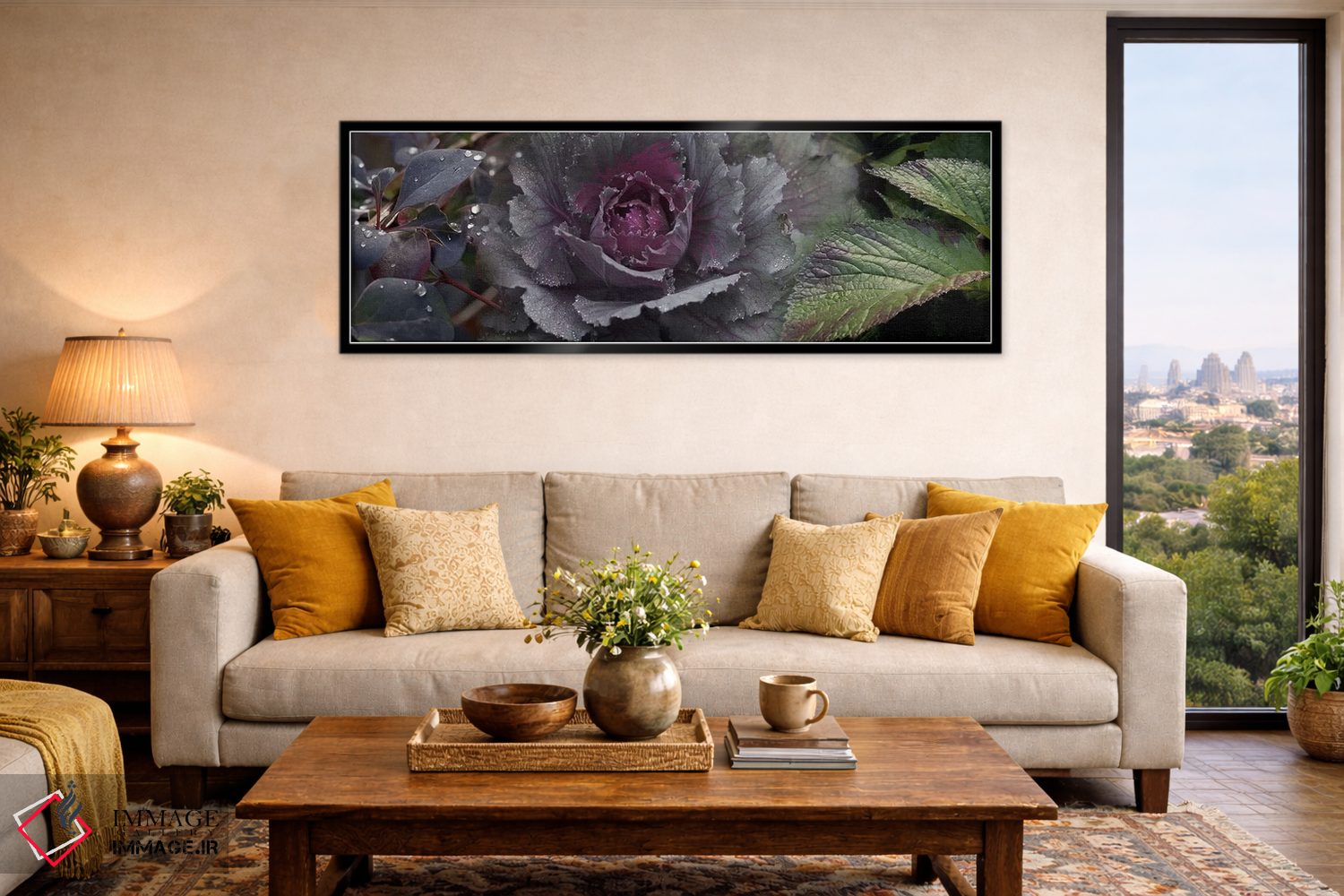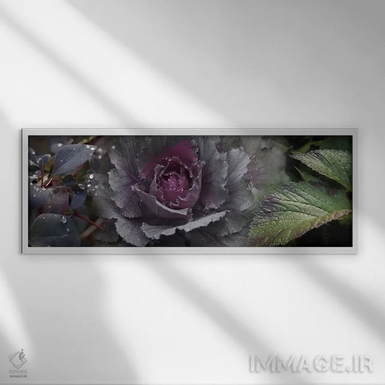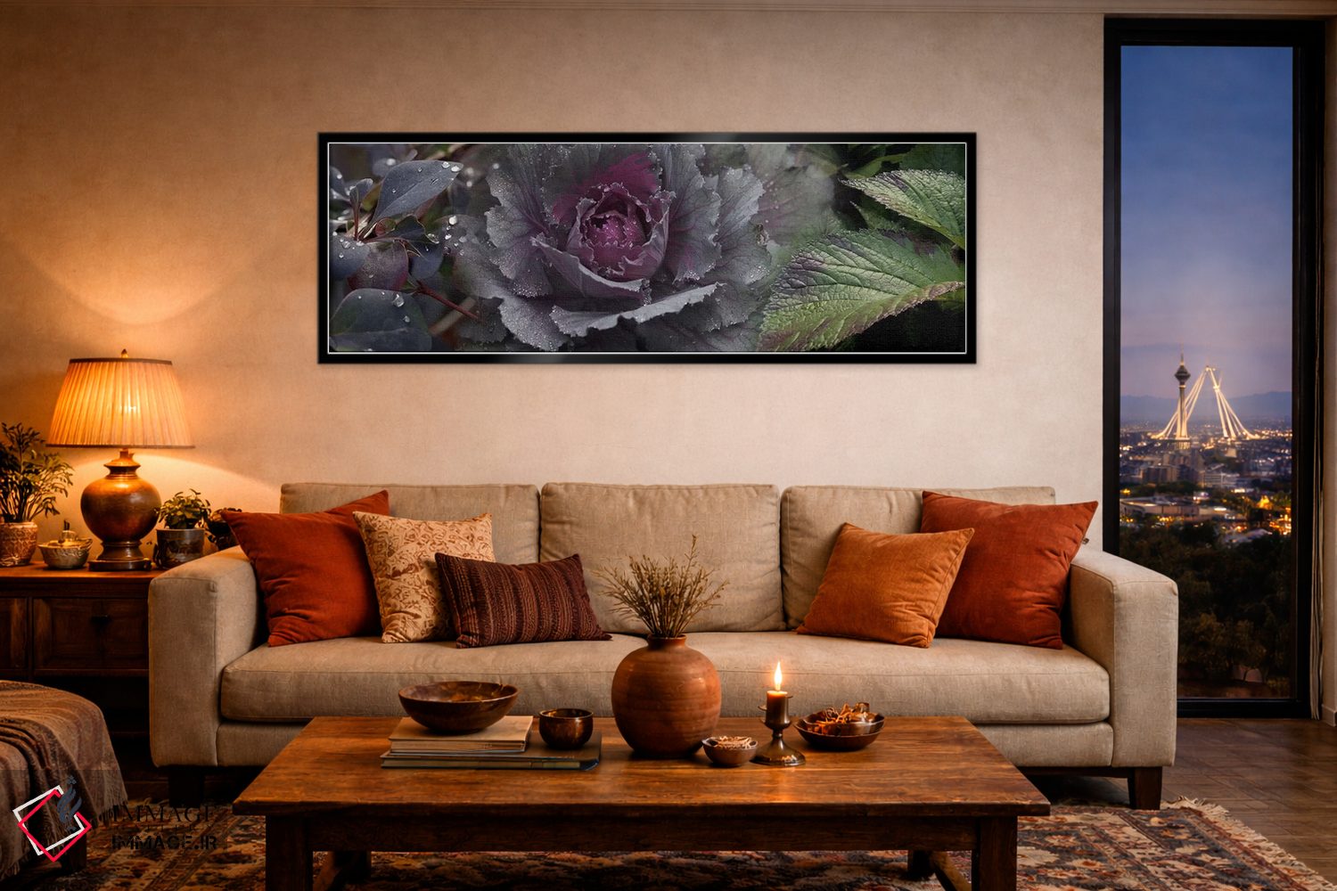 برای دیواری که دوست دارید «حرف داشته باشد»، «نمای نزدیک از برگها و کلم تزیینی با قطرات آب» اثرِ «پانورامیک ایمجز (استودیو عکاسی عریض)» در کنار مبلمان، خوشنشین و هماهنگ مینشیند؛ برای راهروها و ورودیهای مینیمال پیشنهاد میشود. اگر دنبال زیباییِ بیادعا هستید، این اثر درست مینشیند.