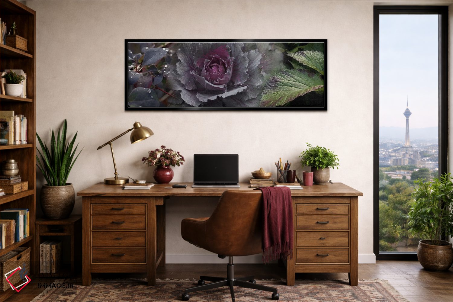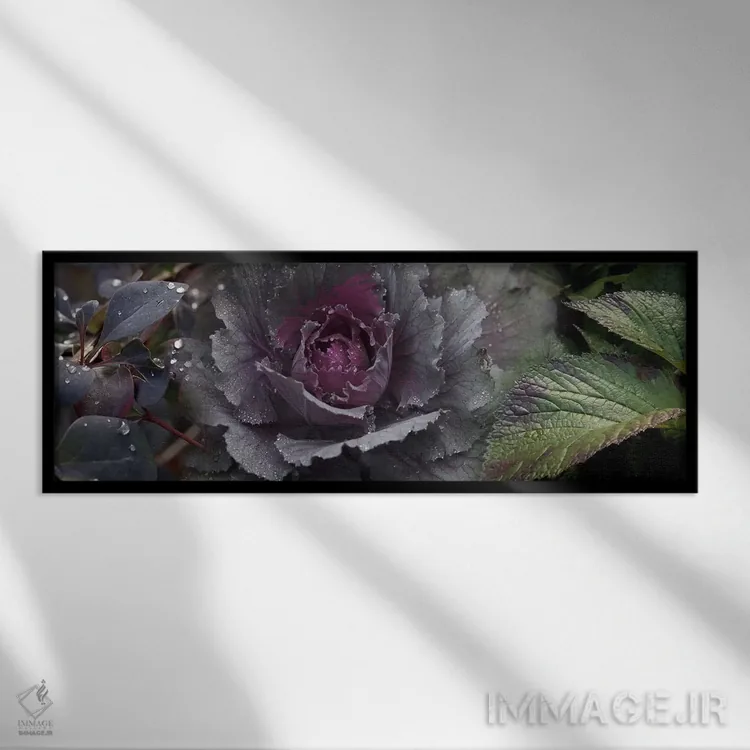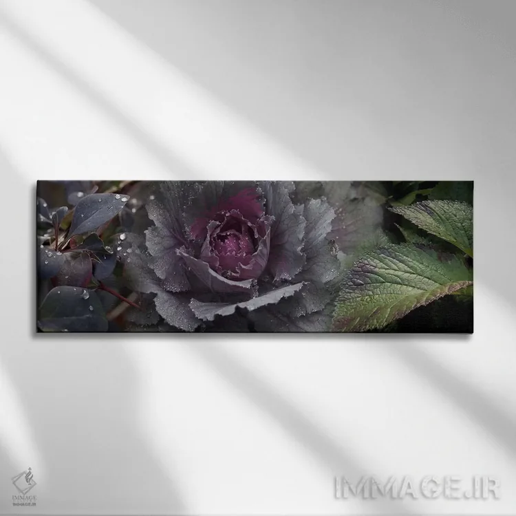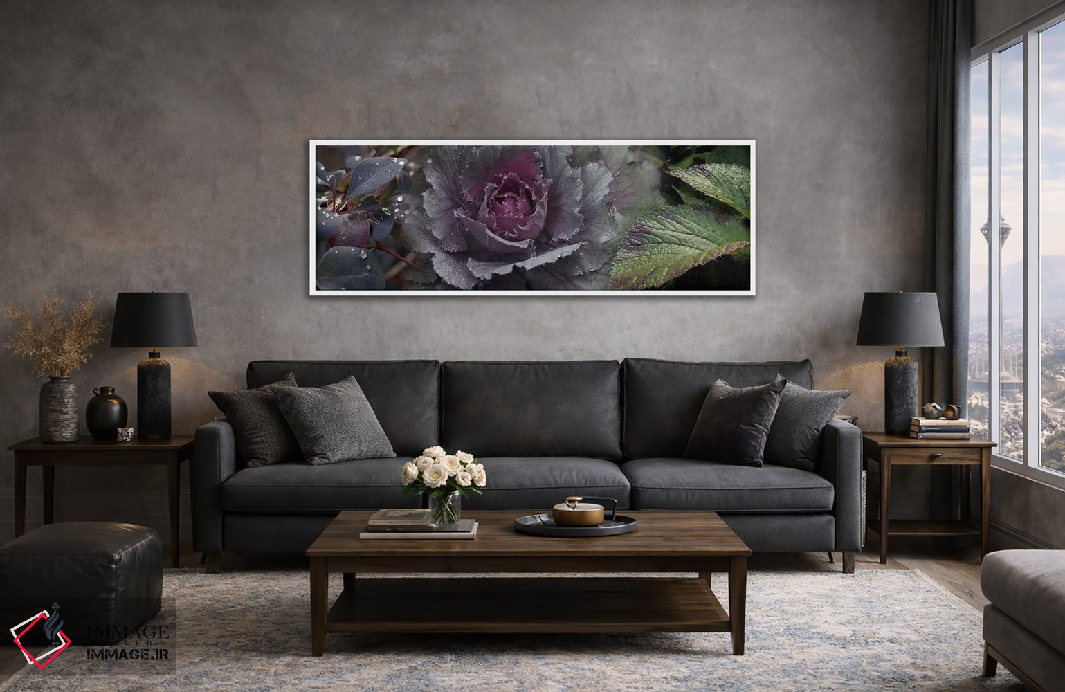 برای دیواری که دوست دارید «حرف داشته باشد»، «نمای نزدیک از برگها و کلم تزیینی با قطرات آب» اثرِ «پانورامیک ایمجز (استودیو عکاسی عریض)» در کنار مبلمان، خوشنشین و هماهنگ مینشیند؛ برای راهروها و ورودیهای مینیمال پیشنهاد میشود. اگر دنبال زیباییِ بیادعا هستید، این اثر درست مینشیند.
