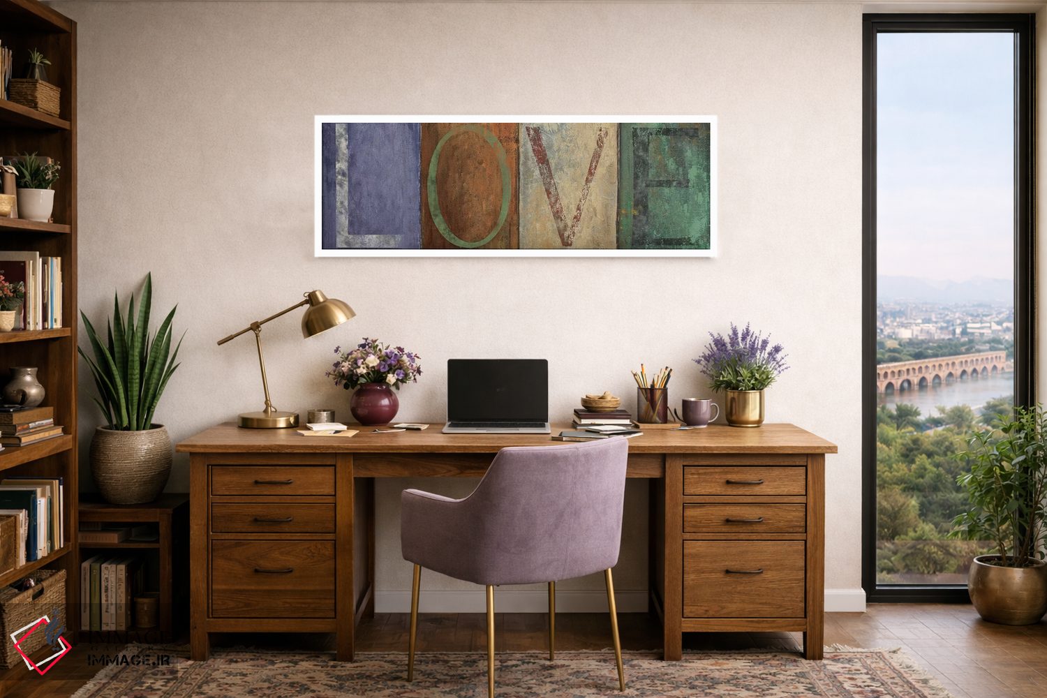 براساس پالت گرم اثر، قاب بلوط روشن (چوبی) پیشنهاد اول است و استخوانی ملایم مکمل. برای سفارشهای پروژهای با ابعاد و قابهای اختصاصی با ایماژ در تماس باشید.