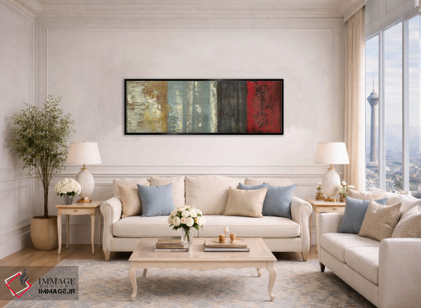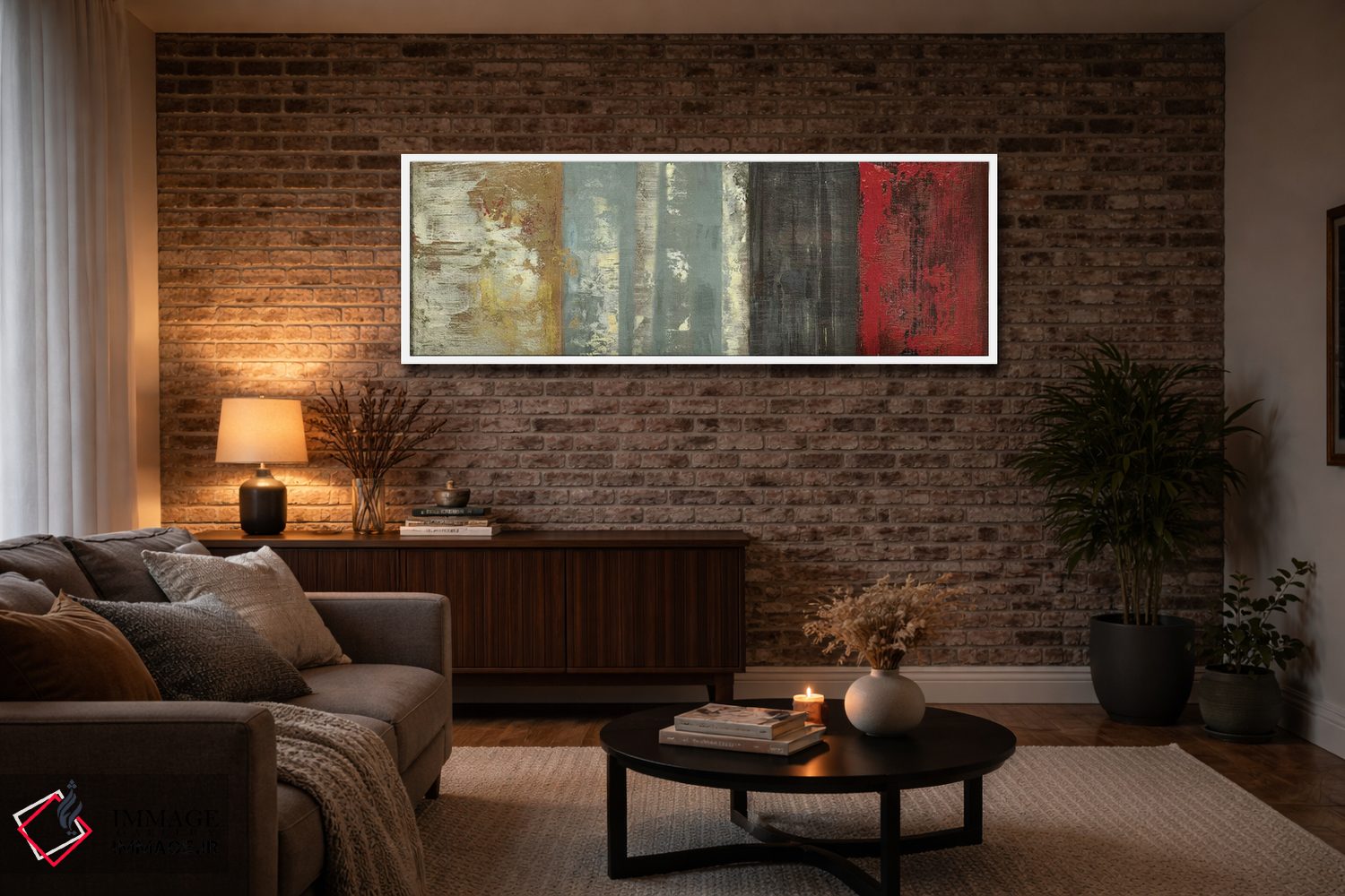 اگر دوست دارید هماهنگی کاملتر شود، رنگِ قرمز را در فرش یا پرده (بهصورت خیلی کم) هوشمندانه استفاده کنید تا پالت «جمعوجورتر» شود. انتخاب قاب هم میتواند بهخوبی این اکسنت را تقویت کند.