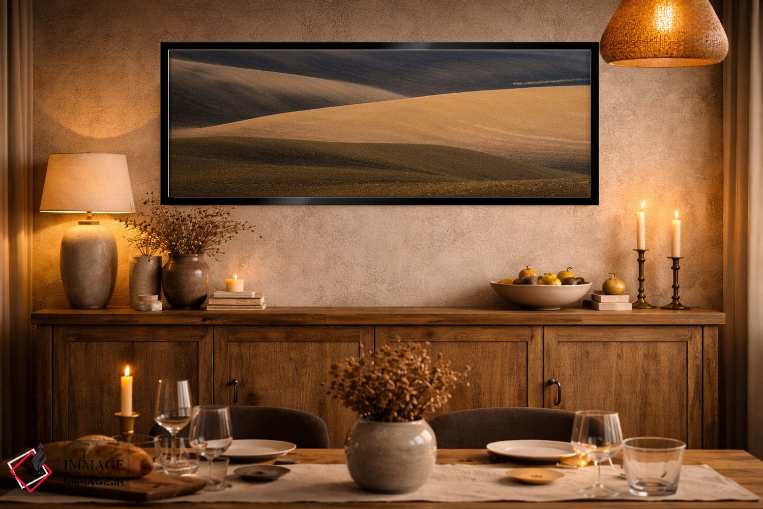 براساس پالت گرم اثر، قاب تیک گرم (چوبی) پیشنهاد اول است و مشکی مات (فریم متوسط) مکمل. برای سفارشهای پروژهای با ابعاد و قابهای اختصاصی با ایماژ در تماس باشید.