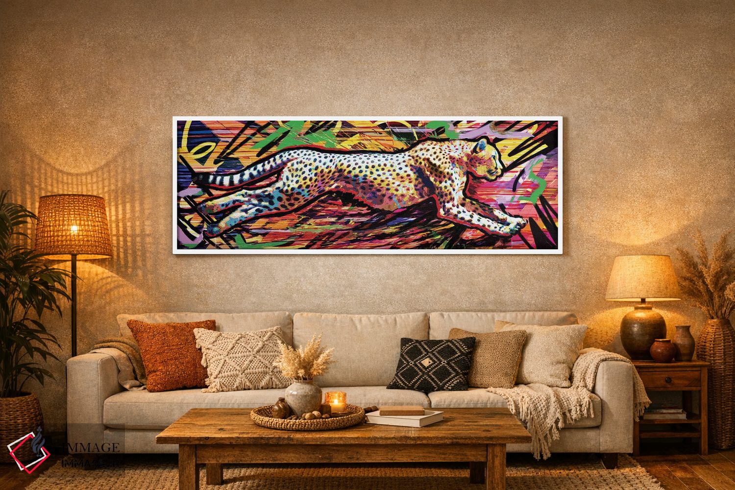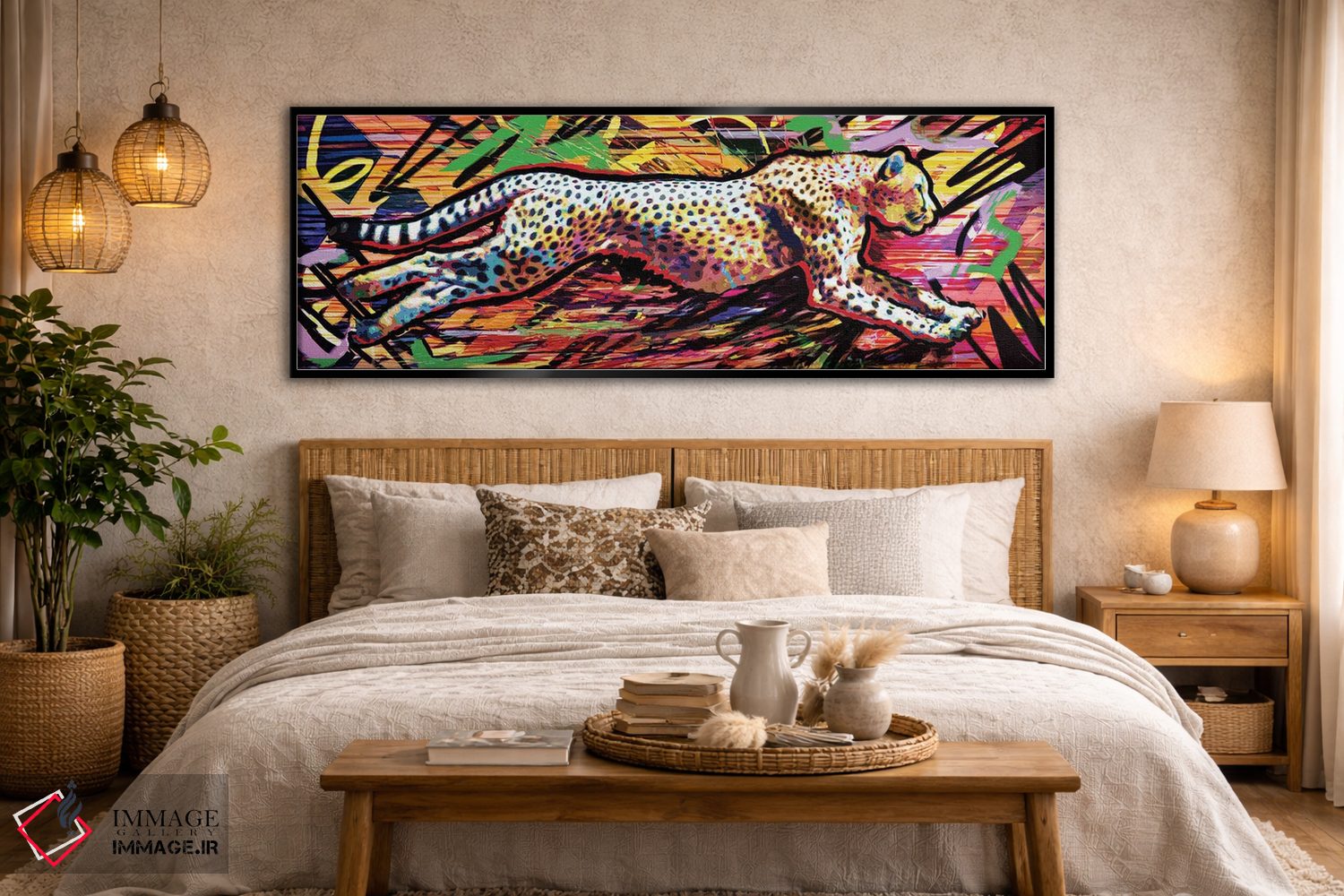 برای اتاقی که به یک عنصر دوستداشتنی نیاز دارد، «یوزپلنگ با سرعت ۹۰ مایل بر ساعت» اثرِ «راککروماتیک» بدون کودکانه شدن، بازیگوش و خوشپرداخت میماند؛ برای خانههایی با چوب و پارچههای گرم انتخابی خوشسلیقه است. در کنار گیاهان و نور طبیعی، جذابتر هم میشود.