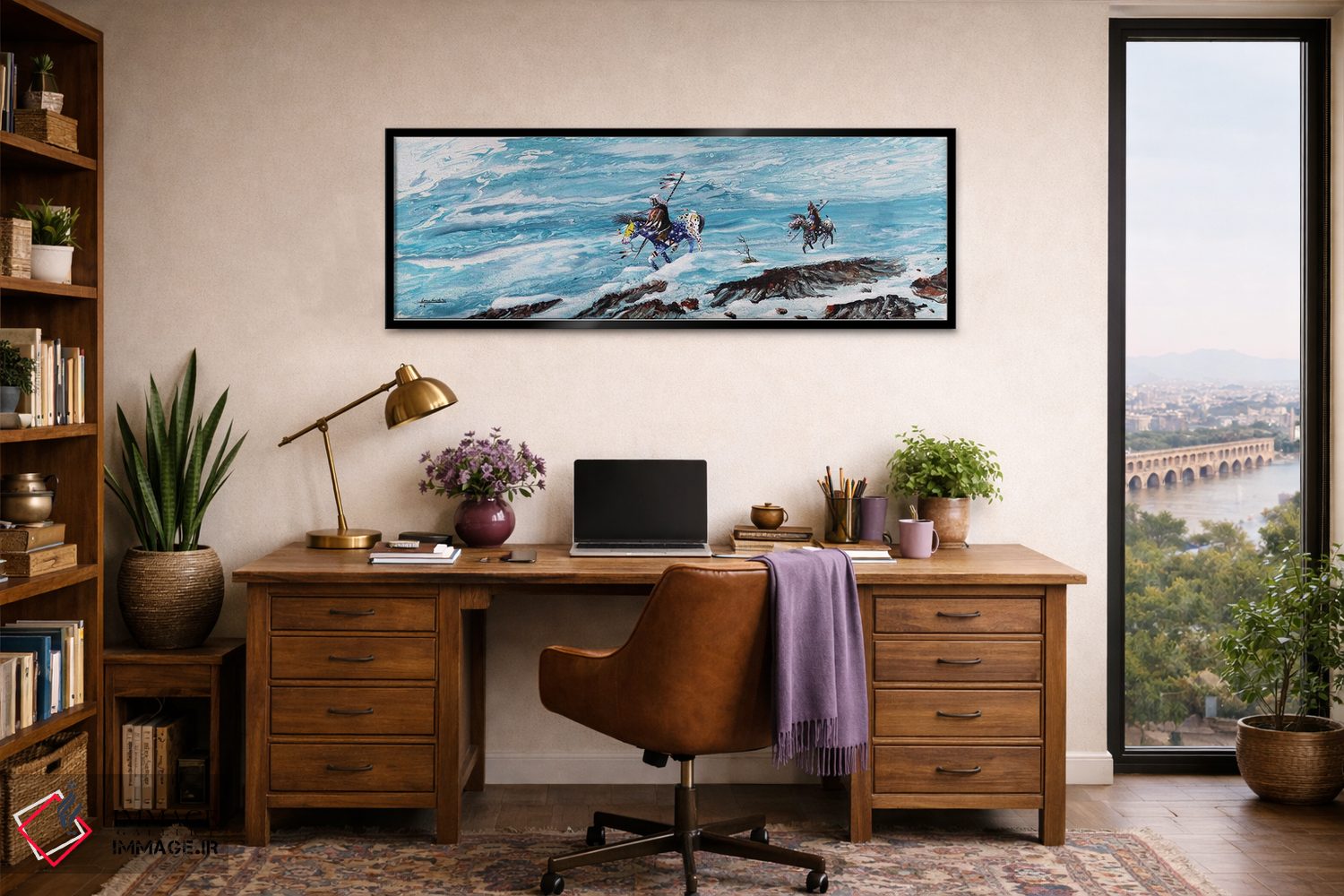 براساس پالت ترکیبی اثر، قاب تیک گرم (چوبی) پیشنهاد اول است و مشکی مات (فریم متوسط) مکمل. برای سفارشهای پروژهای با ابعاد و قابهای اختصاصی با ایماژ در تماس باشید.