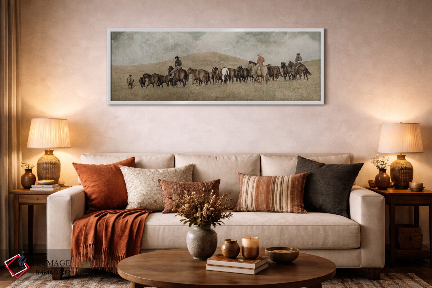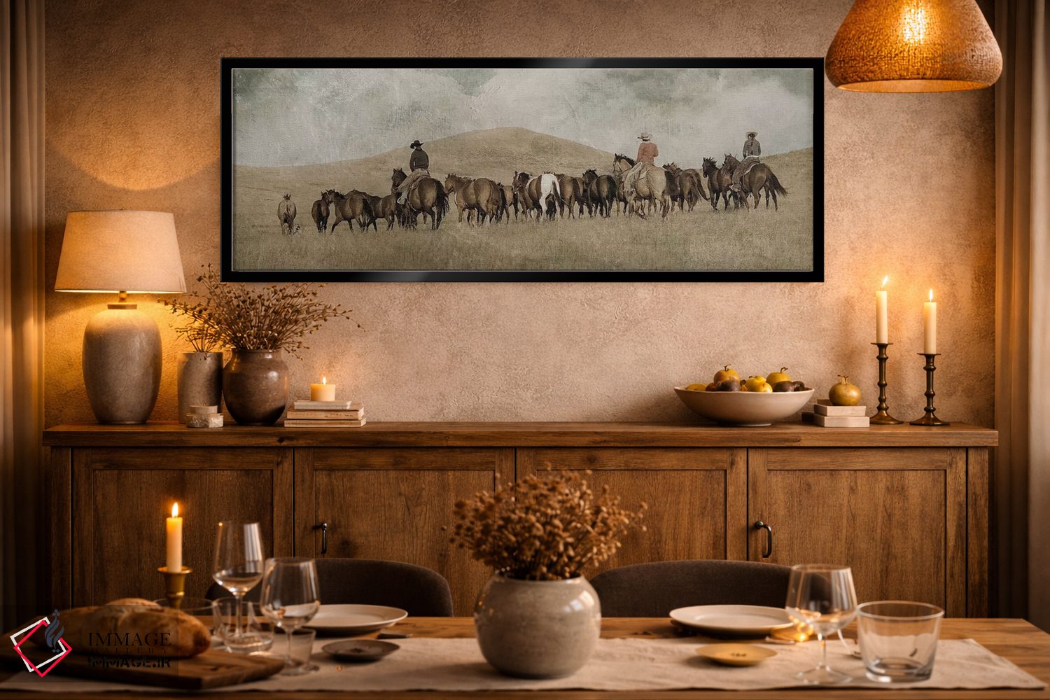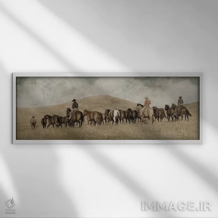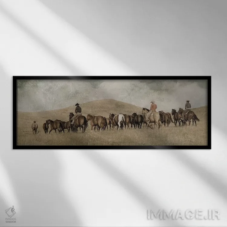 براساس پالت گرم اثر، قاب بلوط روشن (چوبی) پیشنهاد اول است و استخوانی ملایم مکمل. برای سفارشهای پروژهای با ابعاد و قابهای اختصاصی با ایماژ در تماس باشید.