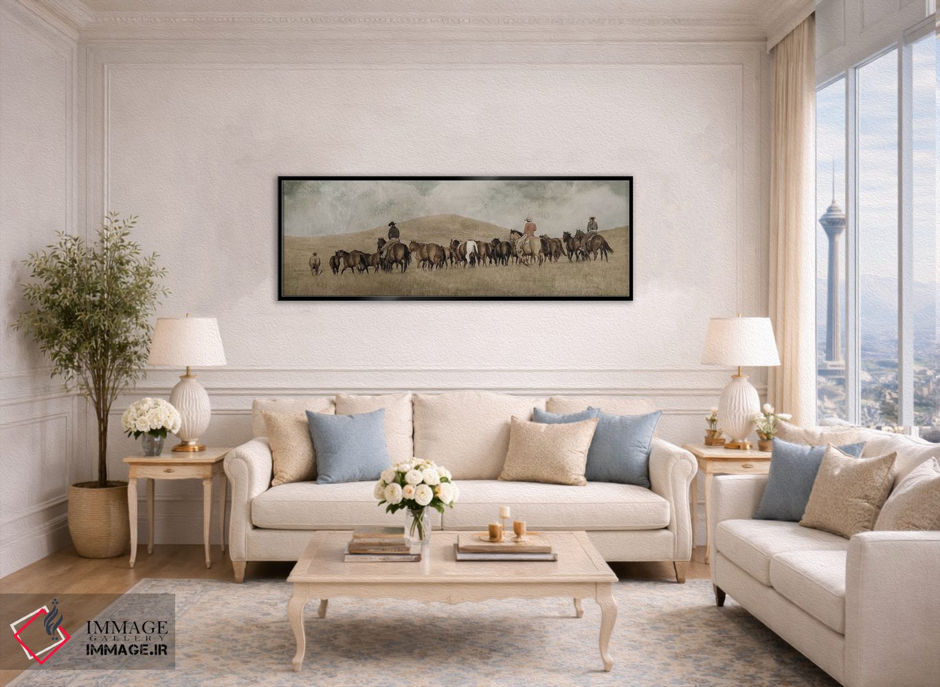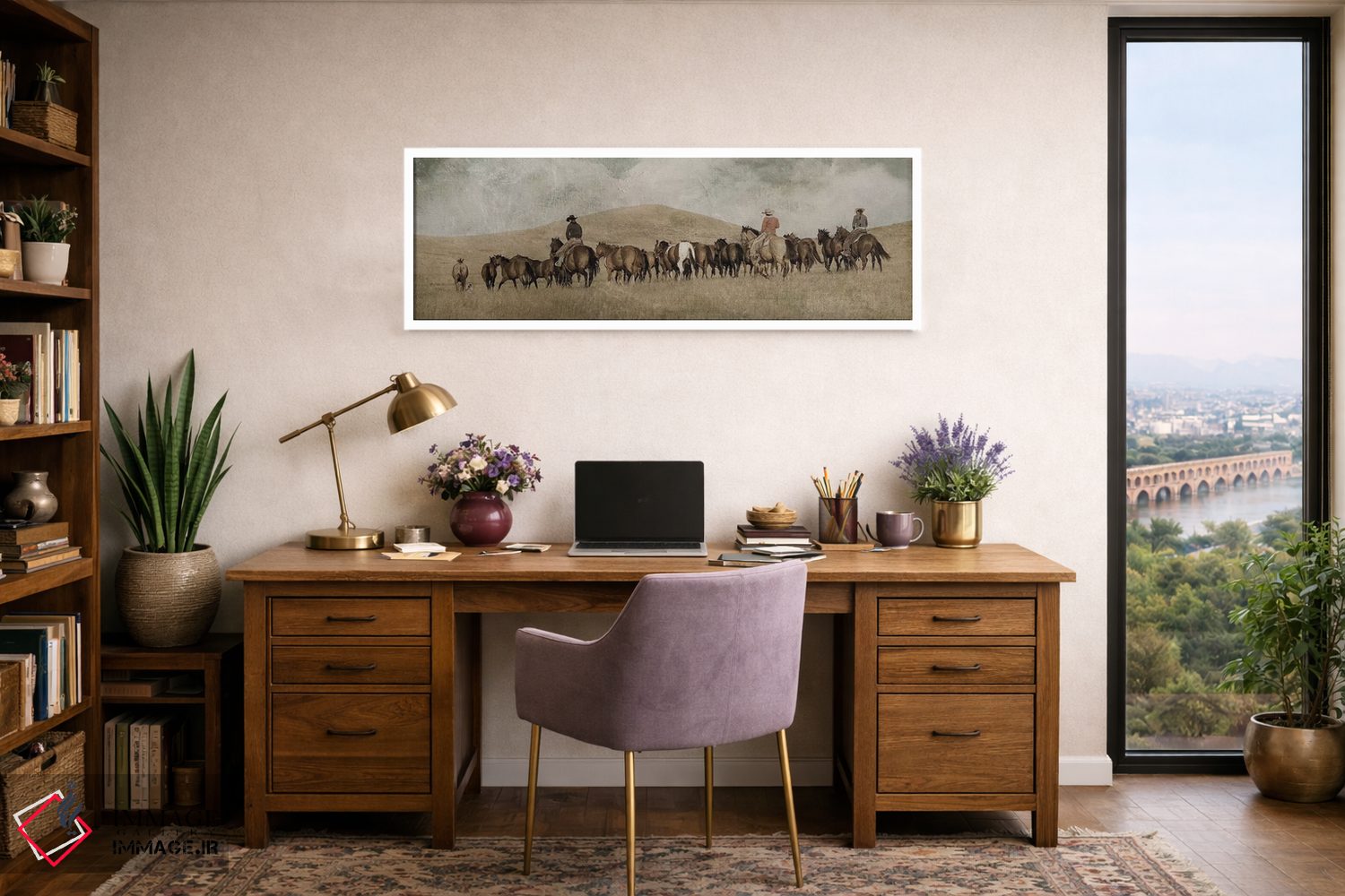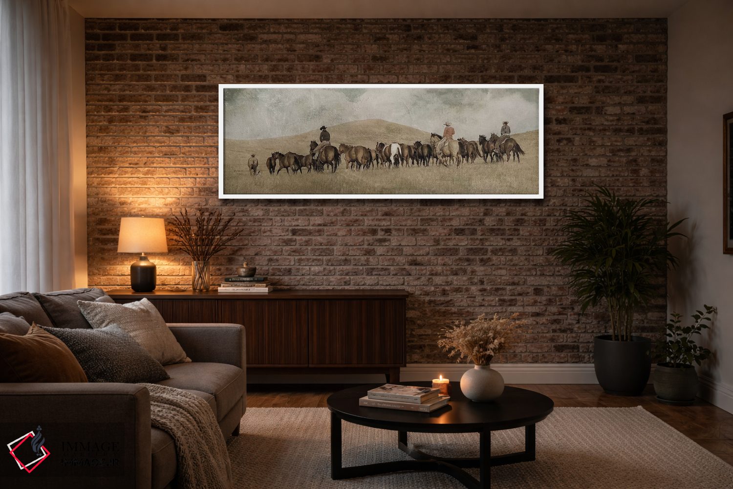 براساس پالت گرم اثر، قاب بلوط روشن (چوبی) پیشنهاد اول است و استخوانی ملایم مکمل. برای سفارشهای پروژهای با ابعاد و قابهای اختصاصی با ایماژ در تماس باشید.