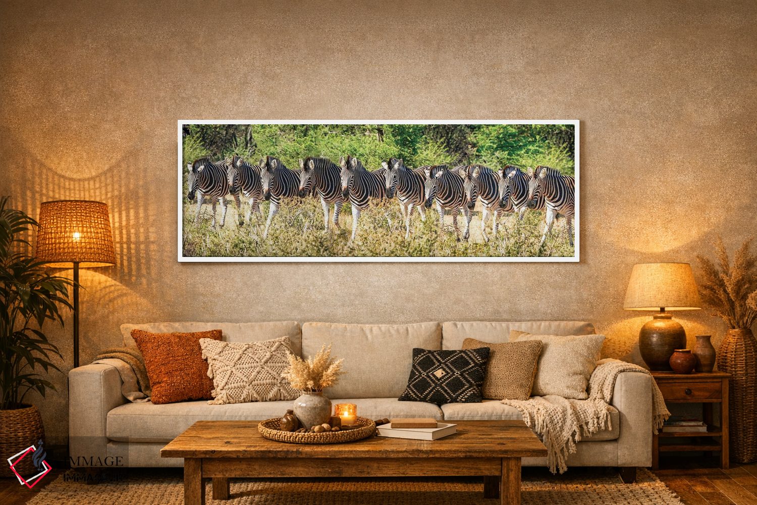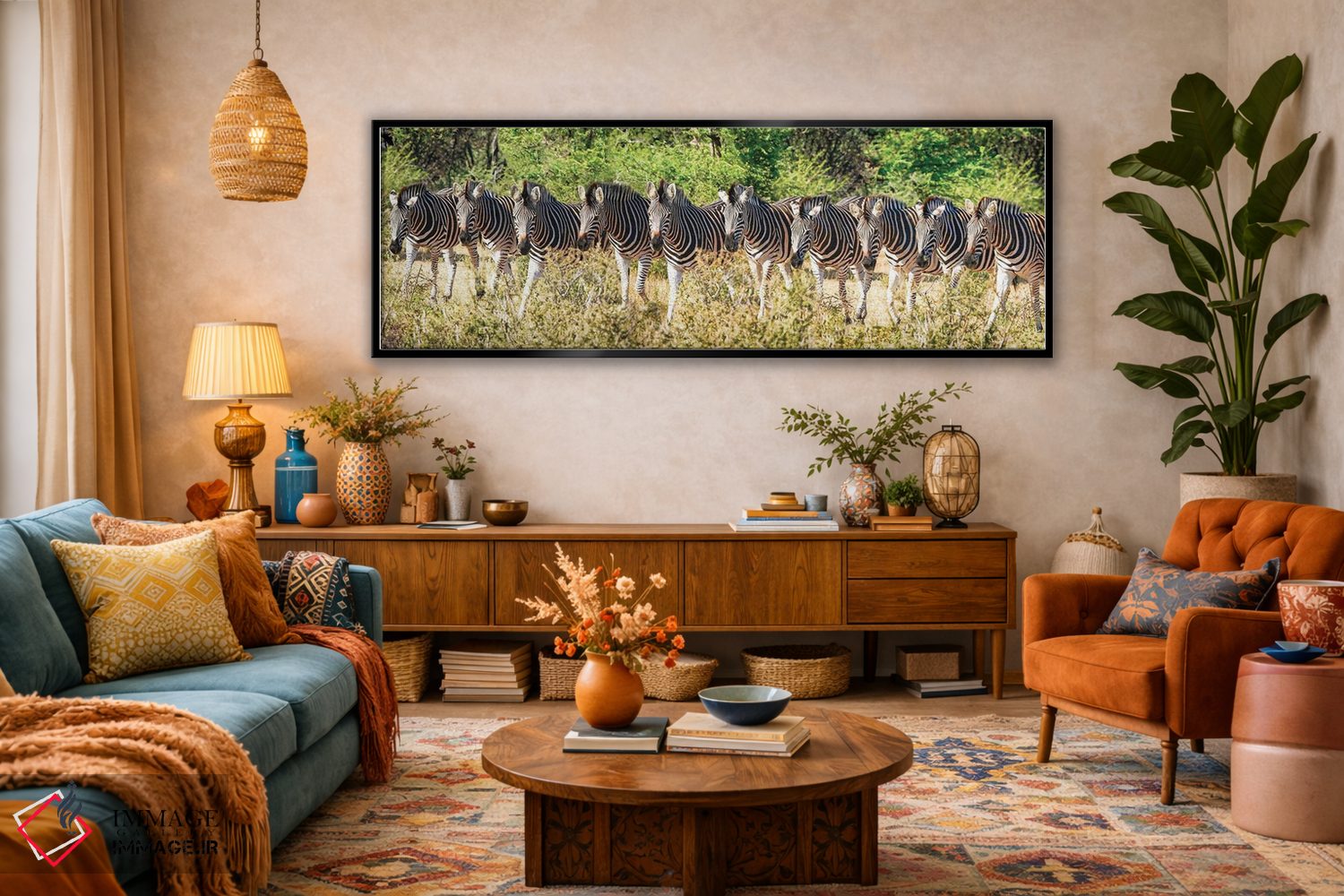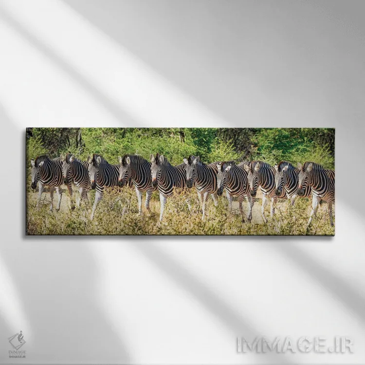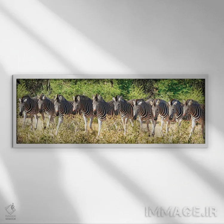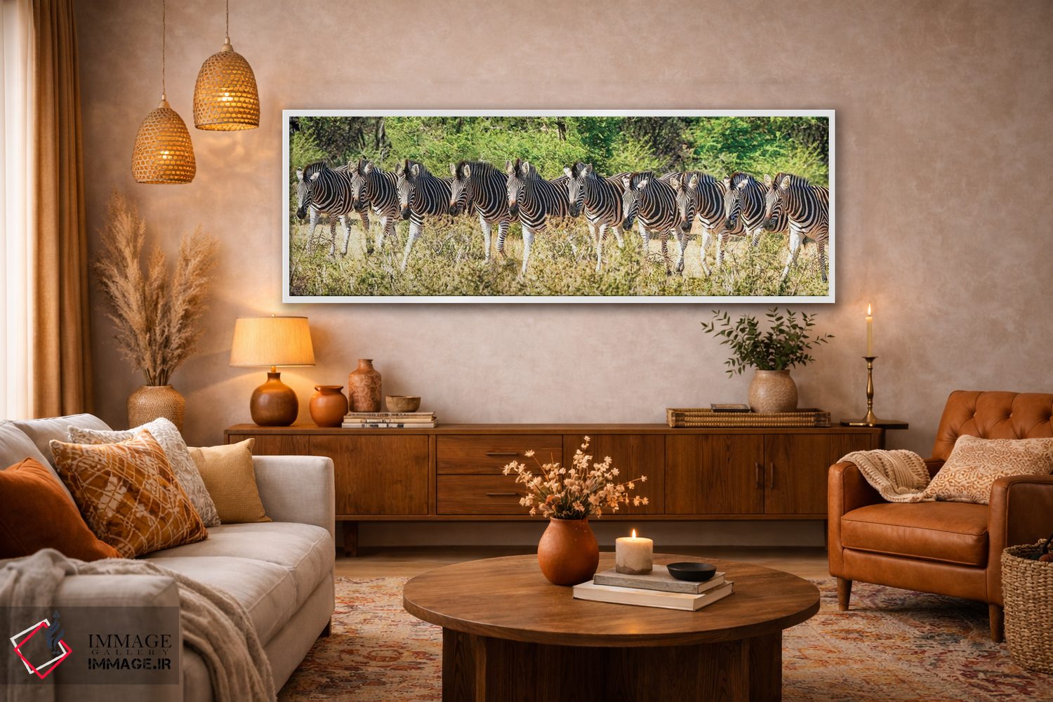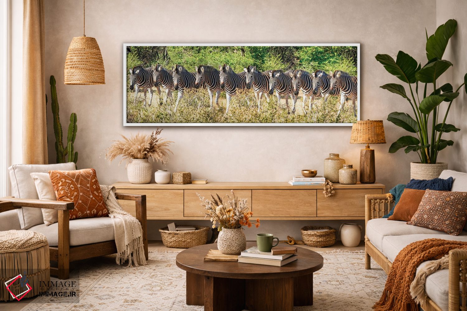 اگر به آثار حیوانات علاقه دارید، «خانواده گورخرهای آفریقایی» اثرِ «رندا تامپسون» گرما و شخصیت به فضا اضافه میکند، برای خانههایی با چوب و پارچههای گرم گزینهٔ مناسبیست. با قاب چوبی یا مشکی، حس مرتبتری پیدا میکند.