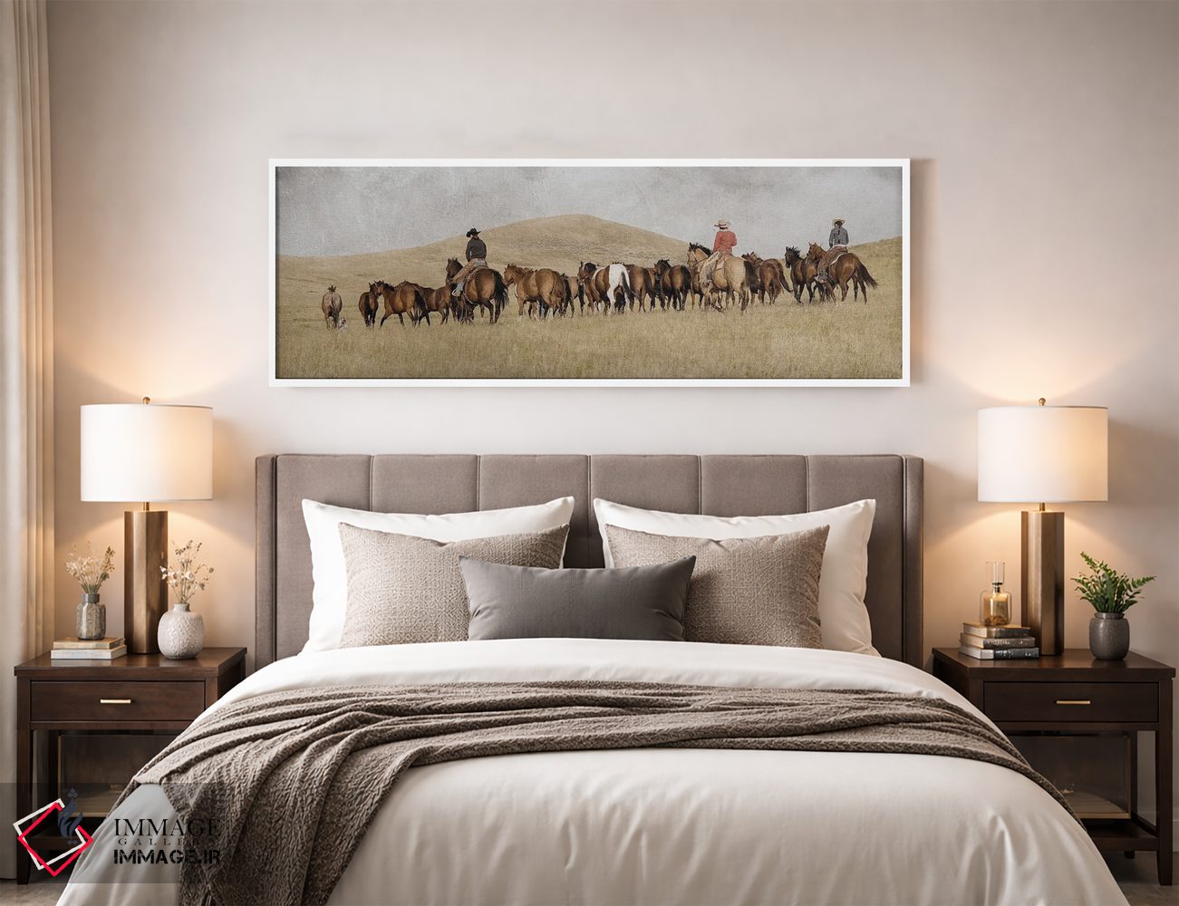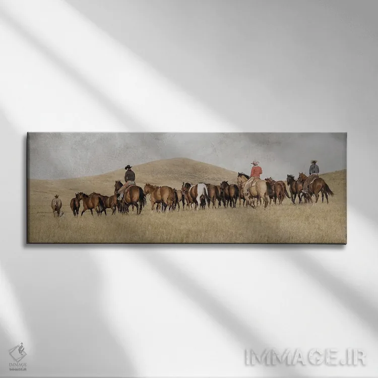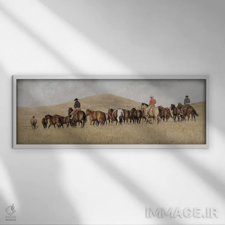 براساس پالت گرم اثر، قاب بلوط روشن (چوبی) پیشنهاد اول است و استخوانی ملایم مکمل. برای سفارشهای پروژهای با ابعاد و قابهای اختصاصی با ایماژ در تماس باشید.