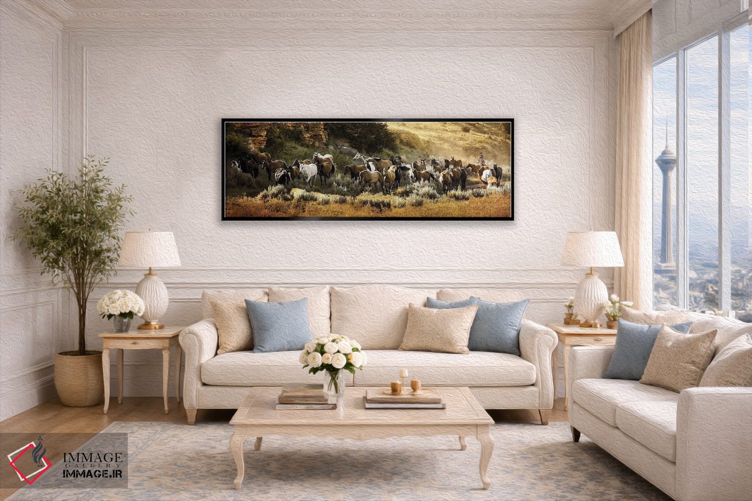 اگر میخواهید دیوار کمی سرزندگیِ محترمانه داشته باشد، «محاصره دره» اثرِ «رندا تامپسون» گرما و شخصیت به فضا اضافه میکند، برای نشیمنهای خانوادگی گزینهٔ مناسبیست. به دیوار، قصه میدهد—اما قصهای آرام و شیک.