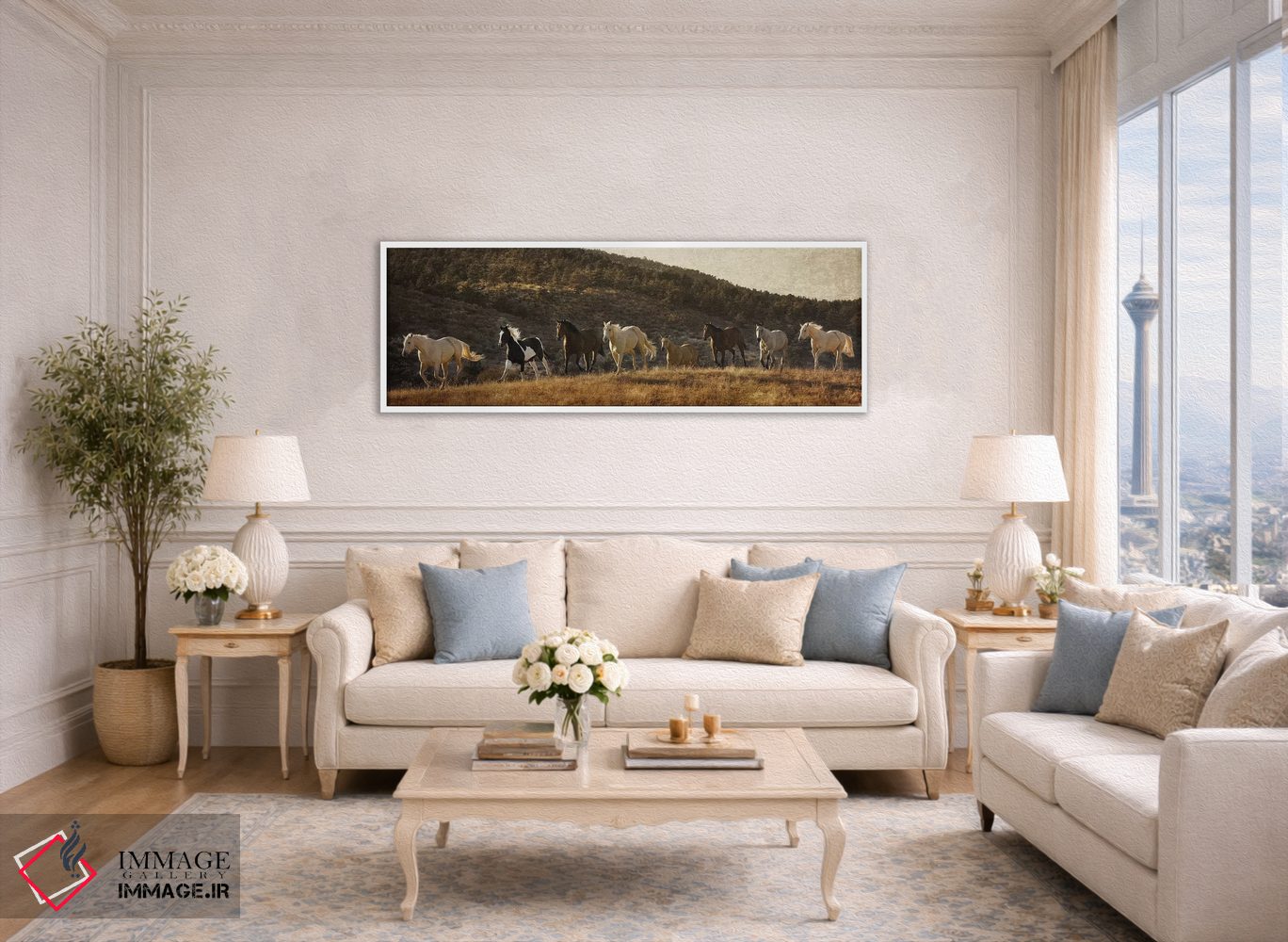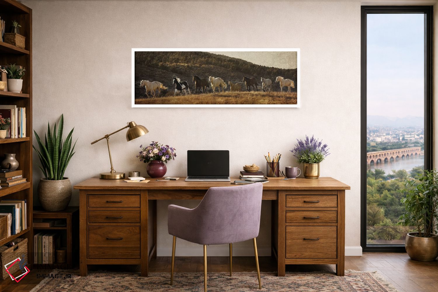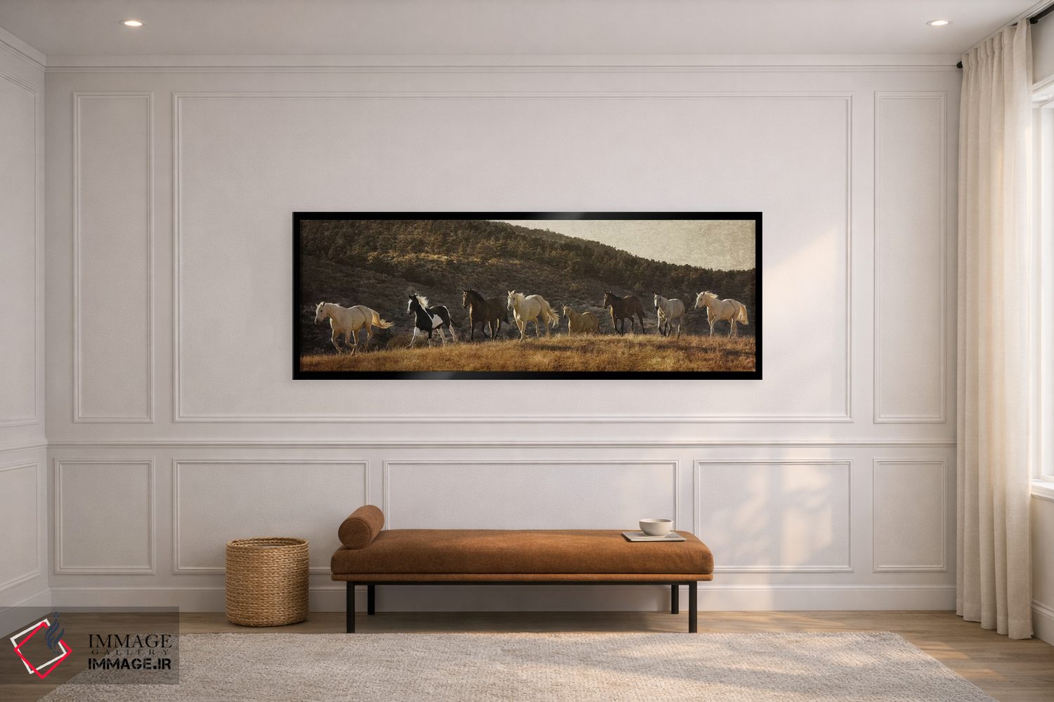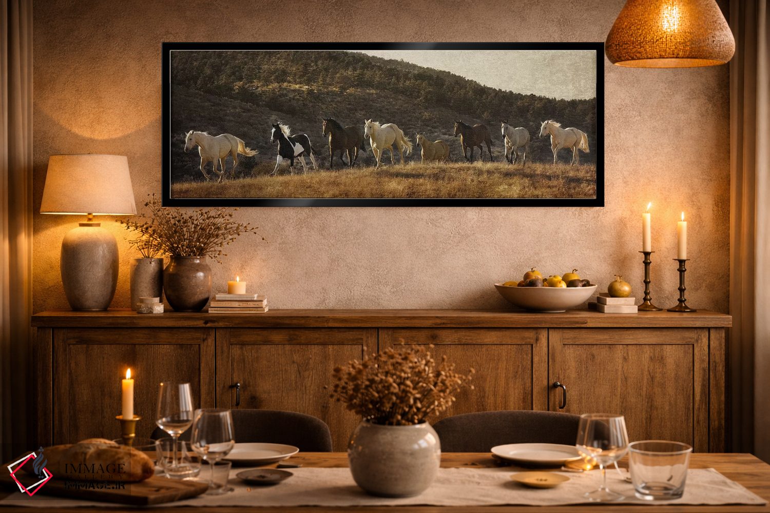 براساس پالت گرم اثر، قاب بلوط روشن (چوبی) پیشنهاد اول است و استخوانی ملایم مکمل. برای سفارشهای پروژهای با ابعاد و قابهای اختصاصی با ایماژ در تماس باشید.