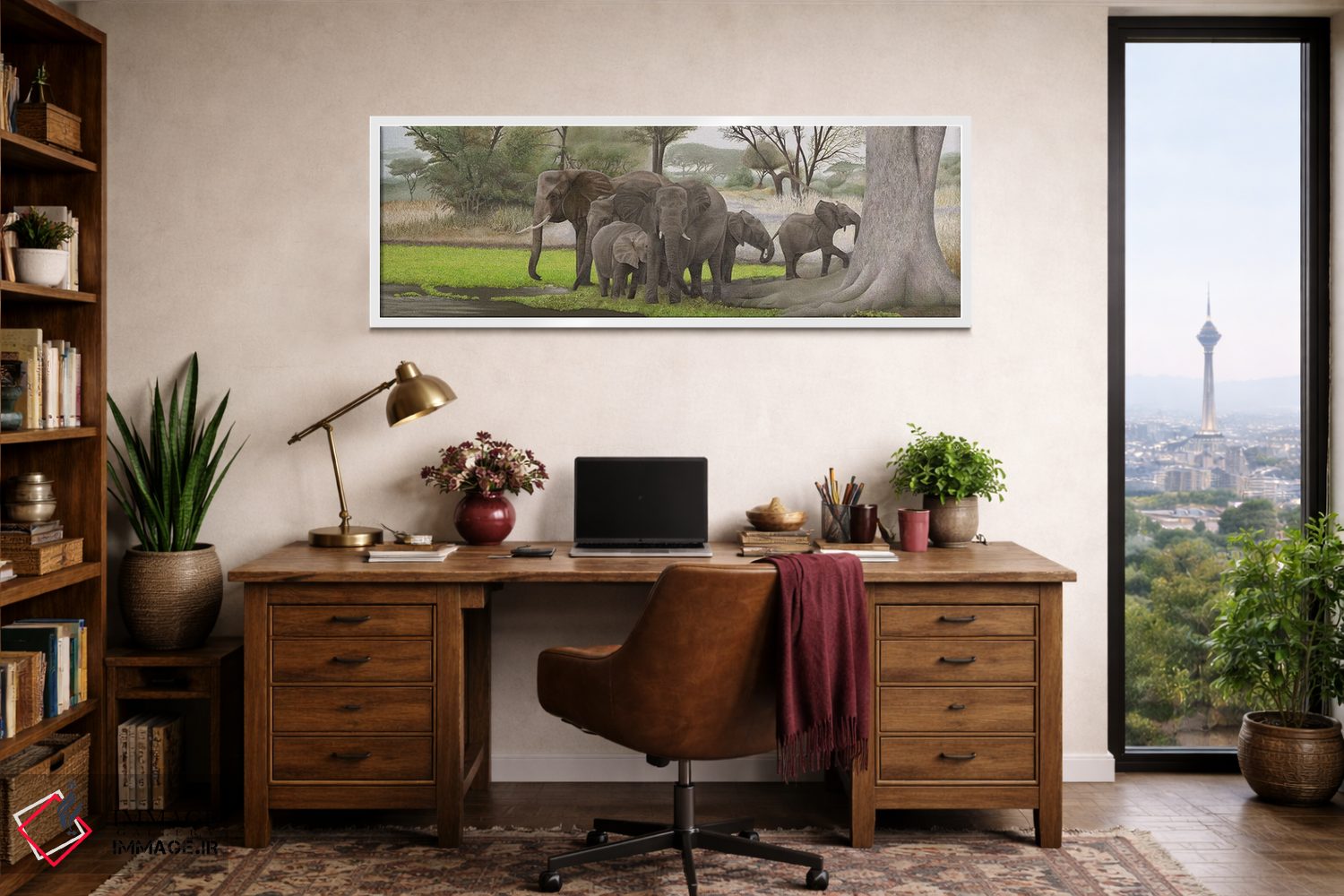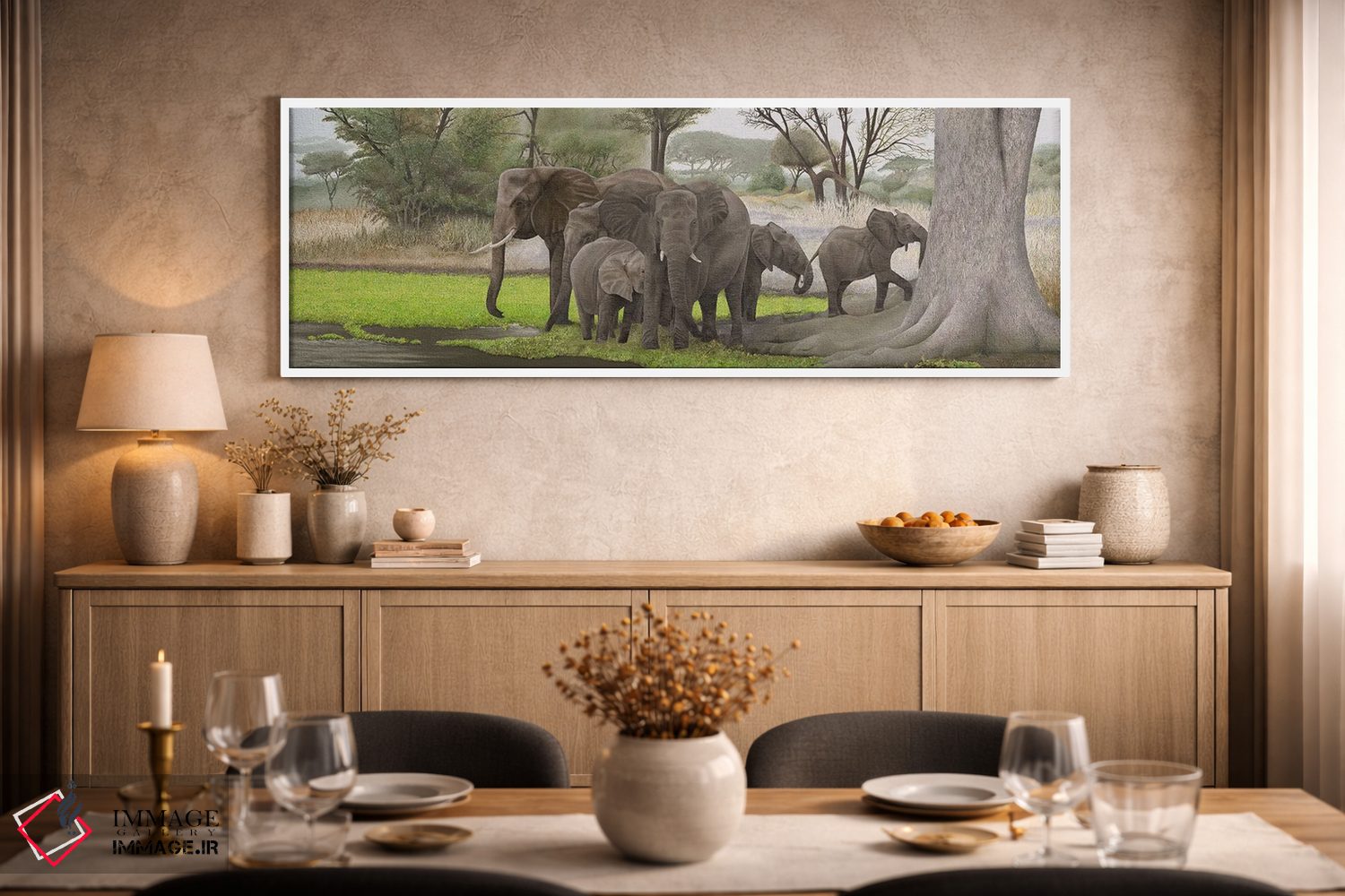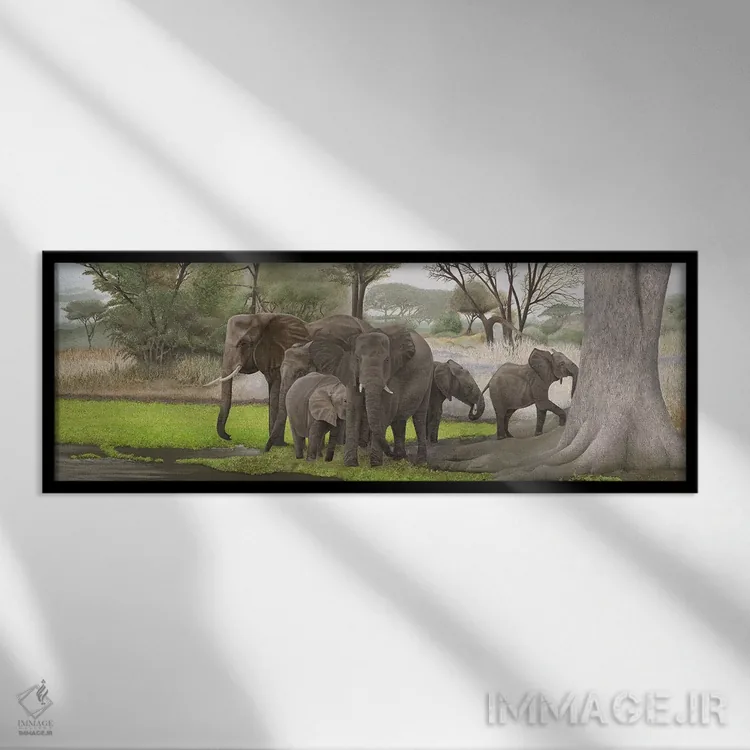 «فیلها در سایه» اثرِ «راسل هینکلی» از آن کارهاییست که بافت و جزئیات را طوری نشان میدهد که نگاه میماند؛ برای اتاق کودک (بدون لحن کودکانه) انتخاب خوبیست. هم فضا را گرم میکند، هم شلوغش نمیکند.