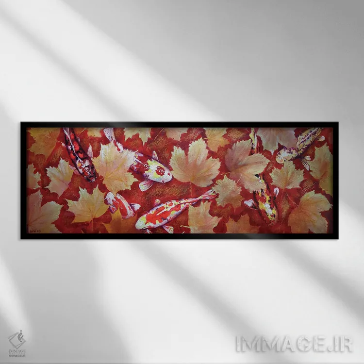 تابلو دکوراتیو برگ های زرد و ماهی کوی رنگارنگ در استخر با کف قرمز اثر راخمت ردژپوف